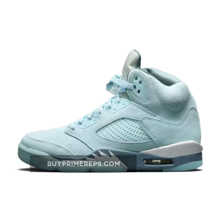 The familiar silhouette of the Air Jordan 5 remains intact, featuring the signature mesh netting, molded TPU eyelets, and clear quarter panel netting. The tongue boasts a reflective finish, mirroring the silver shark tooth detailing on the midsole. Completing the look is an icy blue translucent outsole with a herringbone traction pattern for ultimate grip.