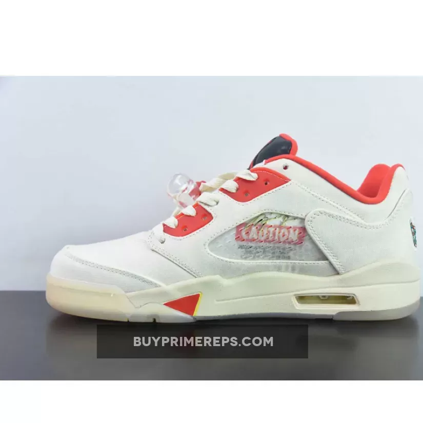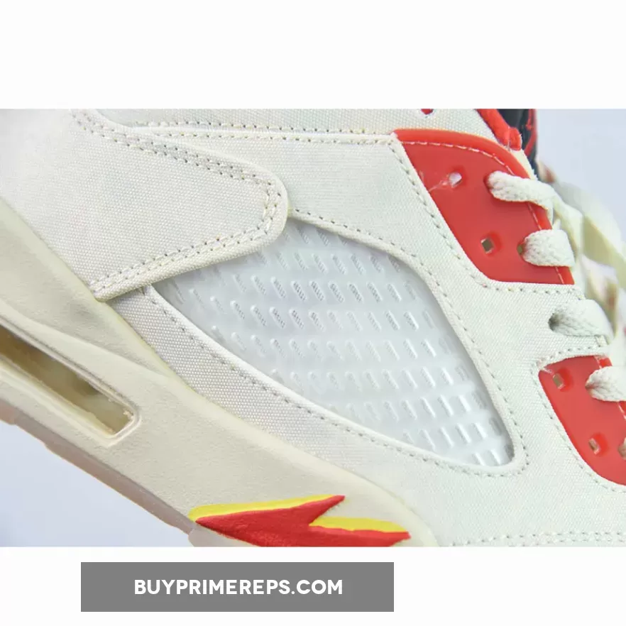 The upper of the Air Jordan 5 Retro Low “Chinese New Year” is constructed with a tear-away textile material in a clean Sail colorway. This tear-away feature adds an element of surprise to the sneaker, as once the top layer is removed, it reveals a colorful firecracker pattern on the base. This pattern represents the festive atmosphere and excitement of the Chinese New Year celebrations.
