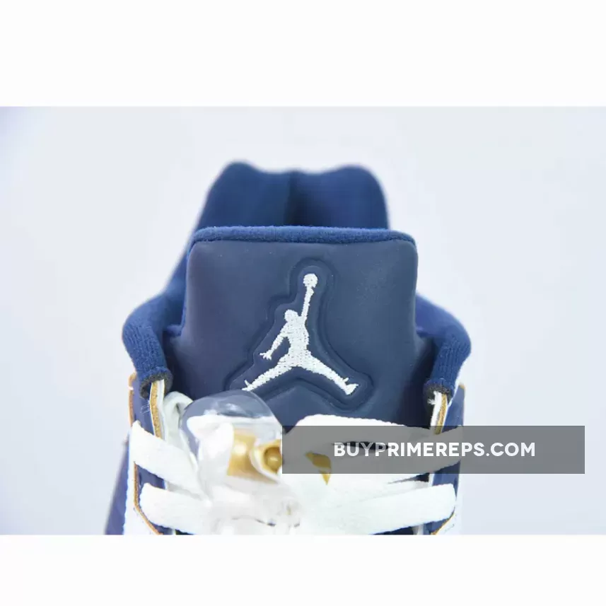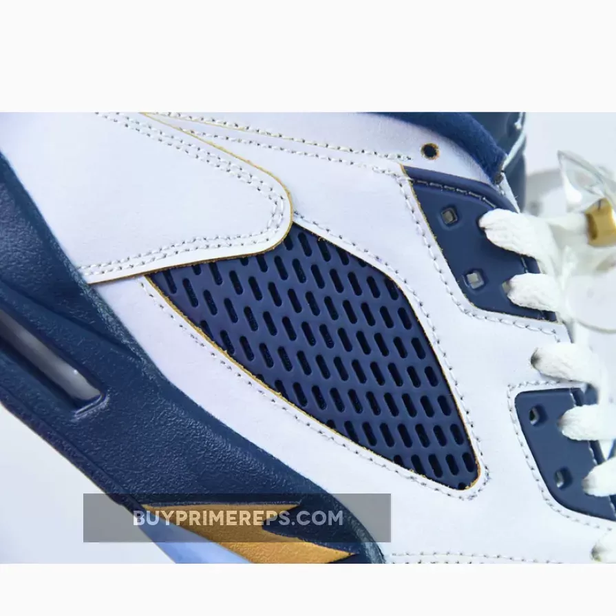 Adding a touch of luxury to the shoe, metallic gold accents can be seen on the lace lock and sole region. These gold details add a pop of color and sophistication to the overall design. Additionally, midnight navy hits are strategically placed throughout the shoe, creating a nice contrast against the white base.