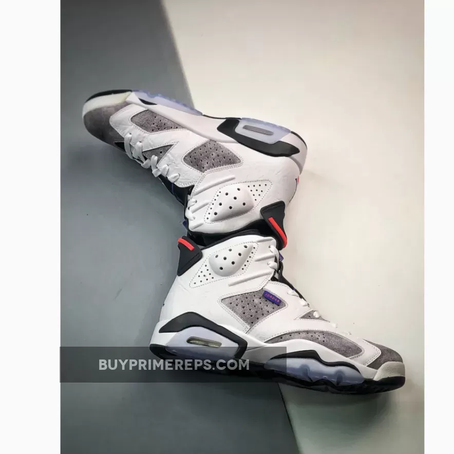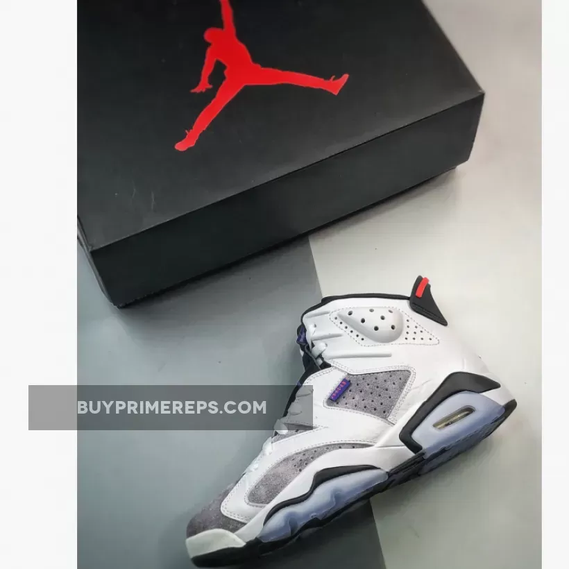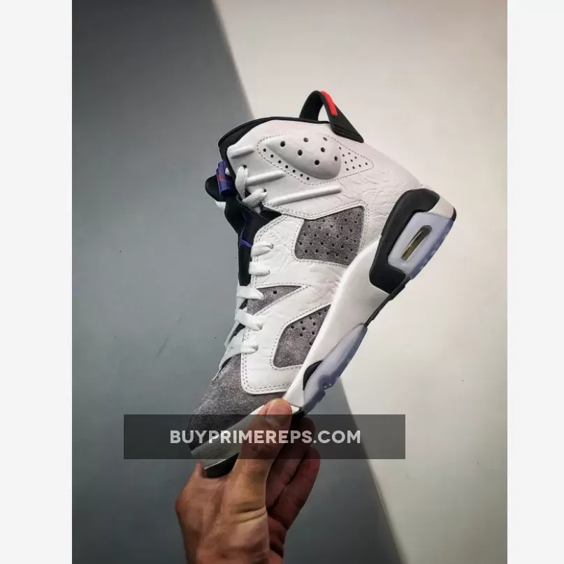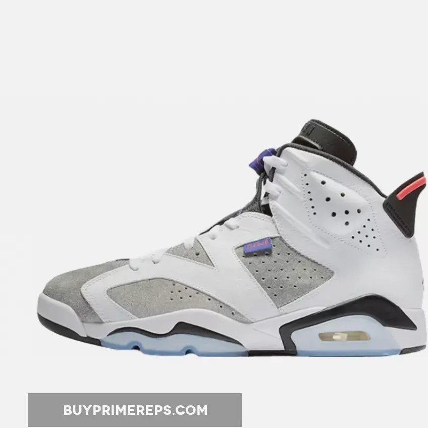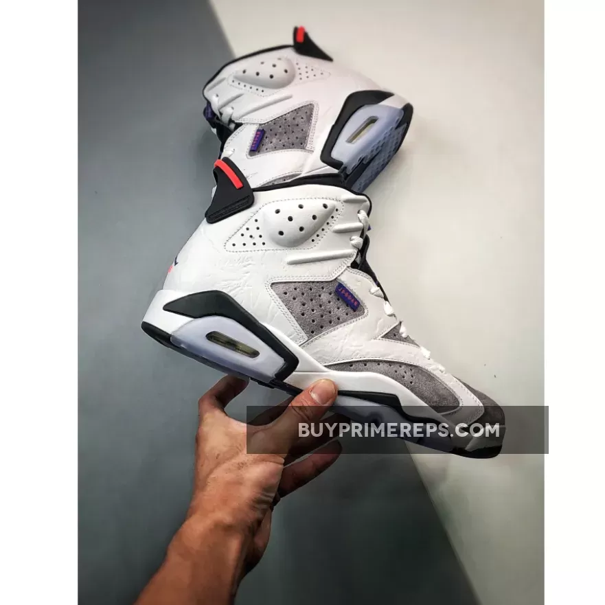 One of the standout features of the Air Jordan 6 Flint Grey is the use of vibrant pops of color. The Infrared 23 and Dark Concord accents on the heel and branding provide a striking contrast to the predominantly white and grey upper. This color combination adds a unique and eye-catching element to the shoe, making it stand out from other Jordan 6 releases.