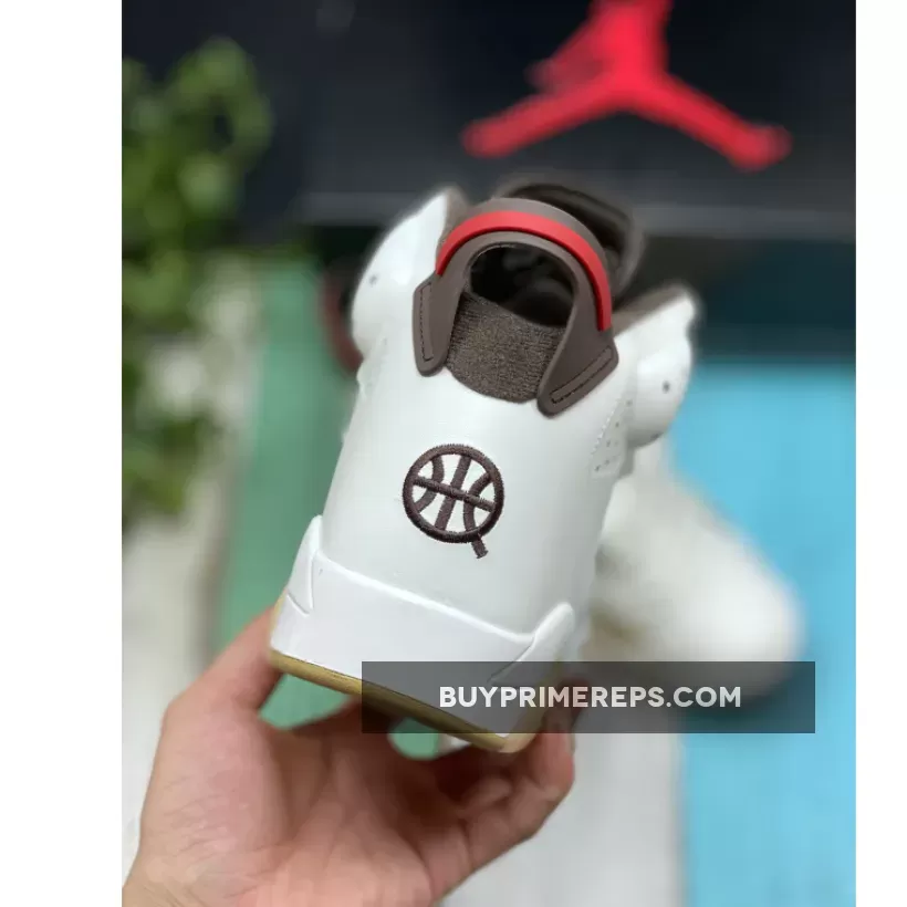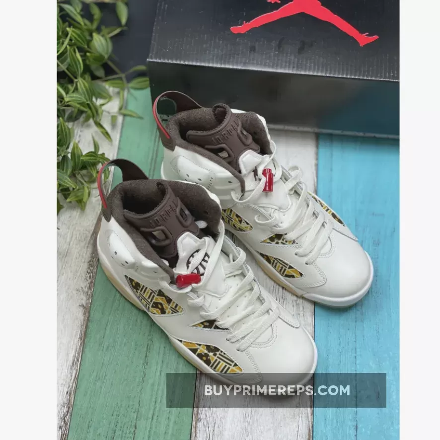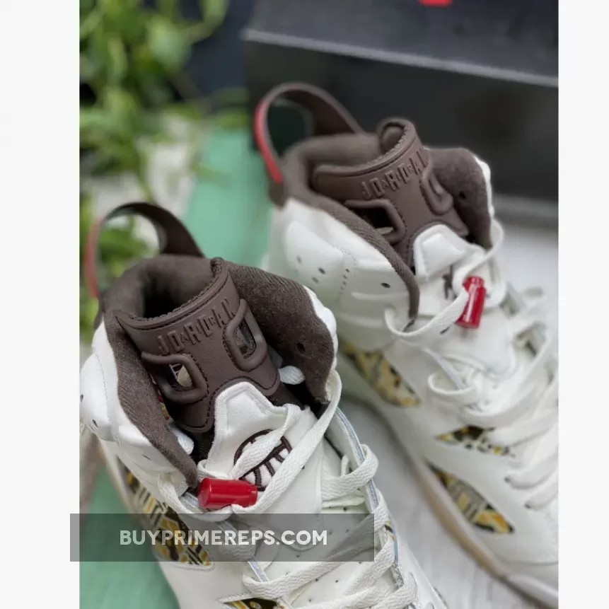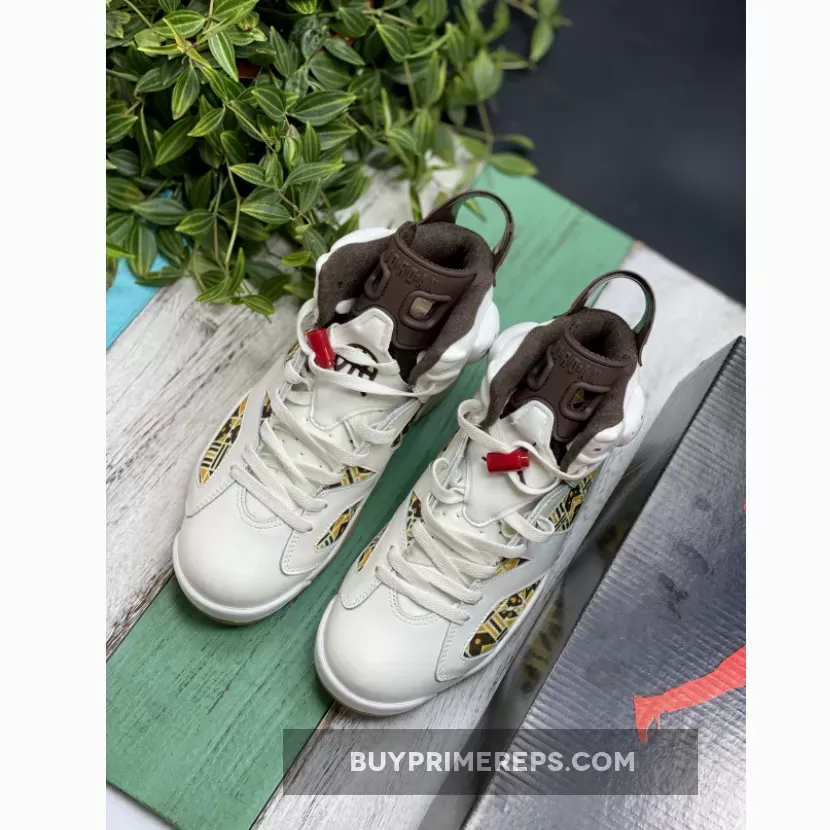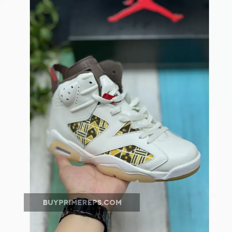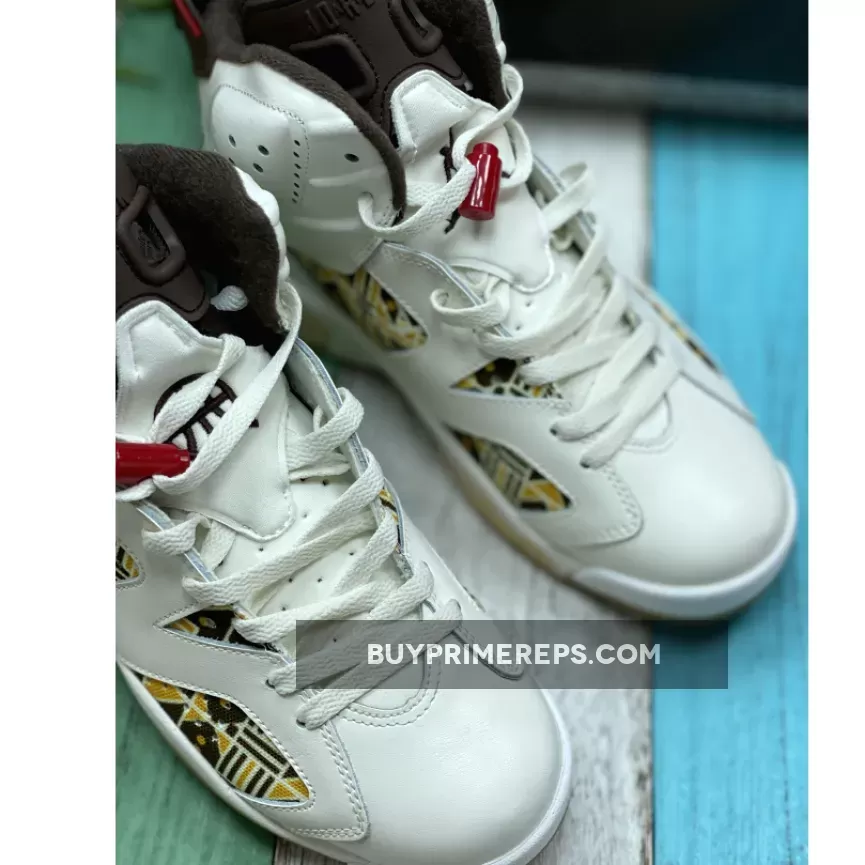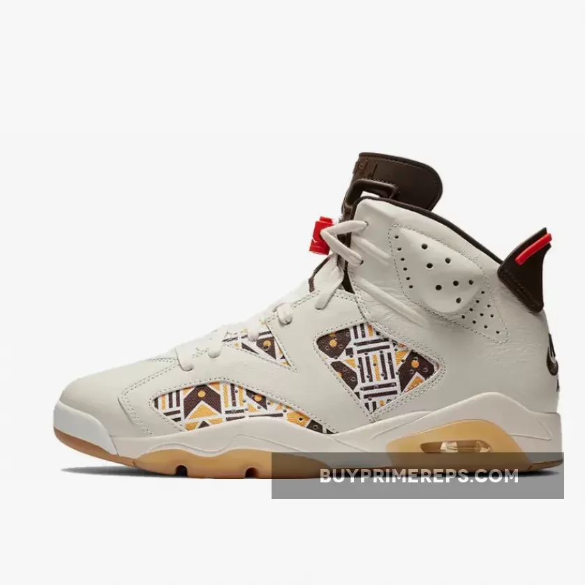 Crafted from a combination of premium leather, suede, and synthetic materials, the uppers of the Air Jordan 6 “Quai 54” boast a color-blocked look. The color palette includes sail, baroque brown, team orange, total orange, and black, creating a visually appealing and well-balanced aesthetic. The use of different materials adds depth and texture to the shoe, enhancing its overall appeal.