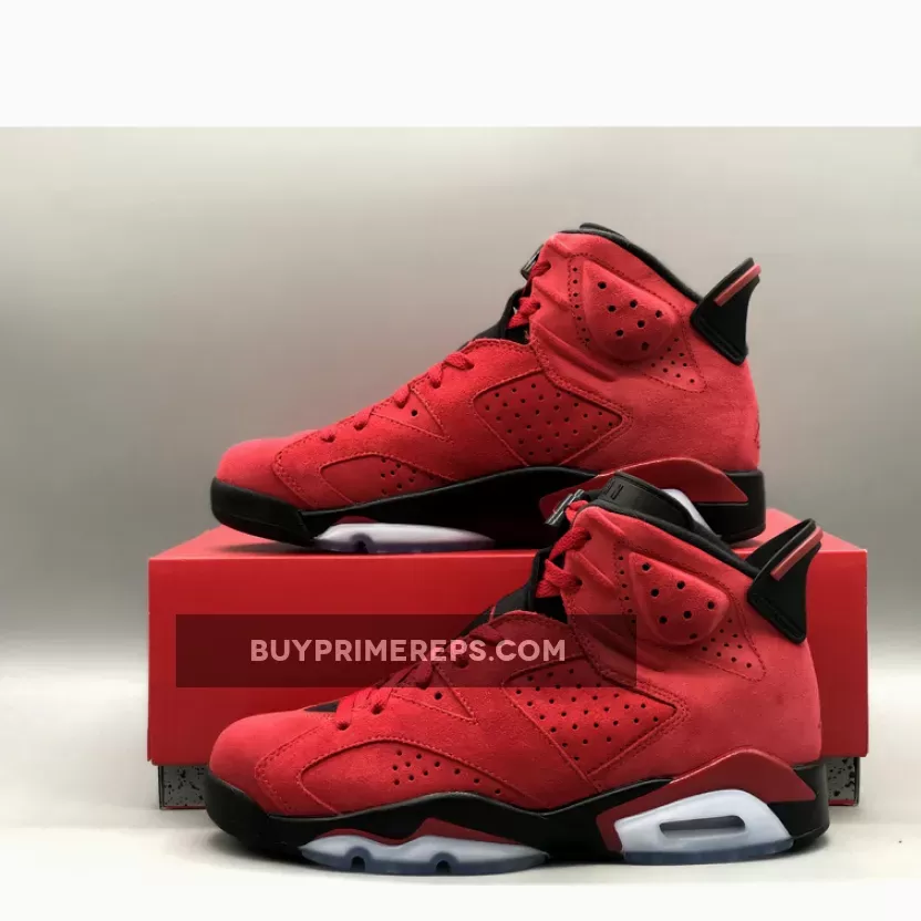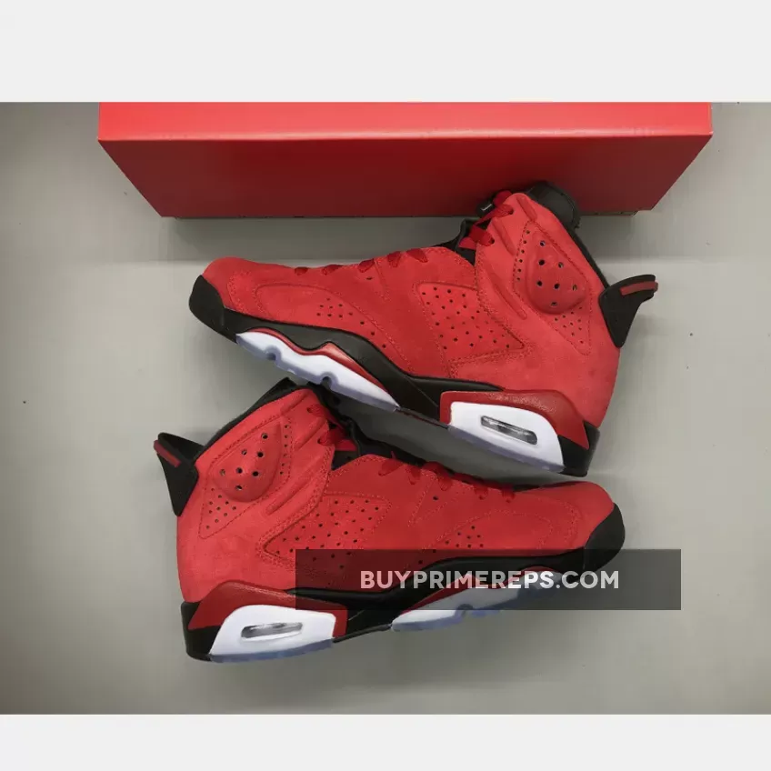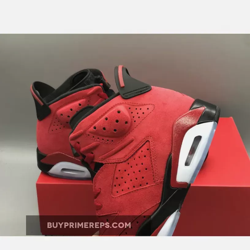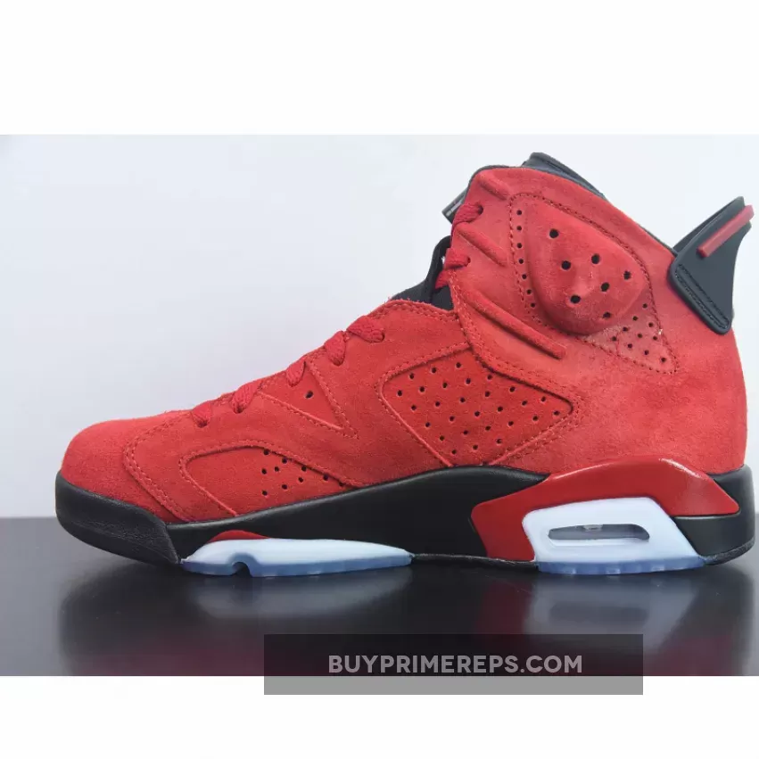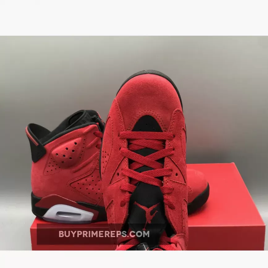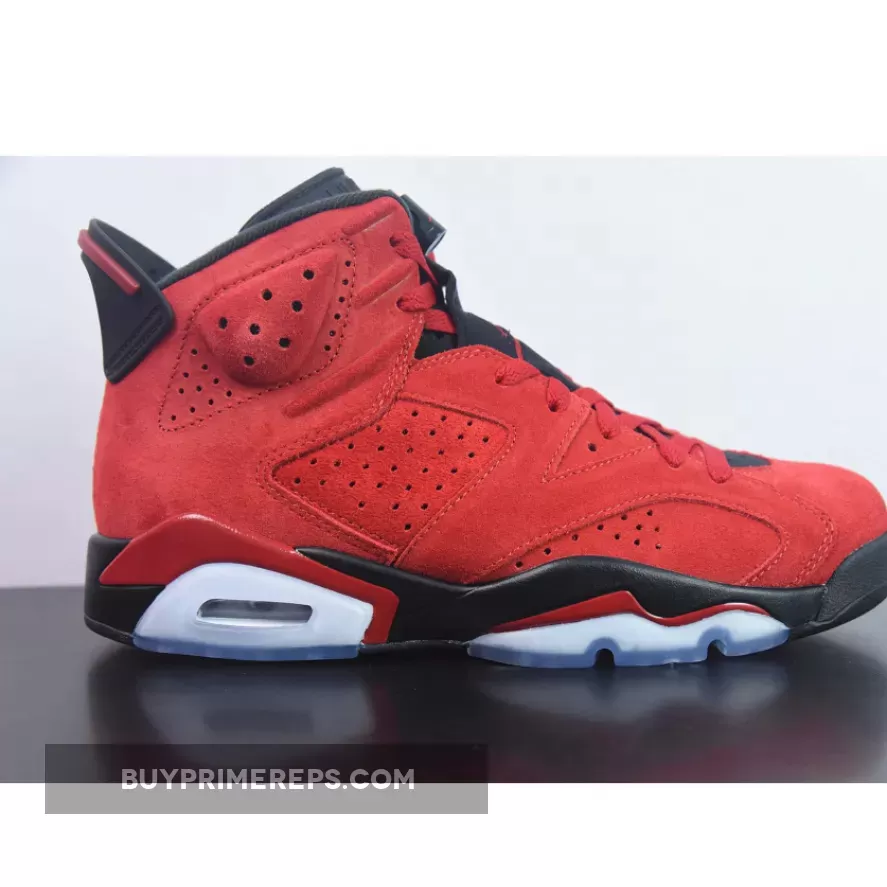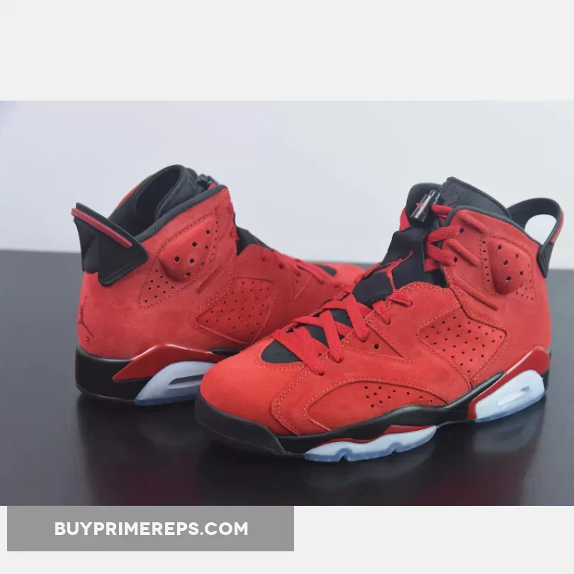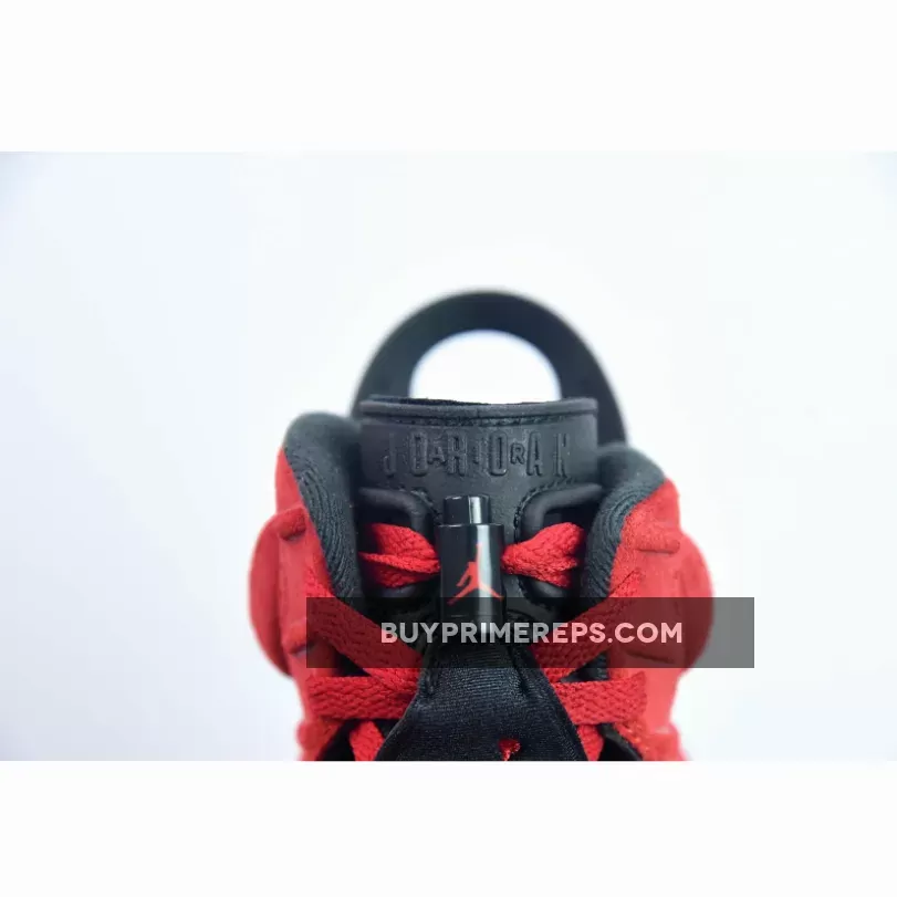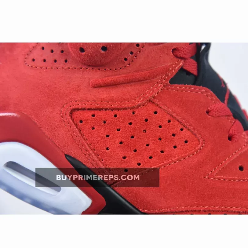 The upper of the Air Jordan 6 “Toro Bravo” is crafted from luxurious red suede, giving the shoe a premium look and feel. The vibrant red hue covers the entire upper, creating a striking visual impact. Black accents are present on the tongues, heel tabs, and midsole, adding a touch of contrast and depth to the design. This combination of red and black creates a classic colorway that is sure to turn heads and make a statement.