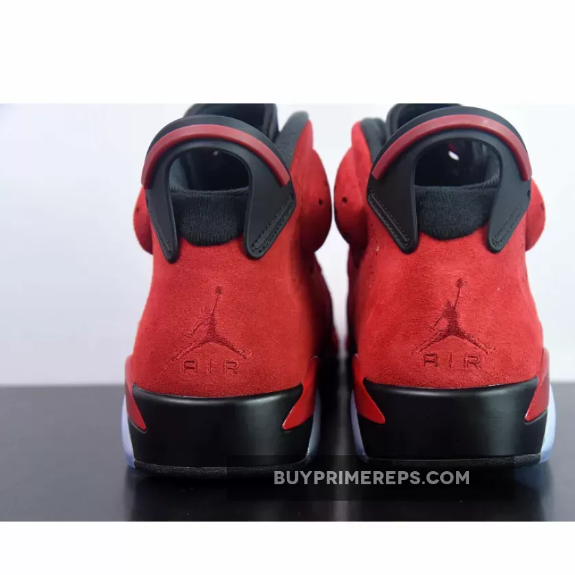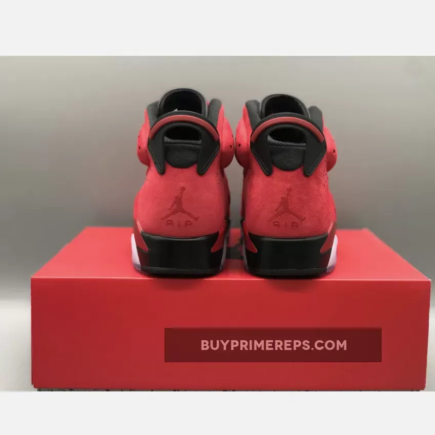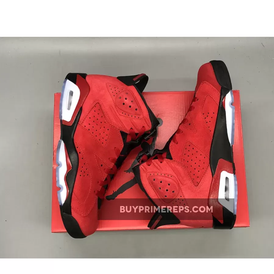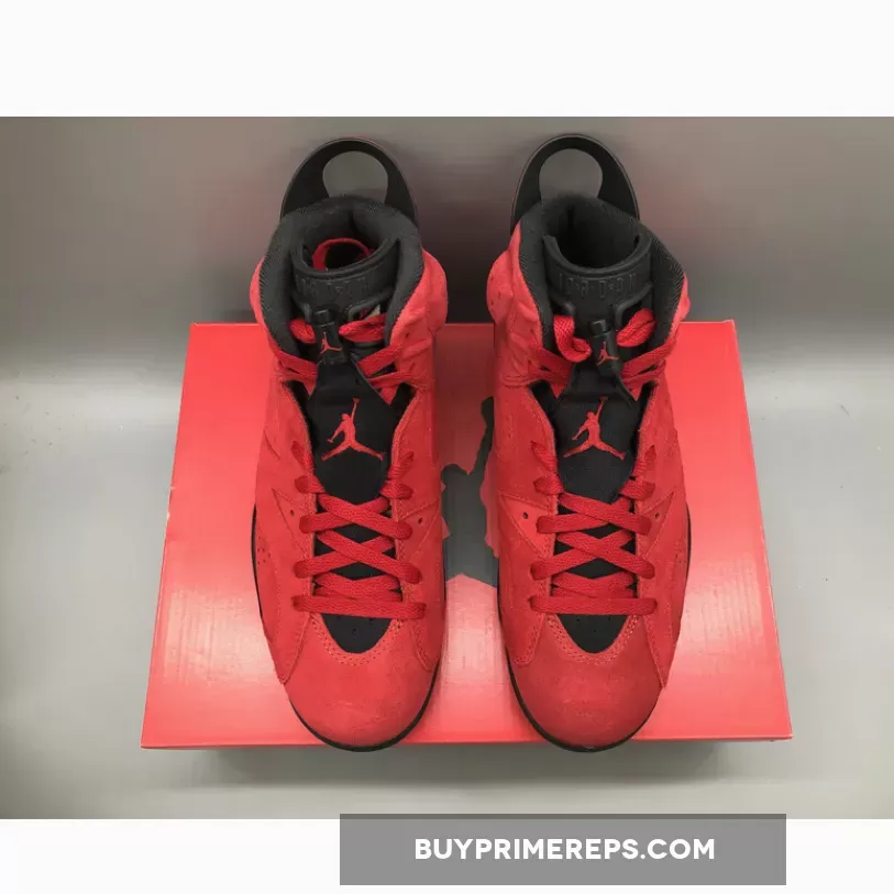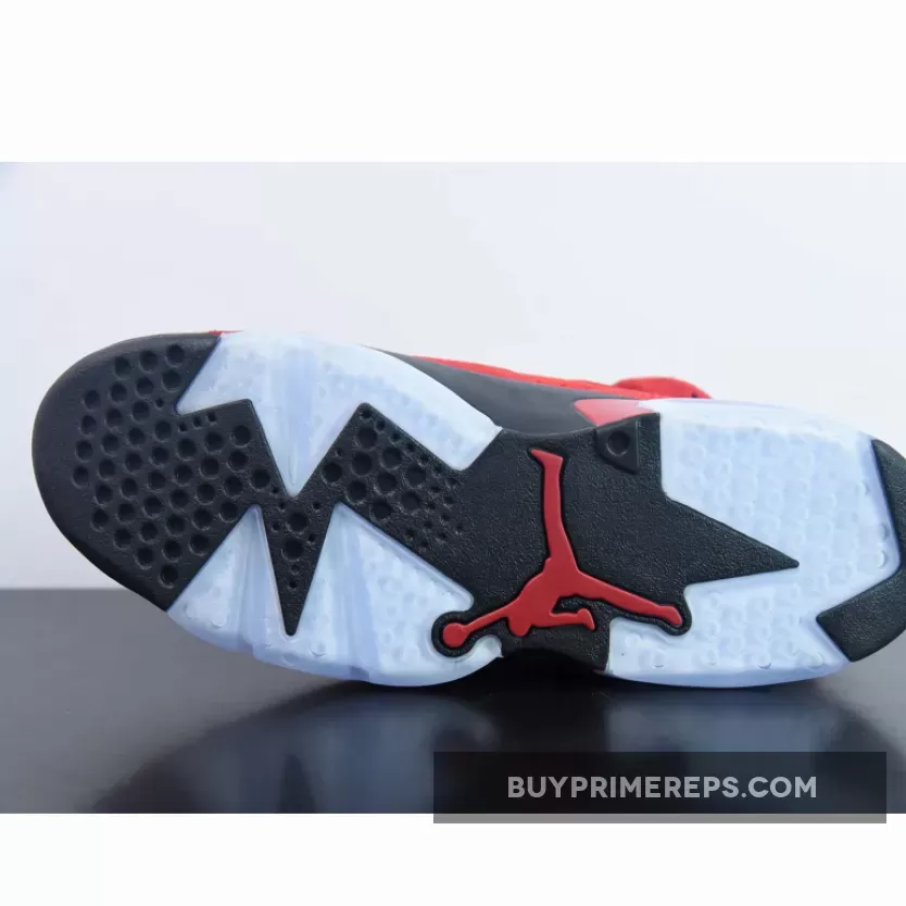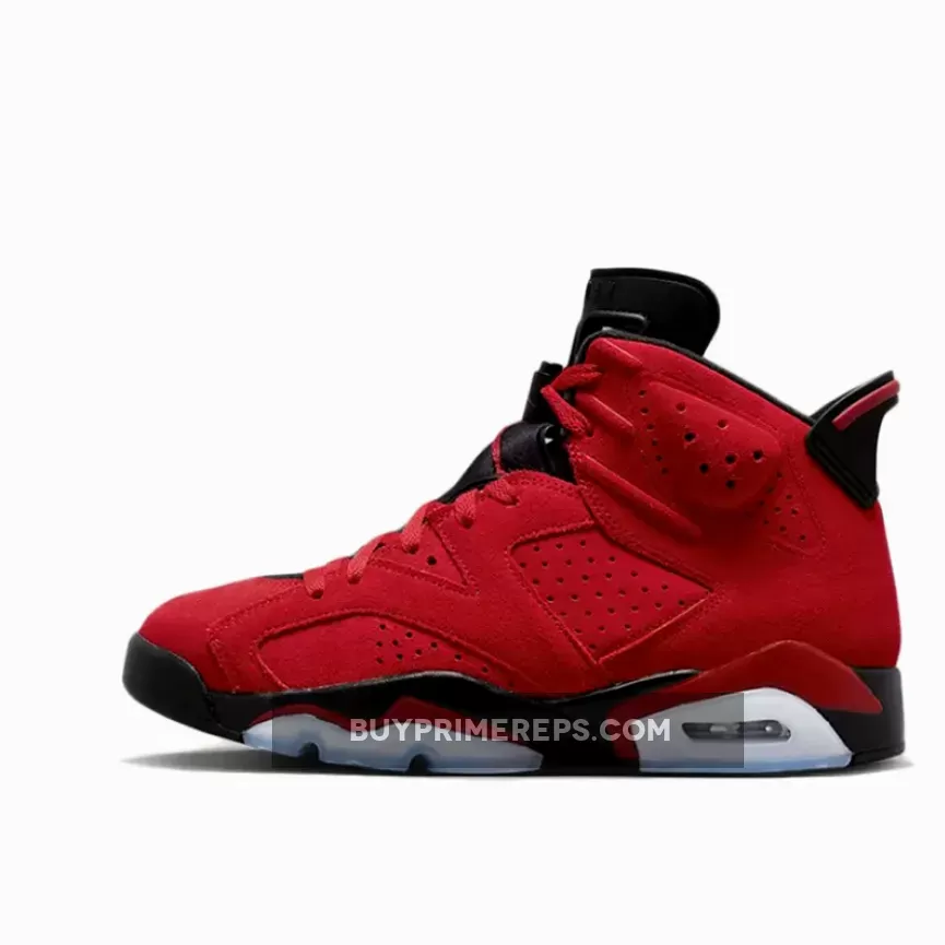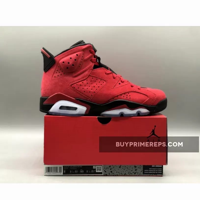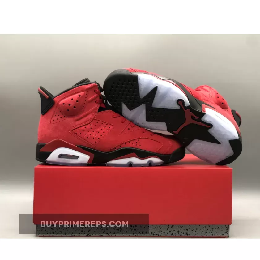 The upper of the Air Jordan 6 “Toro Bravo” is crafted from luxurious red suede, giving the shoe a premium look and feel. The vibrant red hue covers the entire upper, creating a striking visual impact. Black accents are present on the tongues, heel tabs, and midsole, adding a touch of contrast and depth to the design. This combination of red and black creates a classic colorway that is sure to turn heads and make a statement.