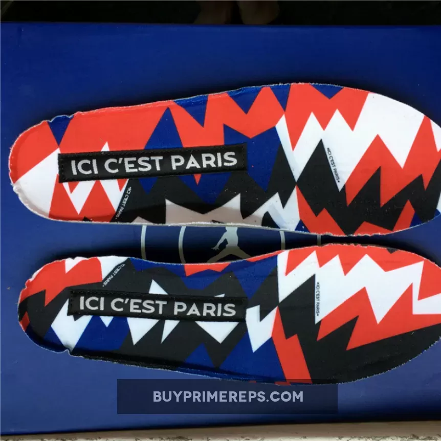 The shoe features a white tumbled leather upper with transparent mesh windows on the mid-foot and ankle panels. 🔵 Hits of red, navy, and gold nod to the colors of the football club, while Fleur-de-Lis insignias are set below the heel tab. 🏆 Flaps on the mid-panel read “PANAME” and “ICI C’EST PARIS”, adding an extra touch of Parisian flair.