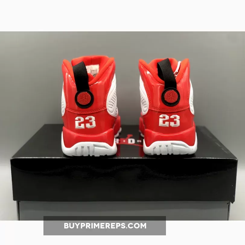 The red and white color scheme of the Jordan 9 Gym Red is a true head-turner. The vibrant red patent leather stands out against the white leather background, creating a striking contrast. Black accents can be found on the lacing system, tongue, and heel, adding a touch of stealthiness to the design. The heel is adorned with a white “23” and a rubberized Jordan Brand globe logo, adding subtle branding details to the shoe.