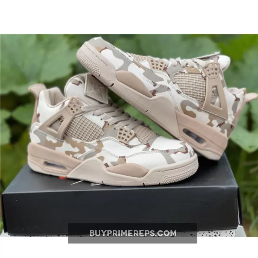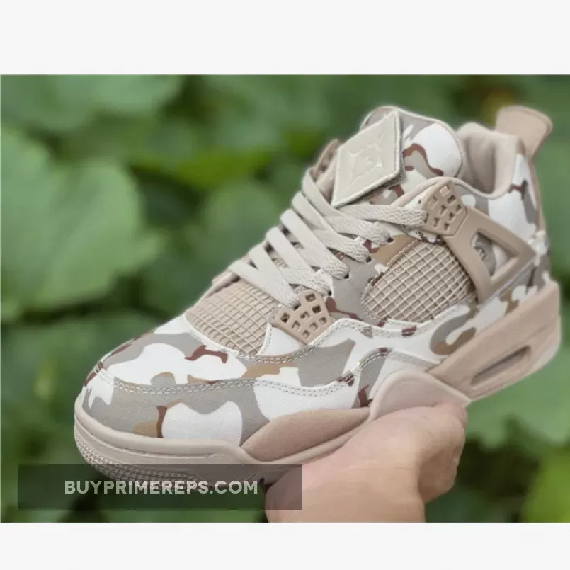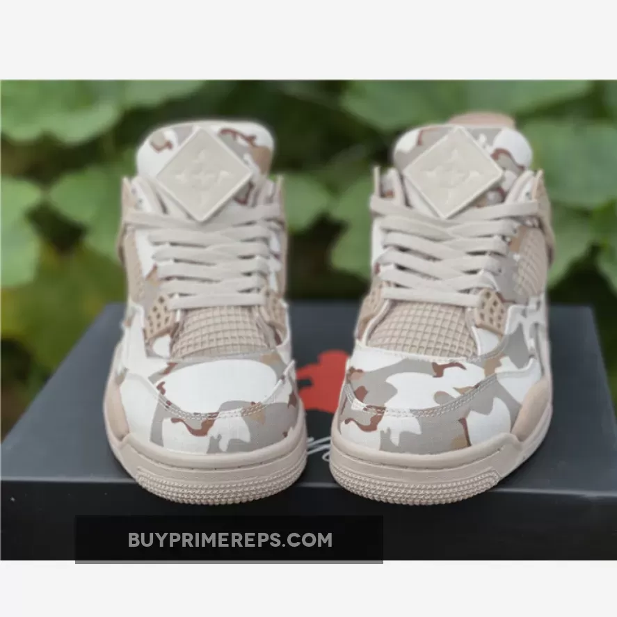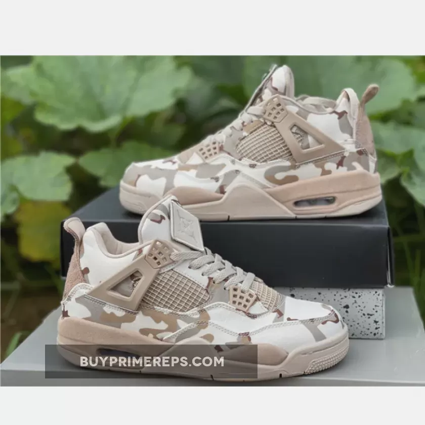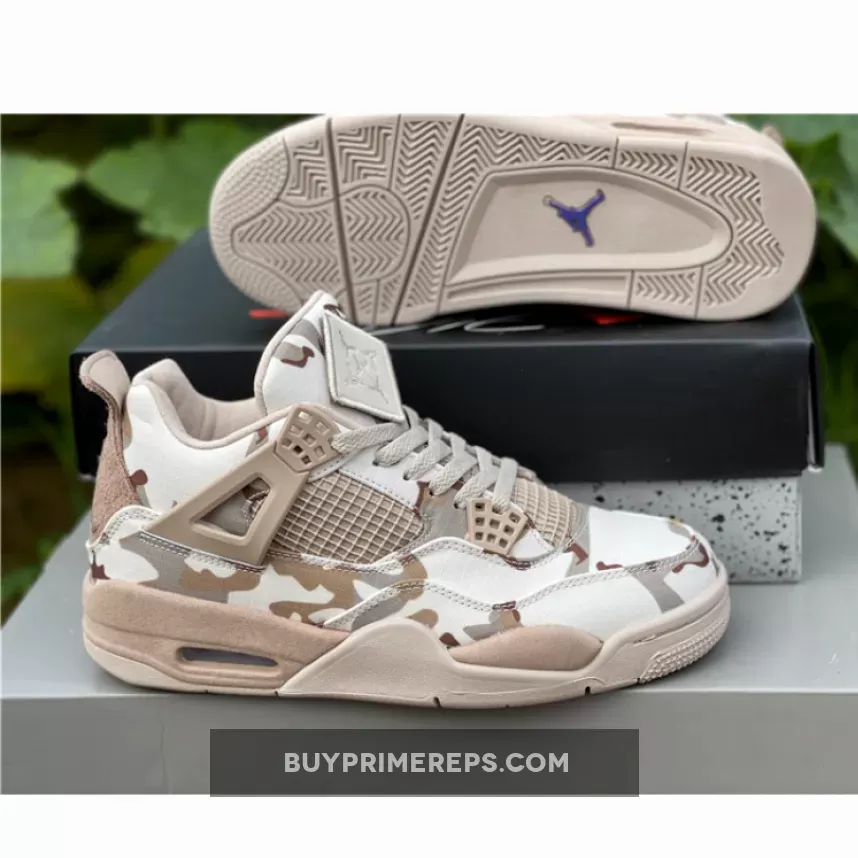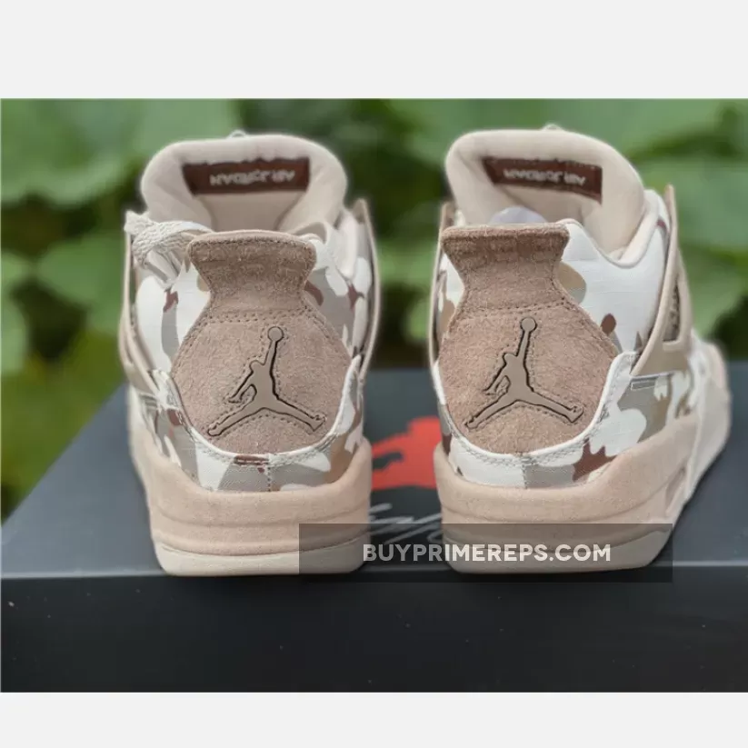 The Aleali May x Air Jordan 4 Camo showcases a striking camouflage print in shades of brown and green, adorning the ripstop nylon upper. This choice of pattern pays homage to the military theme that inspired the collaboration. The unique gridded design is also present on the sand-colored mesh-and-TPU toe box, the mid-panel windows, and the TPU eye stay accents, creating a cohesive and visually appealing aesthetic.