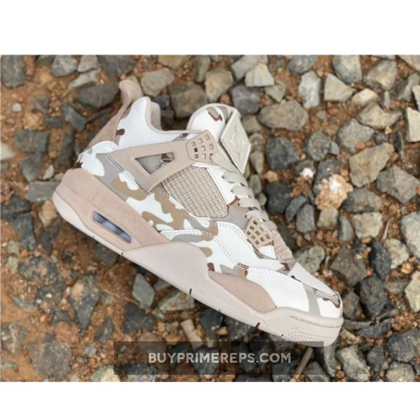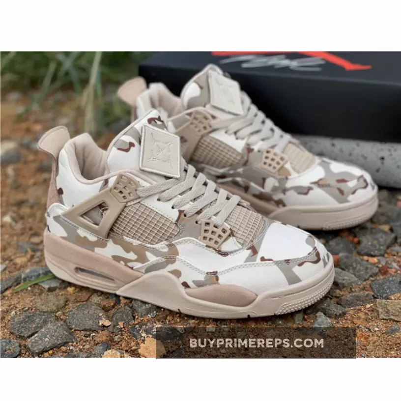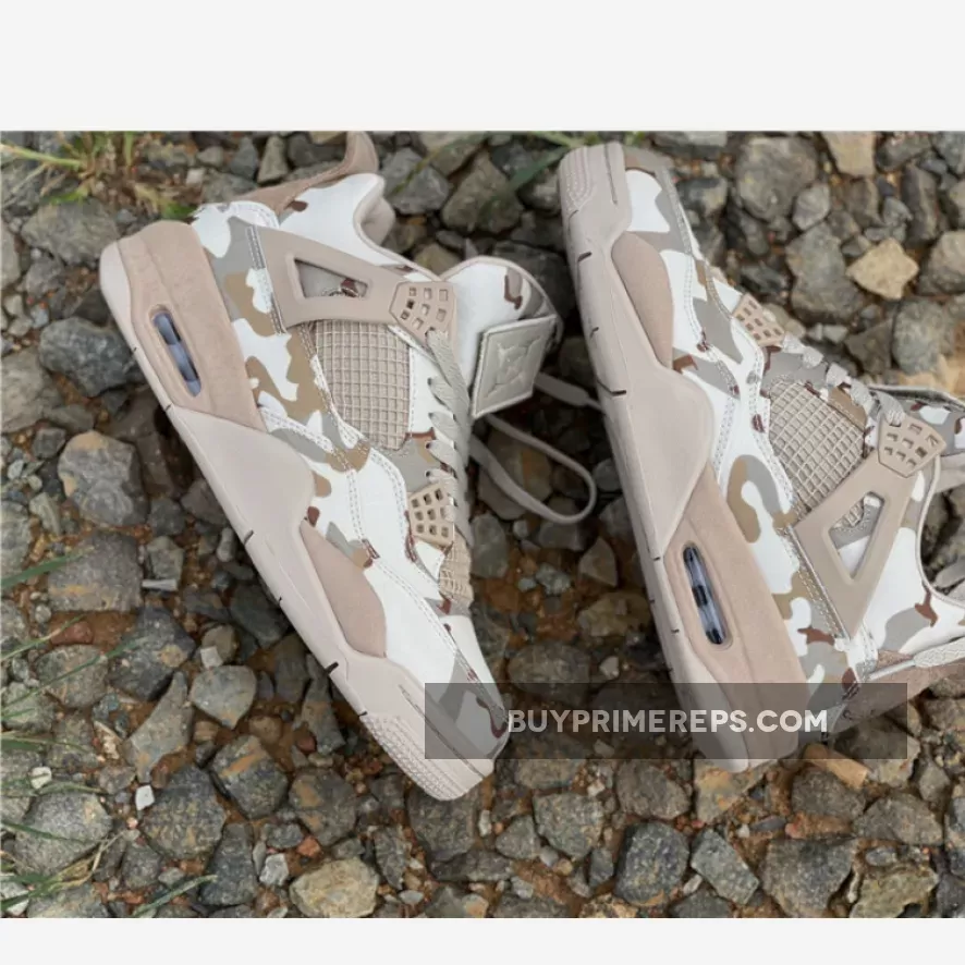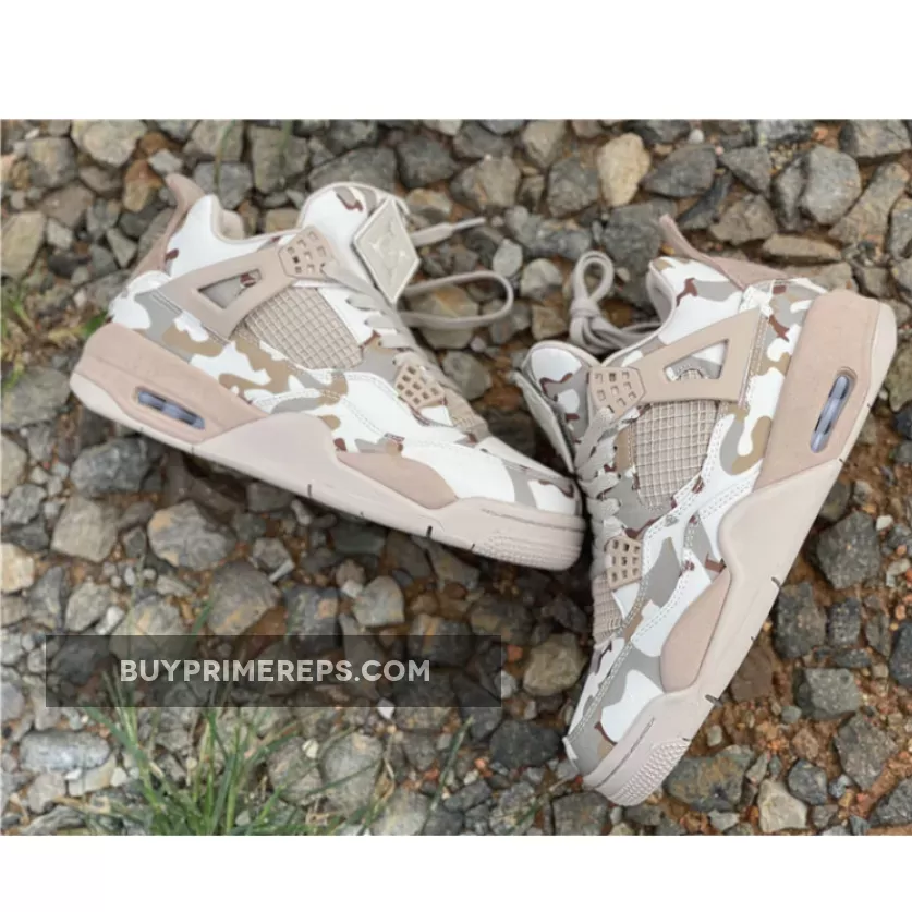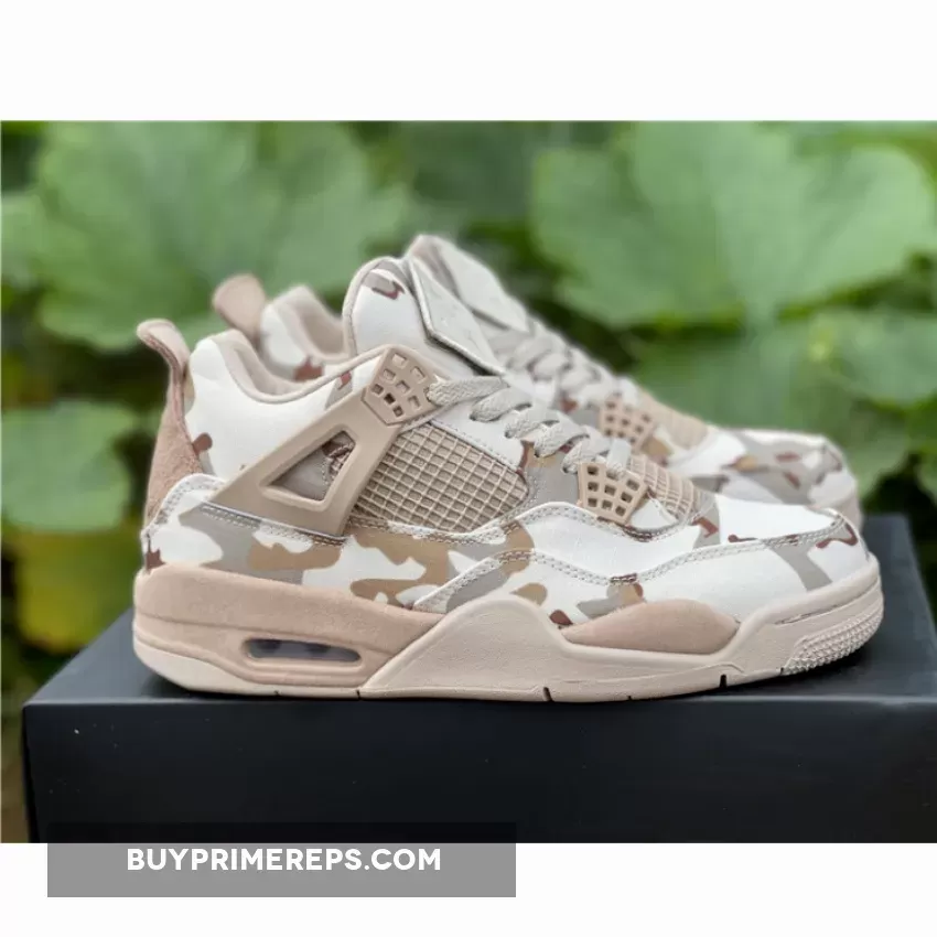 The Aleali May x Air Jordan 4 Camo showcases a striking camouflage print in shades of brown and green, adorning the ripstop nylon upper. This choice of pattern pays homage to the military theme that inspired the collaboration. The unique gridded design is also present on the sand-colored mesh-and-TPU toe box, the mid-panel windows, and the TPU eye stay accents, creating a cohesive and visually appealing aesthetic.