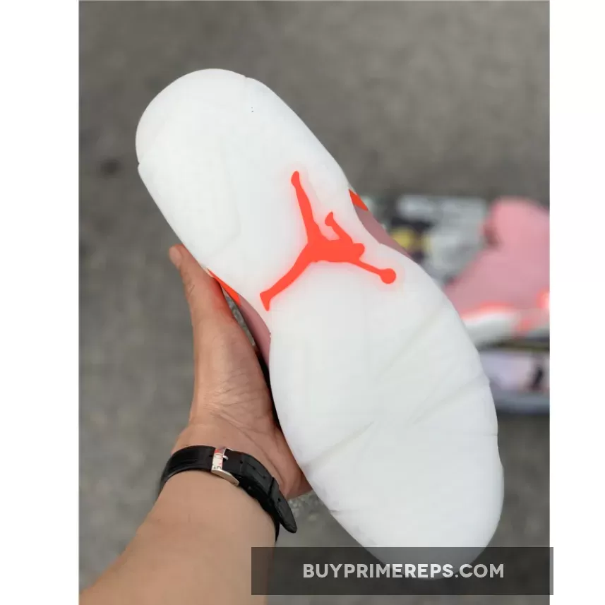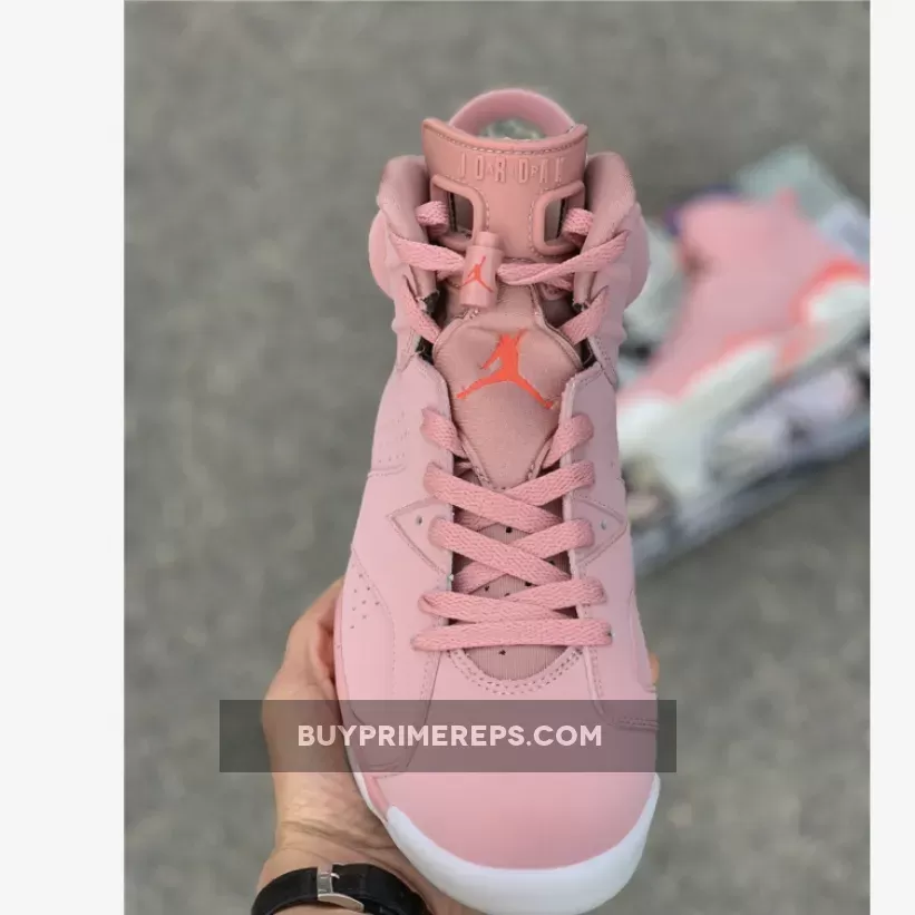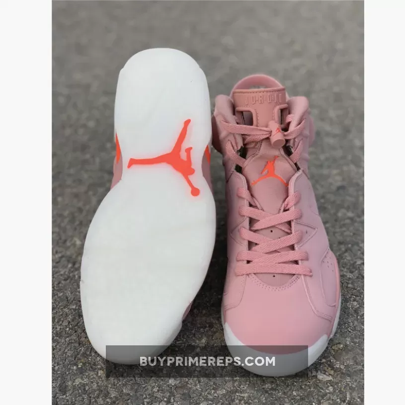The sneaker features a striking “Millennial Pink” colorway, which adds a fresh and contemporary appeal to the classic Air Jordan 6 silhouette. The upper is constructed from luxurious leather and is adorned with perforations for enhanced breathability. The deconstructed tongue and quick-pull laces contribute to the modern aesthetic of the sneaker, while the semi-translucent heel tab adds an element of visual interest. The use of Bright Crimson branding provides pops of vibrant color against the soft Rust Pink backdrop, creating a harmonious and eye-catching design.
