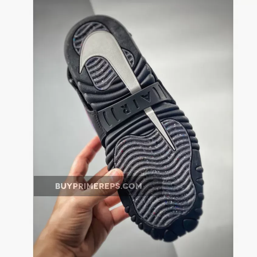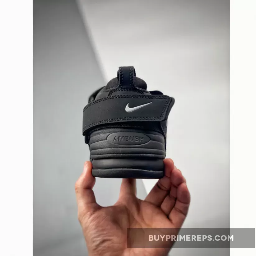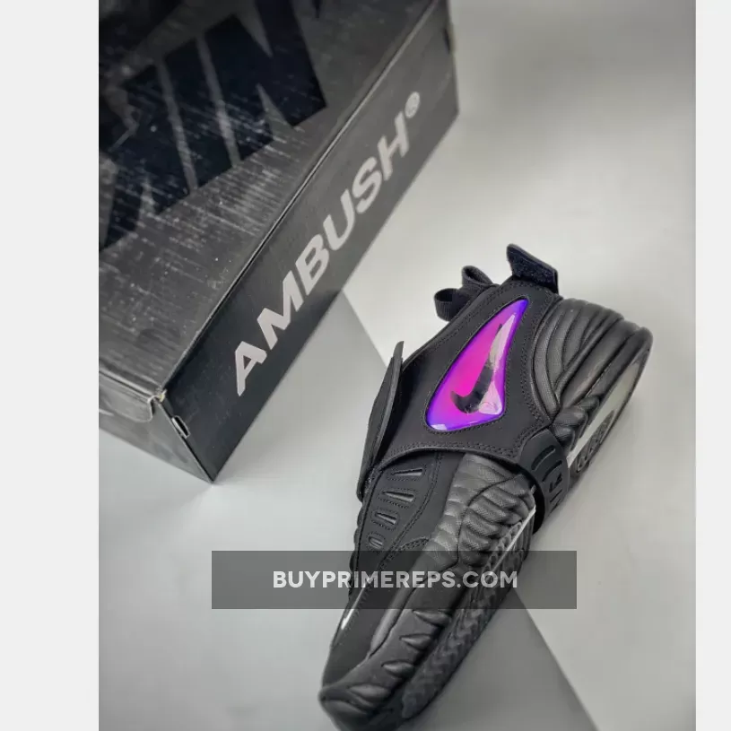 Bright white Nike Swooshes adorn the forefoot and tongue, breaking up the black color scheme and adding a contrasting element to the design. AMBUSH branding can be spotted at the heel, further emphasizing the collaboration between the two brands. The chunky black midsole completes the retro vibe of the sneaker, adding both style and functionality.