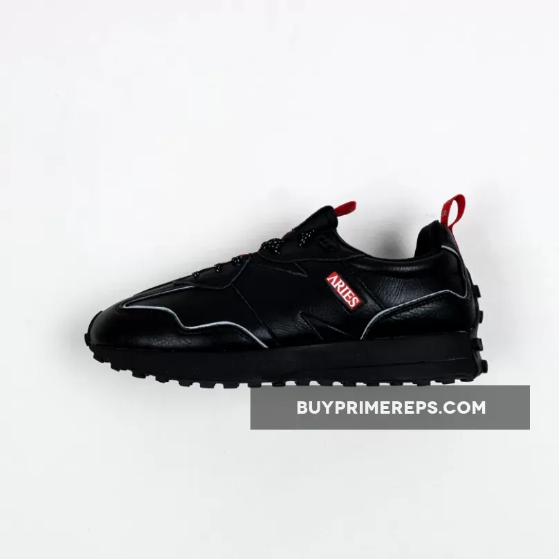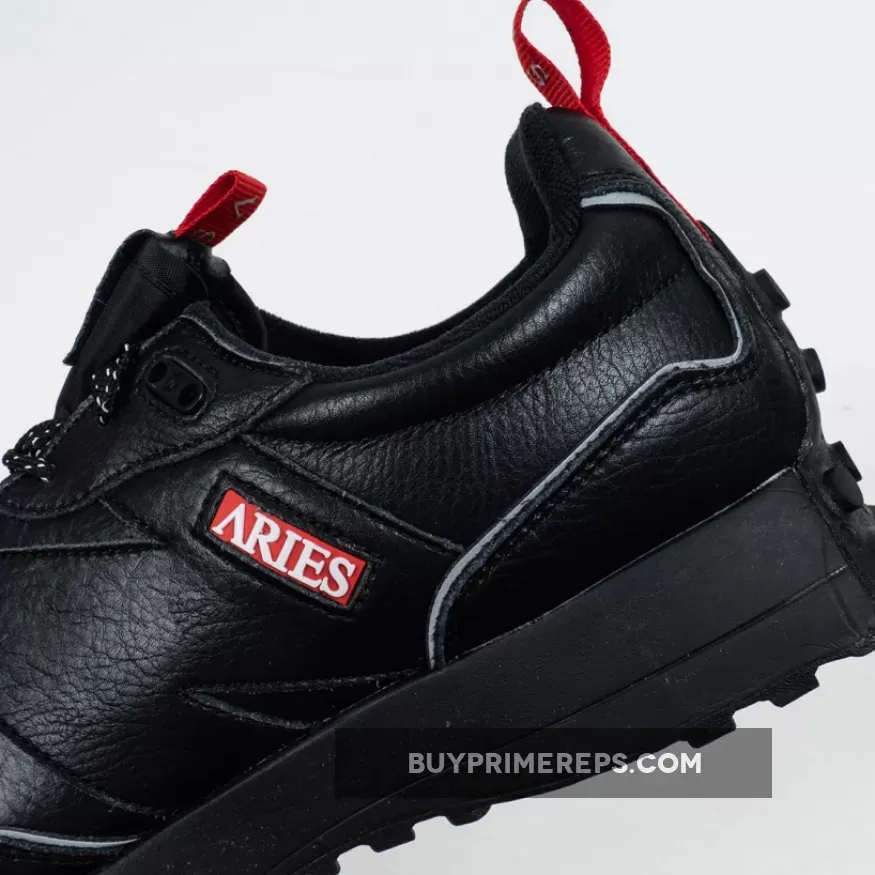 Oversized “N” logos and the prominent “Aries” branding dominate the shoe’s profile. Vibrant red accents along the side, tongue, and heel counter elevate the visual appeal. Reflective elements strategically placed enhance visibility in low-light conditions.