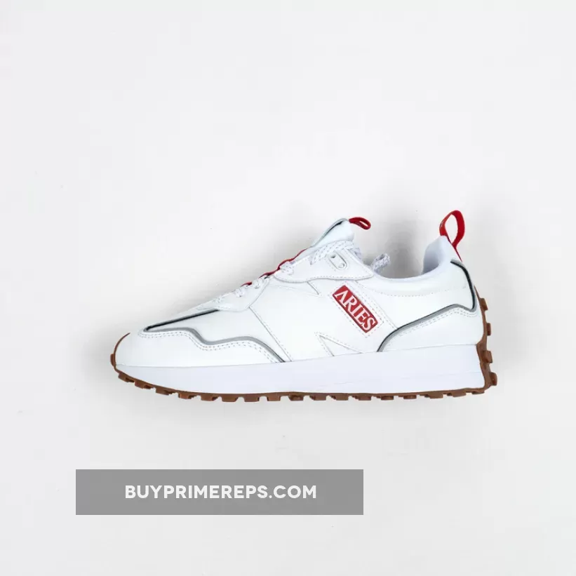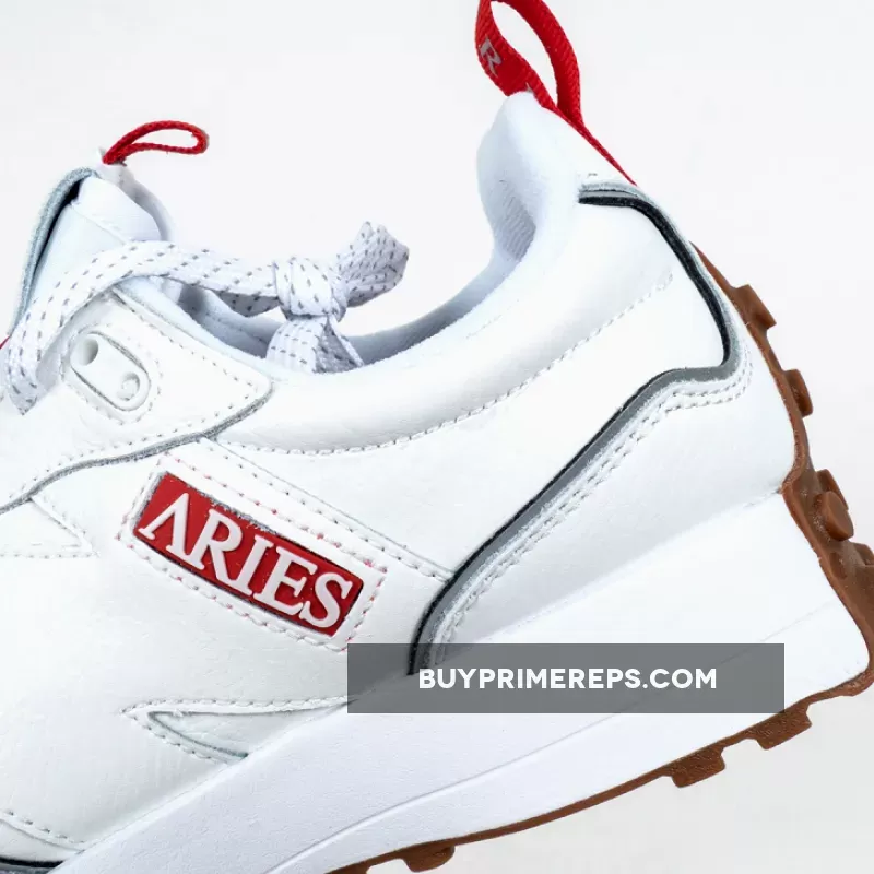 The vibrant red accents add a pop of color to the design, drawing attention to the “ARIES” branding along the side and the webbing that stitches along both the tongue and heel. And for added flair, multiple reflective accents are strategically placed along the leather strips and overlays, giving the shoe an edgy, high-tech look.