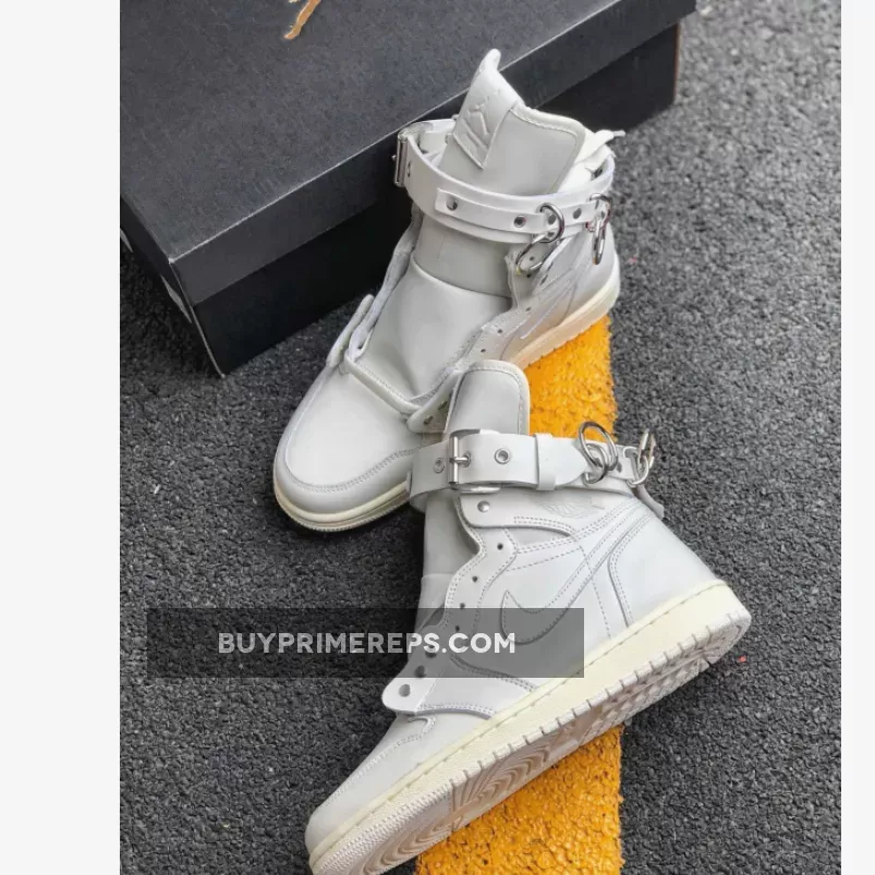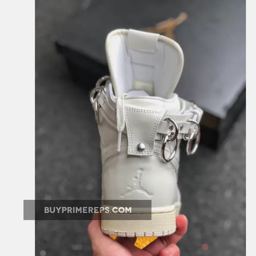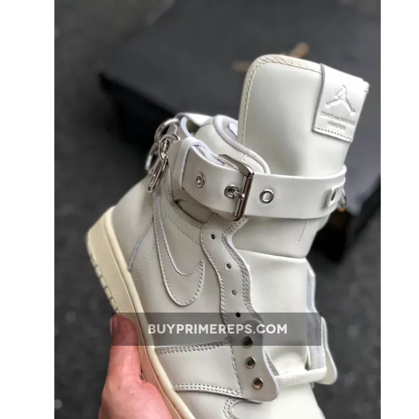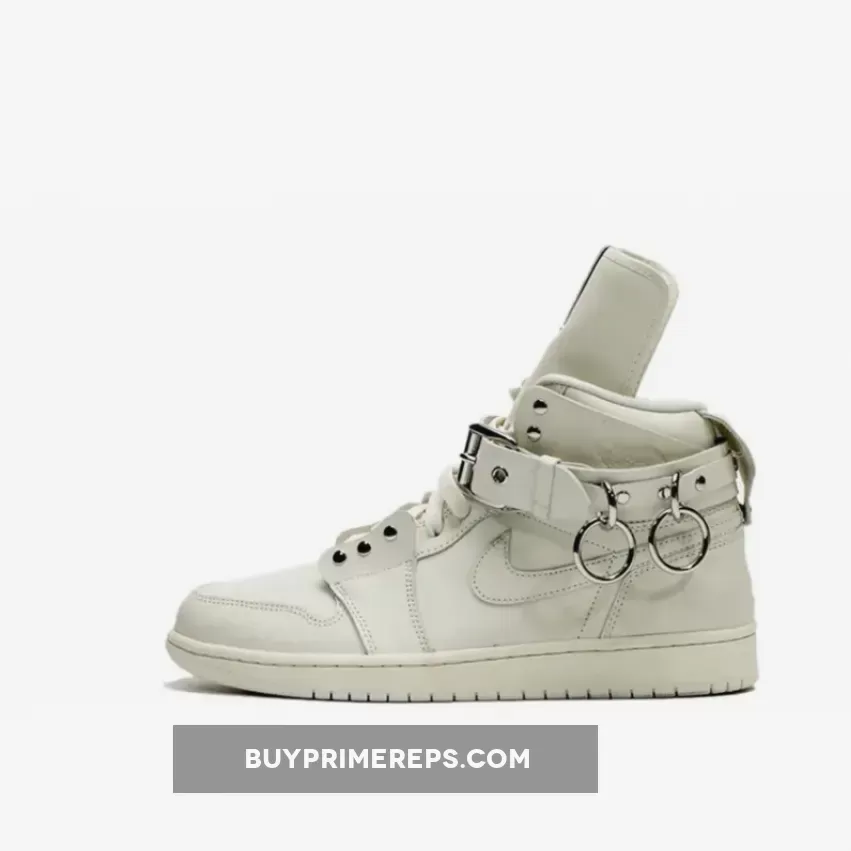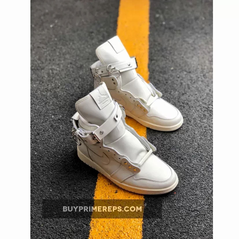 Crafted from premium smooth leather, the Comme Des Garcons X Air Jordan 1 High White features a clean white colorway that exudes elegance and sophistication. However, it is the details of this shoe that truly set it apart. Drawing inspiration from classic motorcycle boots, the shoe is adorned with buckle straps and silver studs throughout, giving it a rebellious and punk-inspired look.