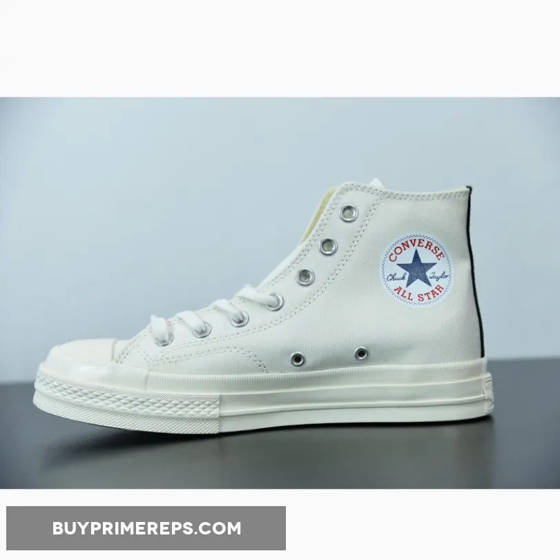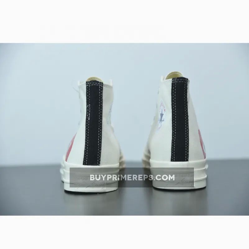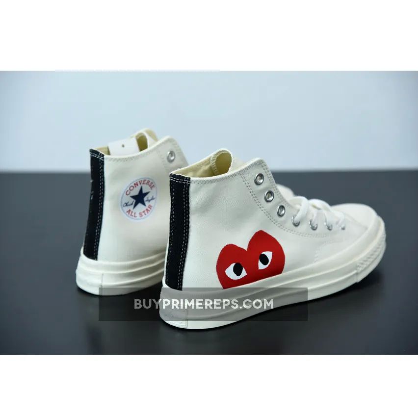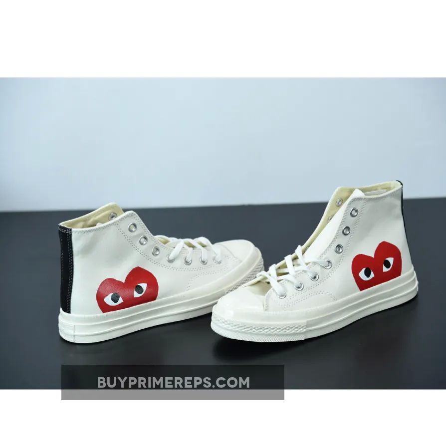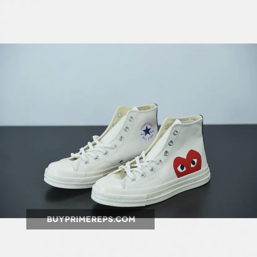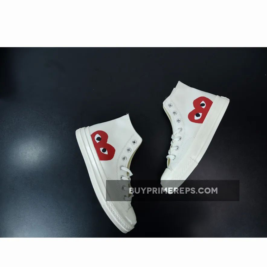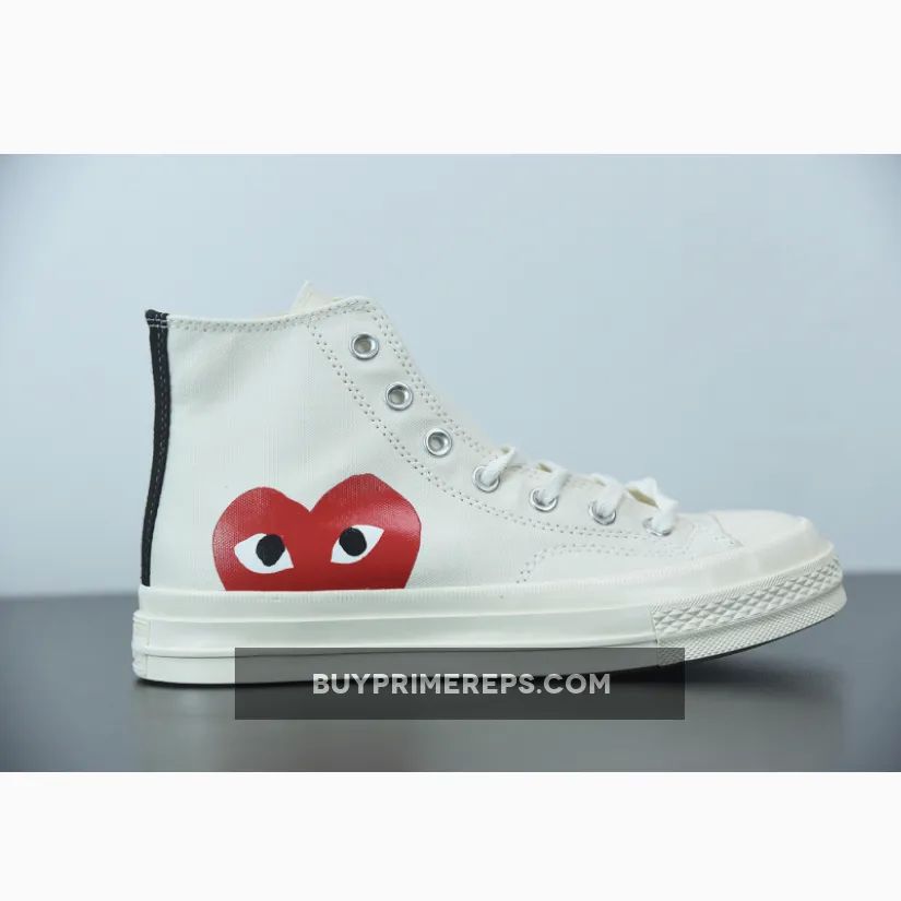 The Comme des Garçons PLAY x Converse Chuck 70 High Top in Milk/White/High Risk Red is a limited edition release and is highly coveted by sneaker enthusiasts and fashion aficionados alike. Its exclusive nature and distinctive design make it a must-have for collectors and fans of both brands.