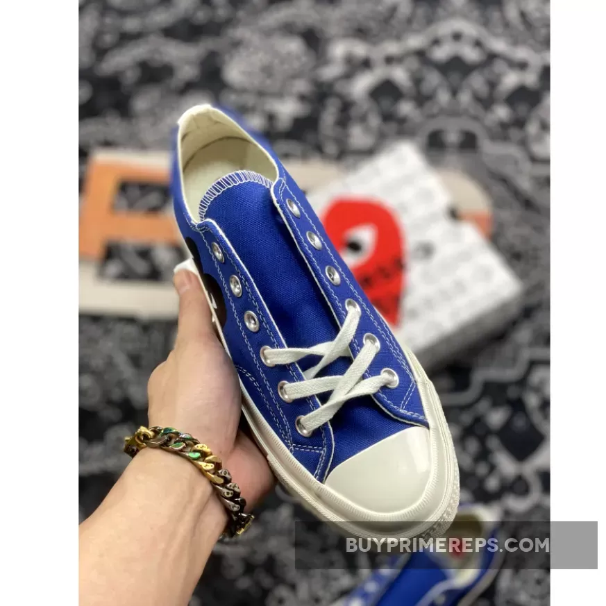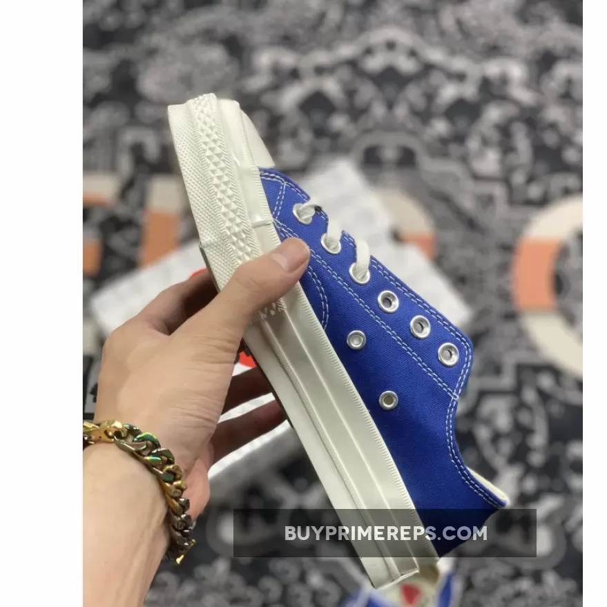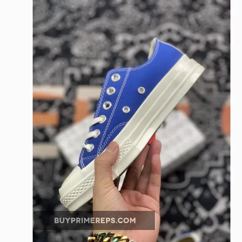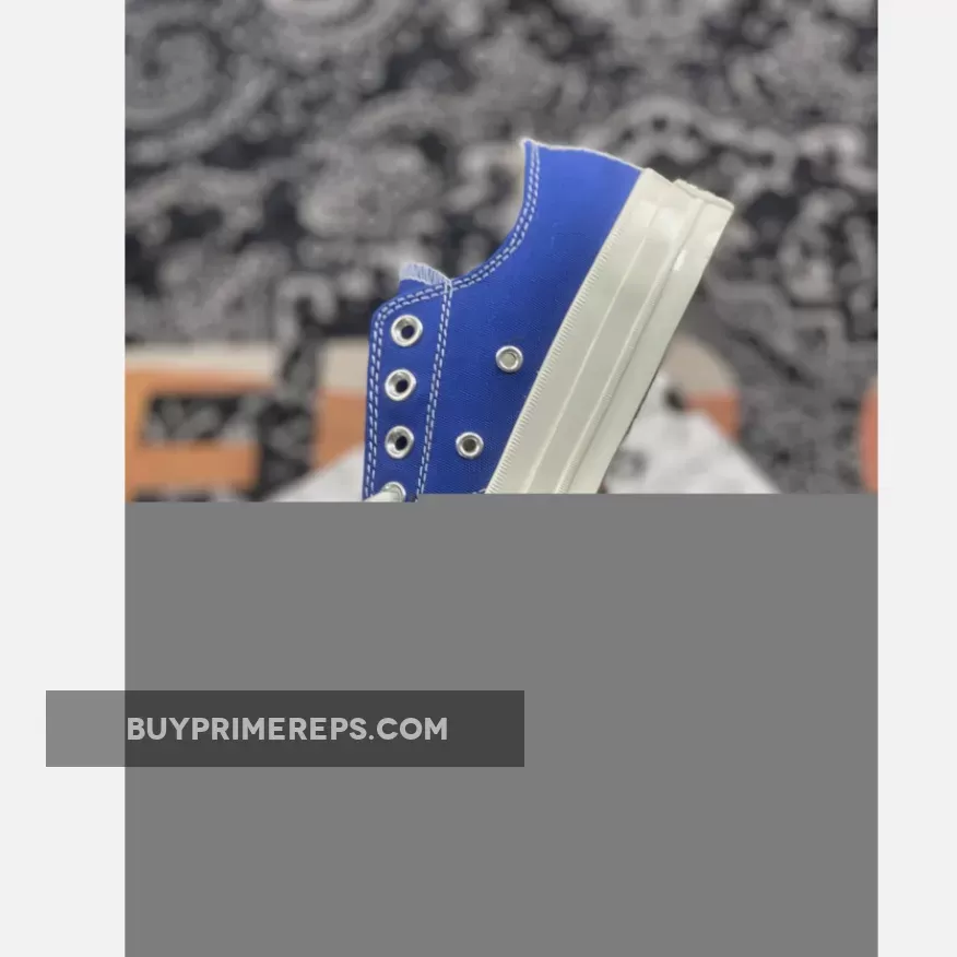 The Comme des Garcons Play x Converse Chuck 70 Low Blue Quartz 171848C is a striking and stylish iteration of the classic Converse Chuck Taylor silhouette. This collaborative release between Comme des Garcons and Converse brings a fresh and vibrant twist to the iconic Chuck 70 design. The shoe features a bright blue colorway, adding a pop of color to any outfit and making it a perfect addition to your summer footwear collection.