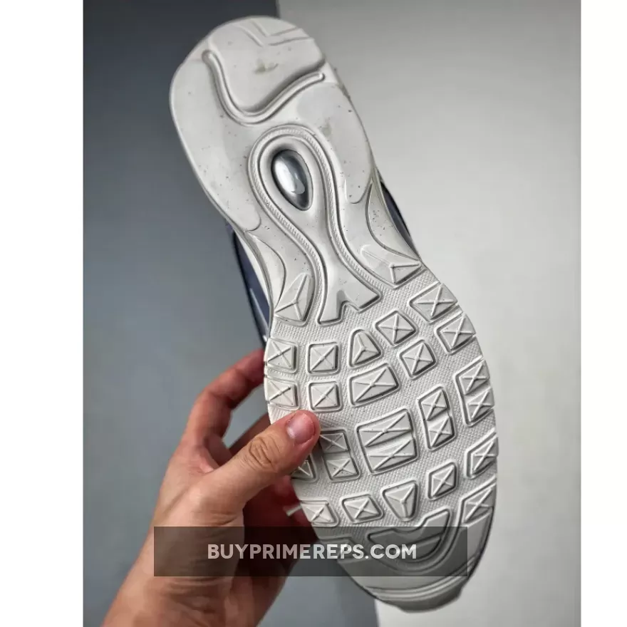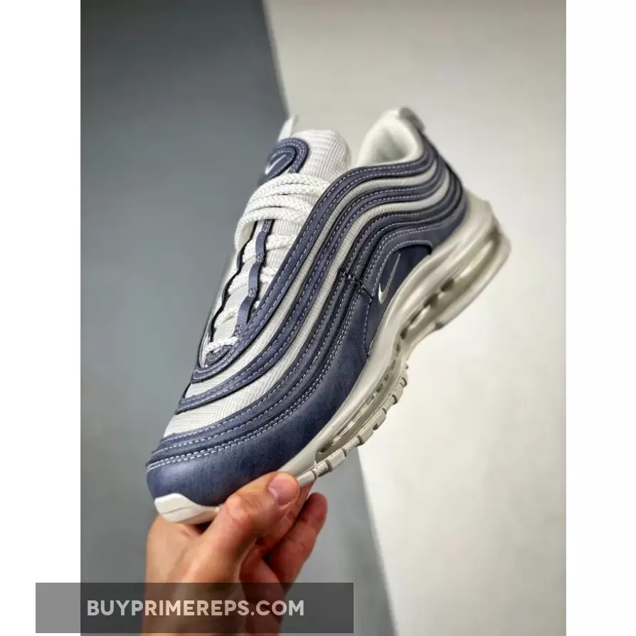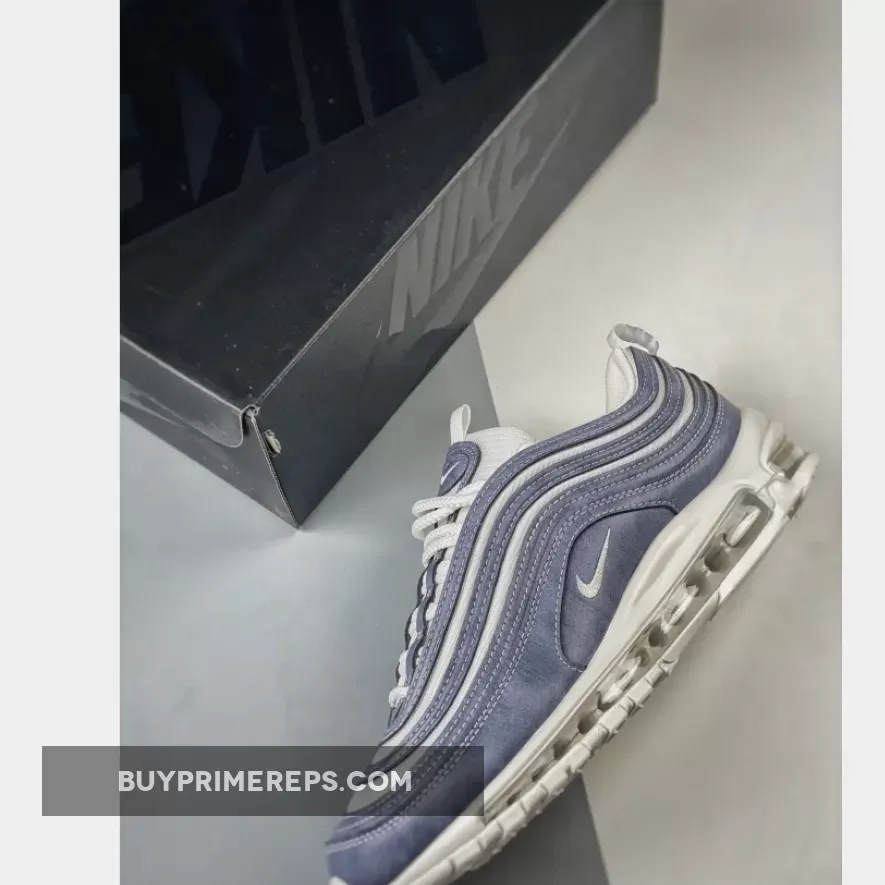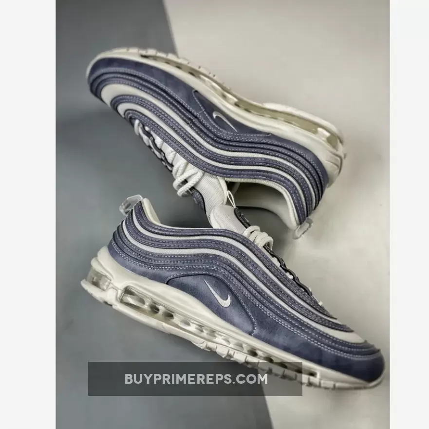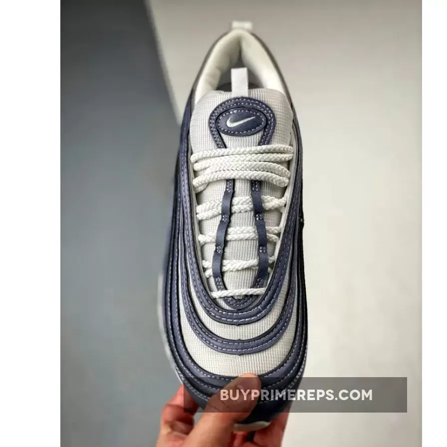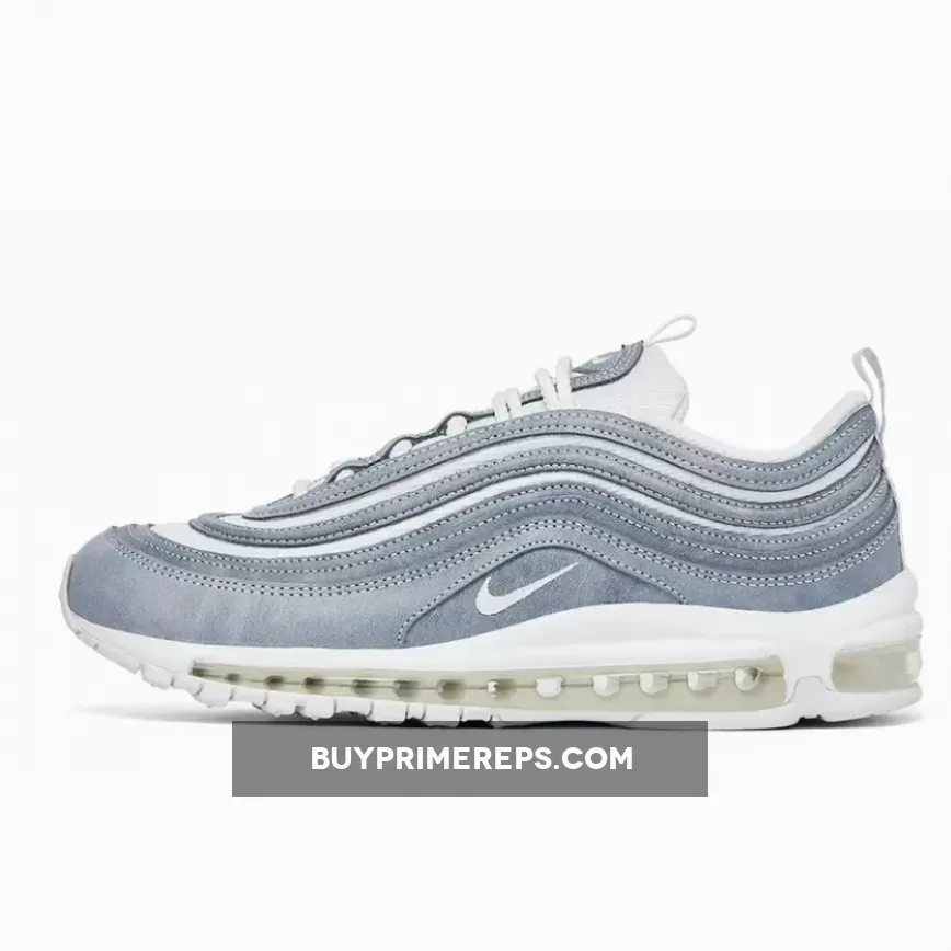 The colorway of this Air Max 97 is Glacier Grey, which covers most of the upper. The grey hue gives the sneaker a sleek and minimalist look, making it easy to style with a variety of outfits. The upper is made up of alternating panels of suede and textile, which creates a unique and eye-catching pattern reminiscent of water ripples. This attention to detail and craftsmanship is a hallmark of both Comme des Garcons and Nike, and it is evident in this collaboration.