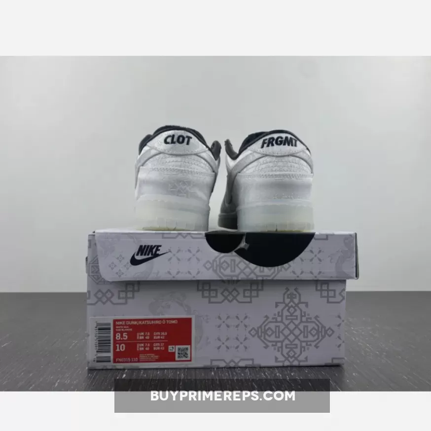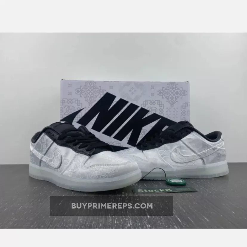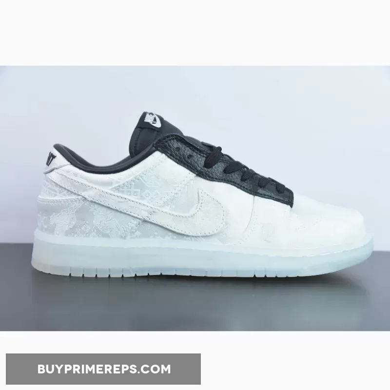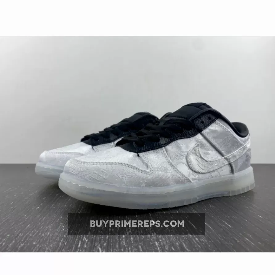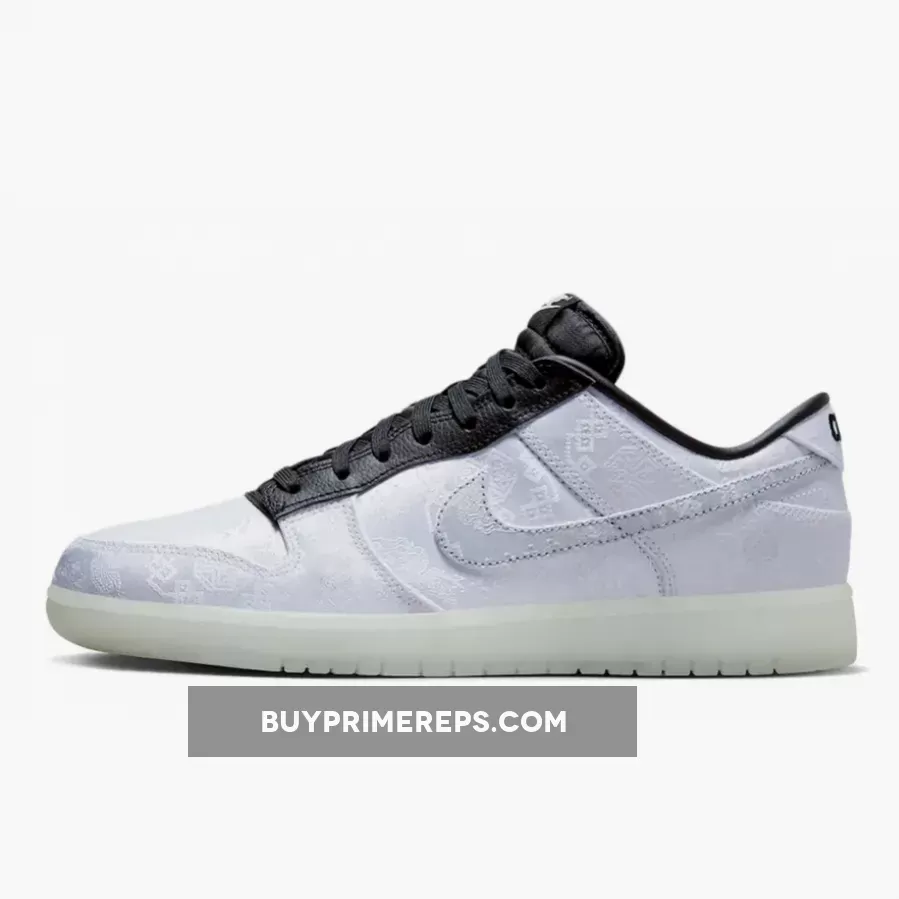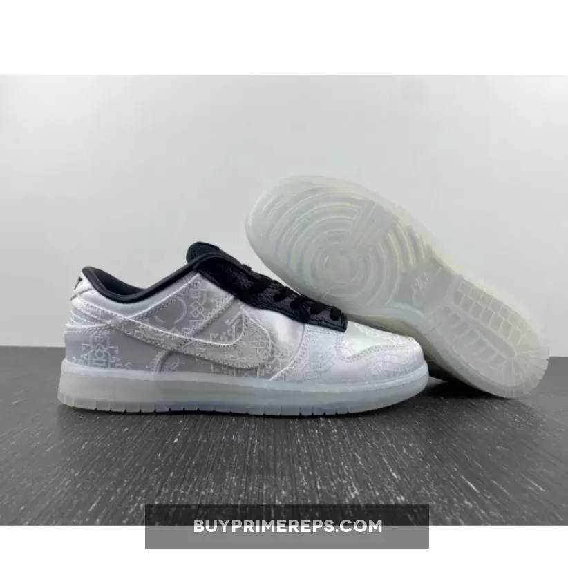 The CLOT x fragment x Nike Dunk Low features a tearaway silk upper in a striking white color. The silk material gives the shoe a luxurious and premium feel, while also adding a touch of elegance to the overall design. Black leather accents on the eyestays and lining provide a subtle contrast and add to the shoe’s sophisticated aesthetic.
