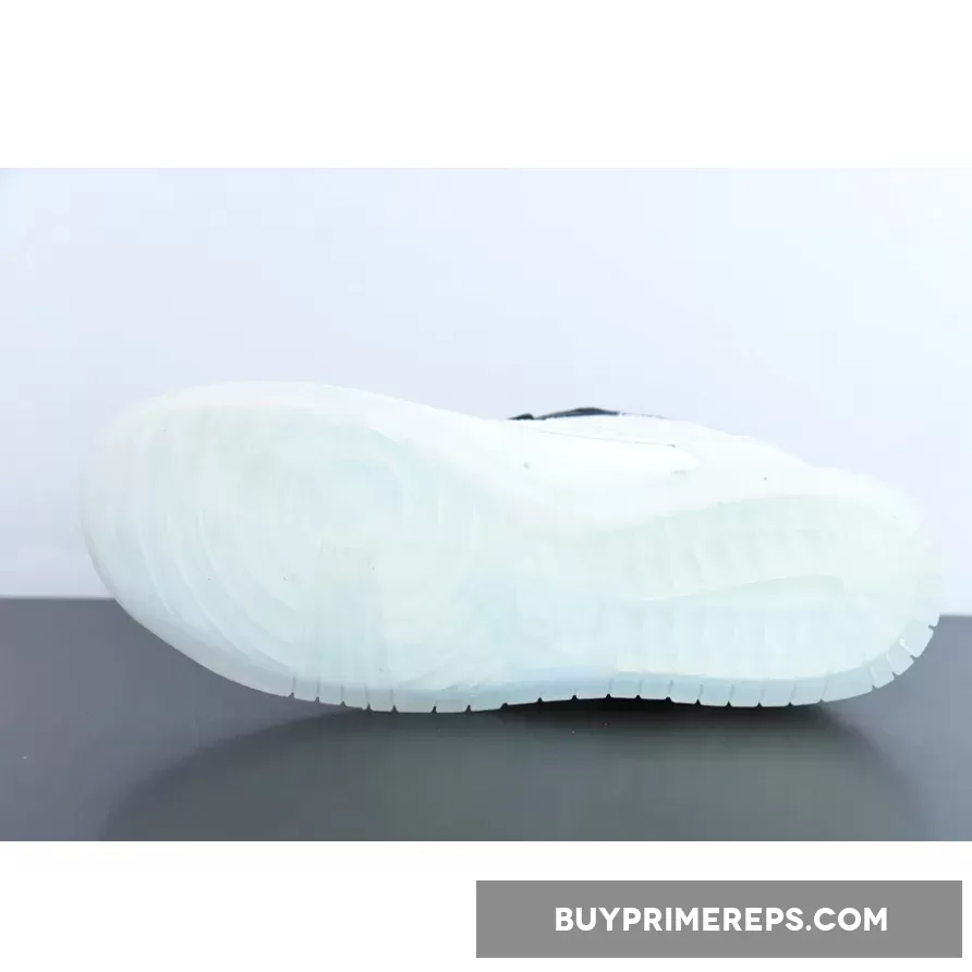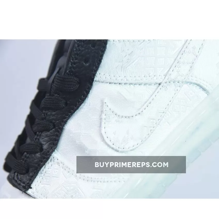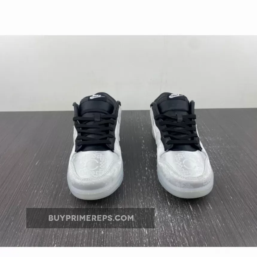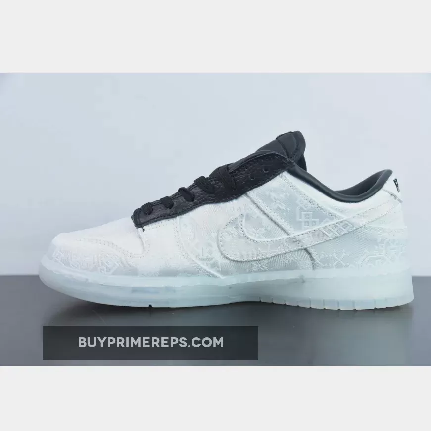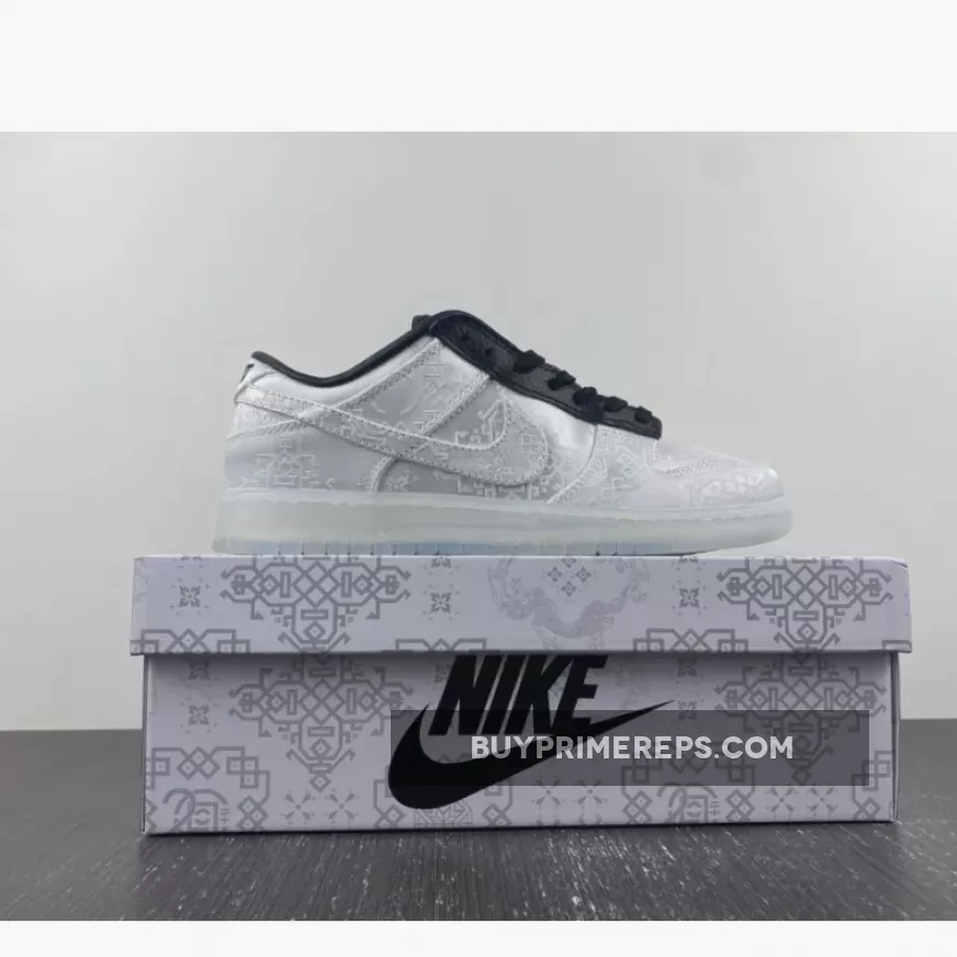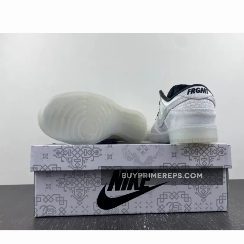 The CLOT x fragment x Nike Dunk Low features a tearaway silk upper in a striking white color. The silk material gives the shoe a luxurious and premium feel, while also adding a touch of elegance to the overall design. Black leather accents on the eyestays and lining provide a subtle contrast and add to the shoe’s sophisticated aesthetic.