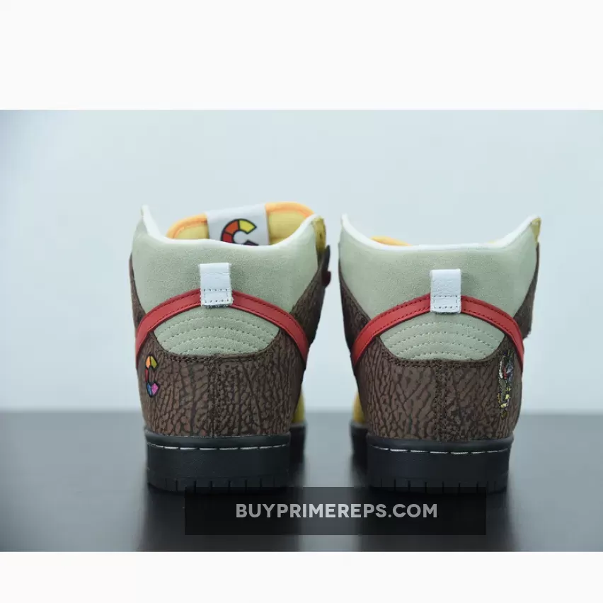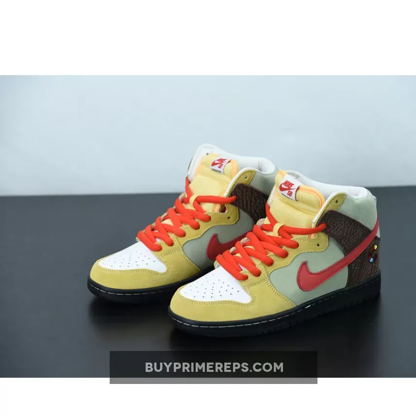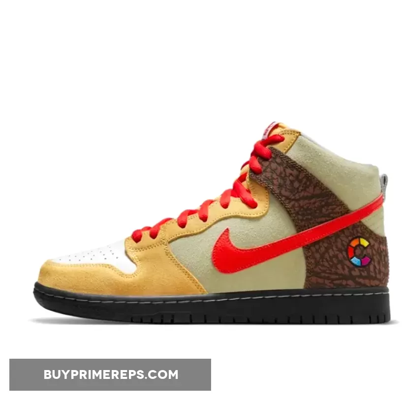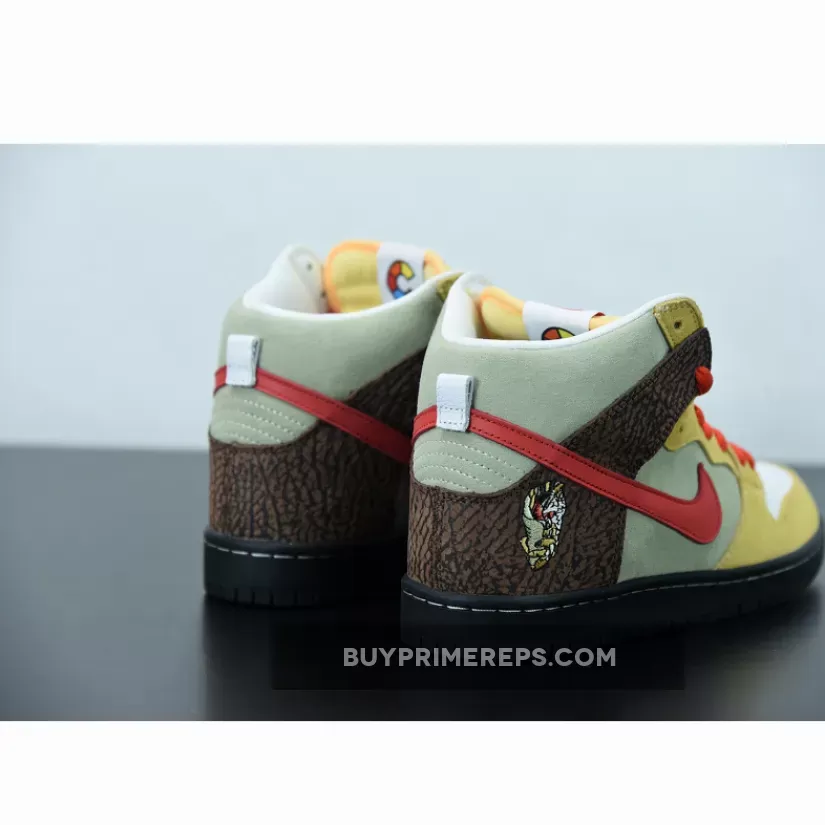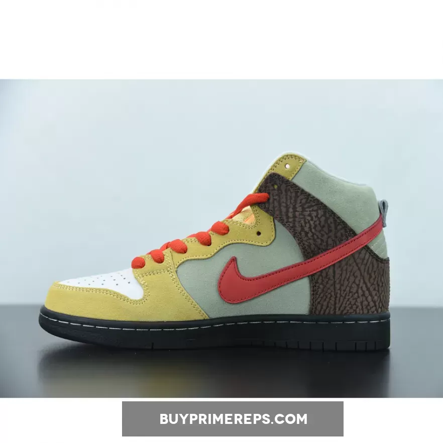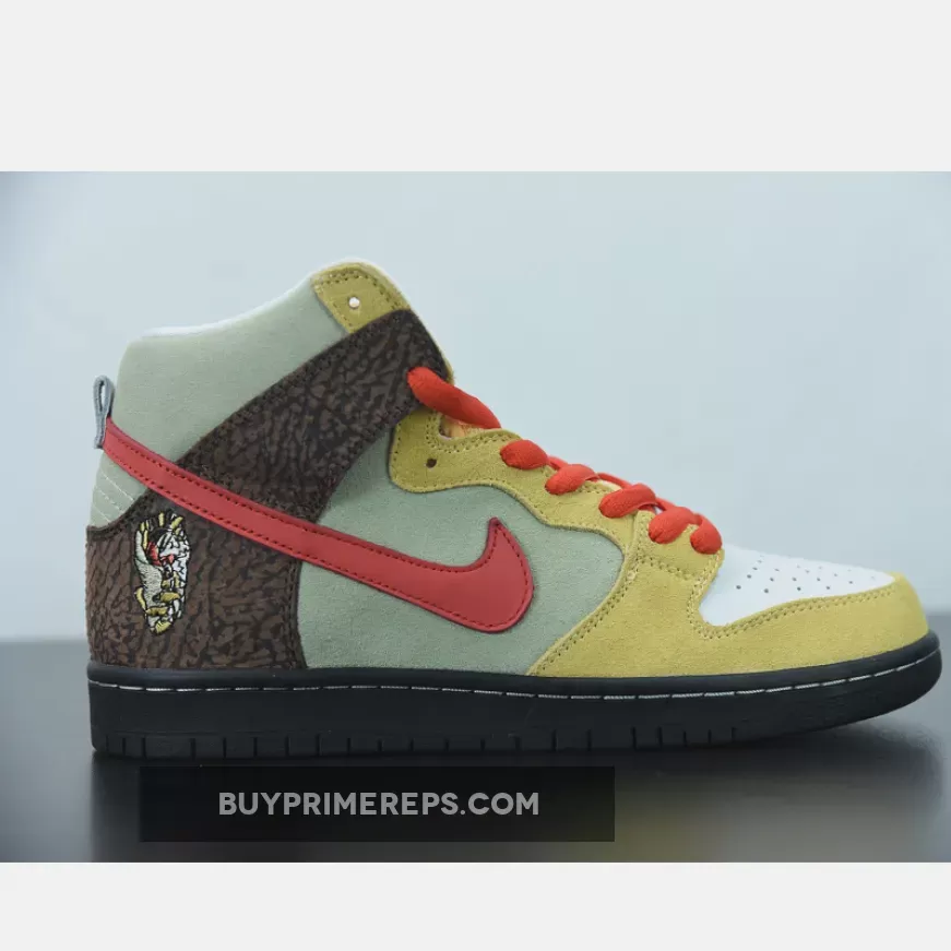 The design of the Nike SB Dunk High Kebab and Destroy is a true representation of the ingredients that make up a gyro kebab. The upper features a mix of premium suede and leather materials, with each element carefully chosen to mimic the different components of the dish. The tan suede used on the toe and eyestay represents the pita bread that holds the gyro together. This is complemented by red hits on the laces and Swoosh logos, symbolizing the vibrant tomatoes that add a burst of flavor to the kebab.