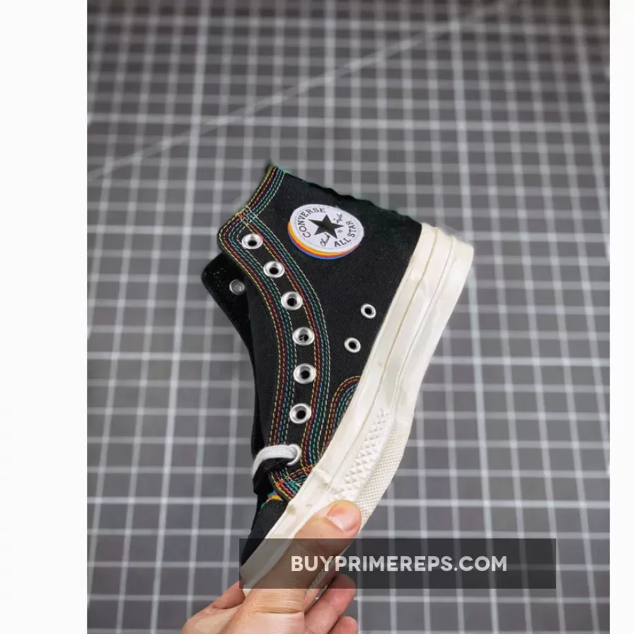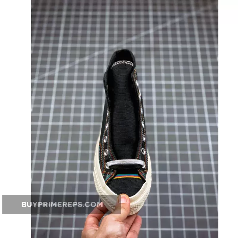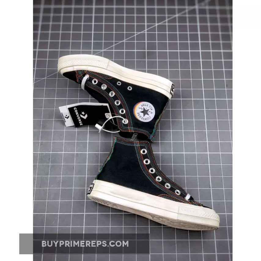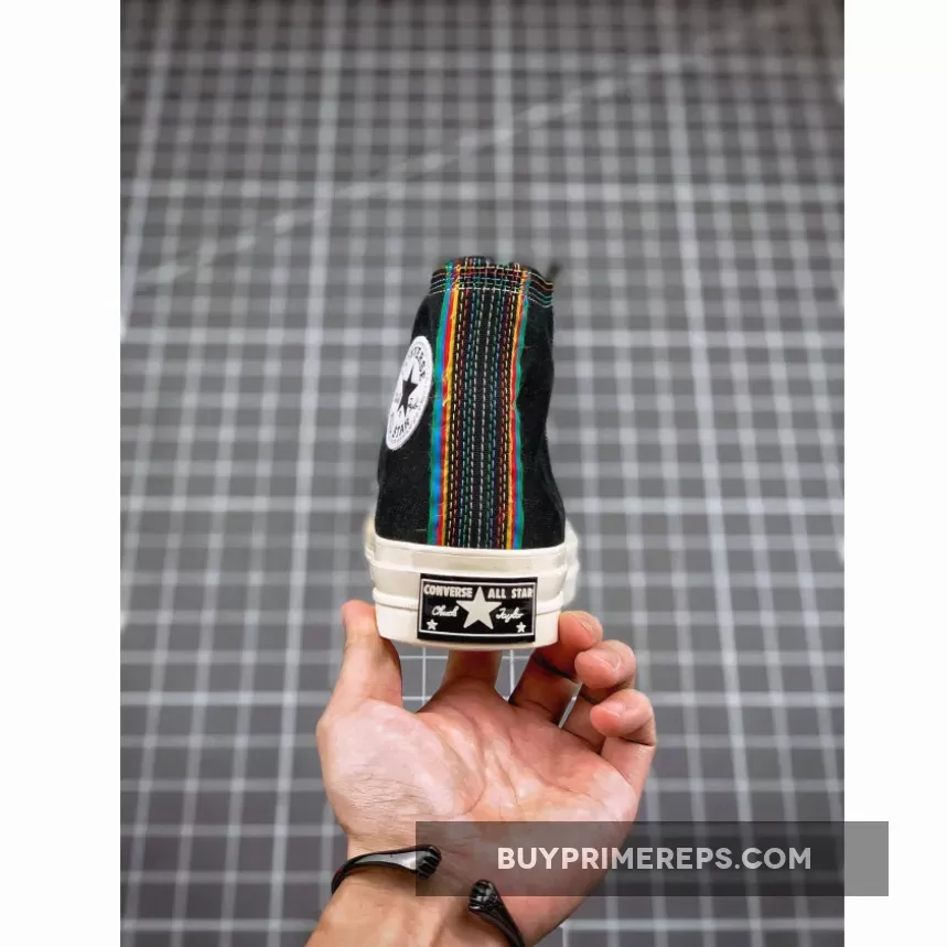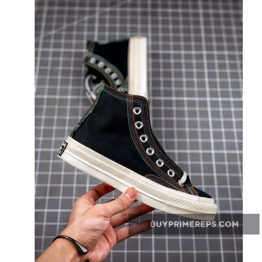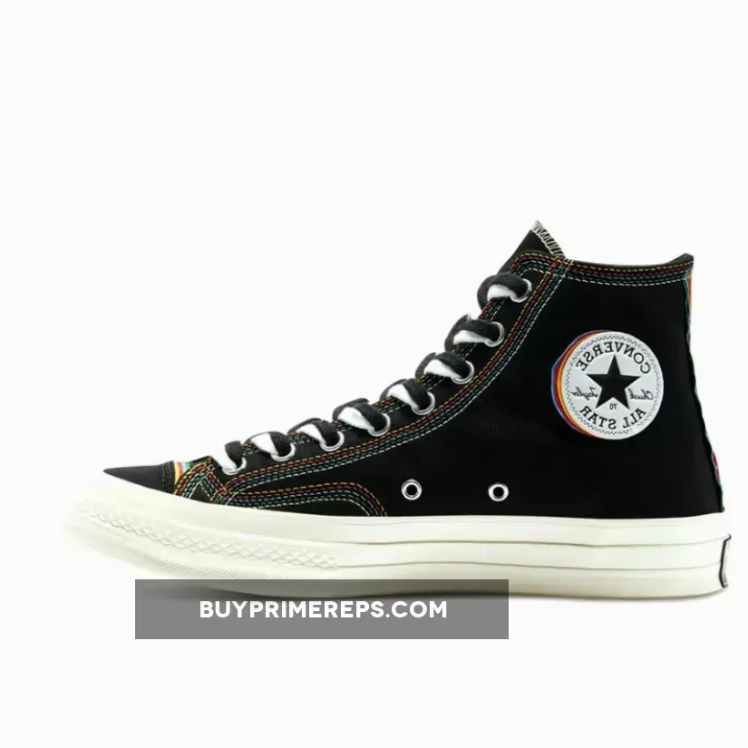 Constructed with premium and durable canvas, the Chuck 70 Hi All Star Layers Black stays true to the original design that has made the Chuck 70 a timeless favorite. However, what sets this version apart is the addition of rainbow-colored stitching throughout the upper. The vibrant stitching extends from the toe box to the chunky heel panel at the back, creating a visually striking contrast against the black canvas.