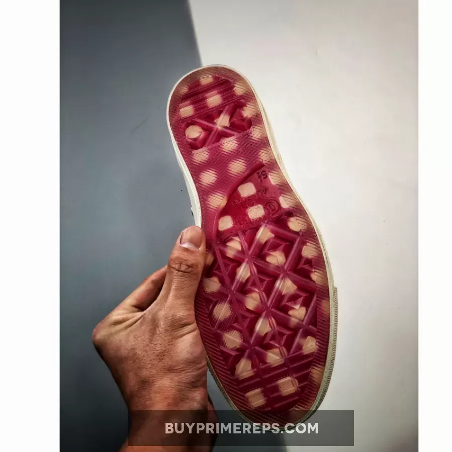 One of the standout features of the Chuck 70 High Patchwork Floral White is the translucent rubber outsole, which reveals a vibrant red gingham underlay. This playful and whimsical touch adds a pop of color and adds to the overall handmade aesthetic of the shoe.