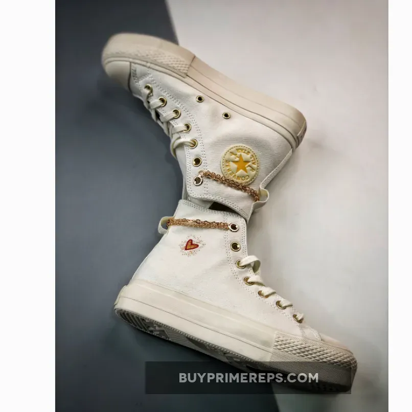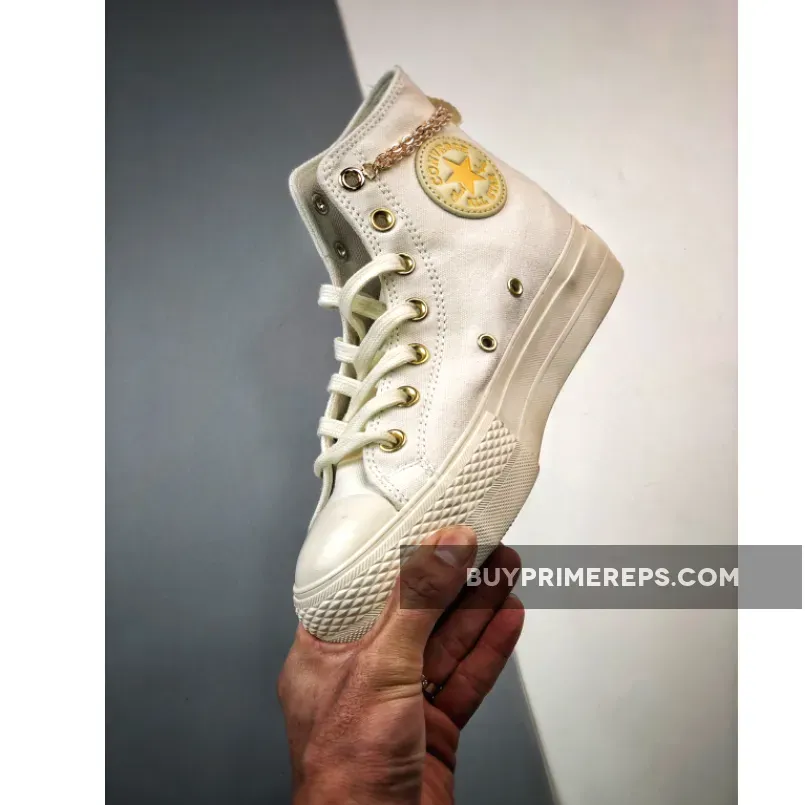 Introducing the Converse Chuck Taylor All Star Gold Chain High Top in Egret, a stylish and elevated version of the classic Chuck Taylor sneakers. Inspired by the iconic girl bands of the ’90s, these shoes are designed to make a bold statement.