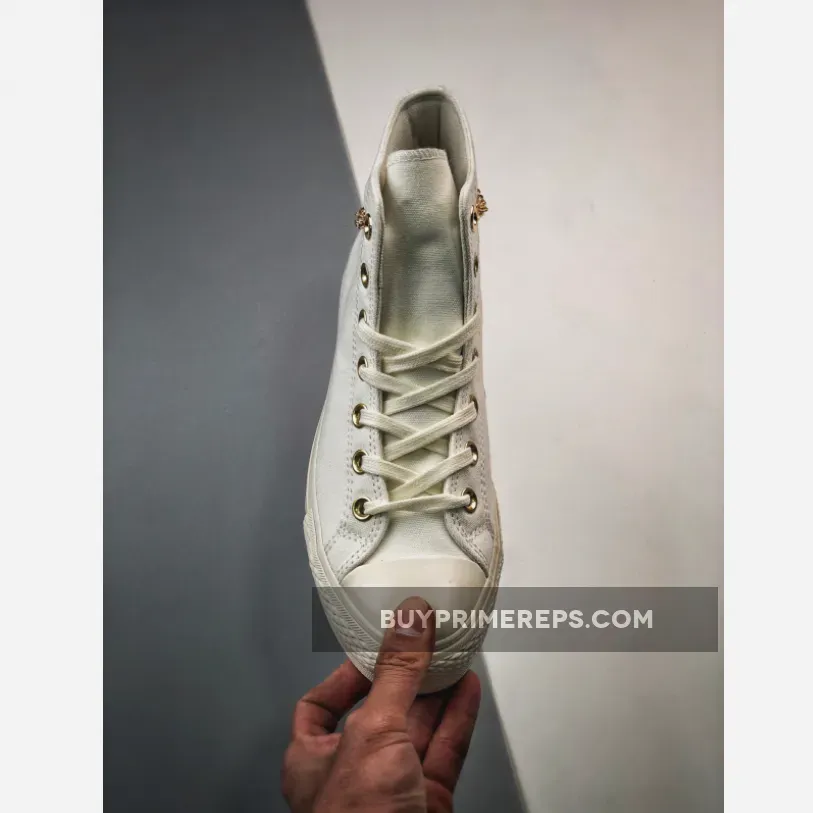 The Chuck Taylor All Star Gold Chain High Top also features the classic All Star ankle badges on the medial side, with the same metallic gold accents found on the eyelets. This cohesive design creates a harmonious and balanced look that is visually appealing.