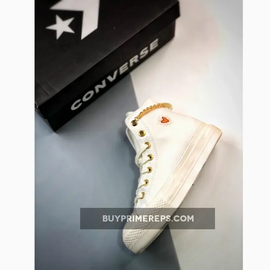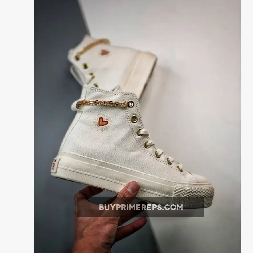 The Chuck Taylor All Star Gold Chain High Top features an Egret-colored canvas upper that gives it a clean and sophisticated look. On the lateral side of the shoe, you’ll find a small gold heart with an embroidered burgundy outline, adding a touch of femininity to the design. The bright metallic gold eyelets not only add a pop of shine but also enhance the overall aesthetic of the shoe.