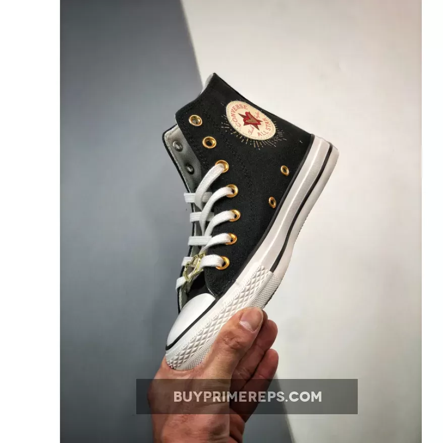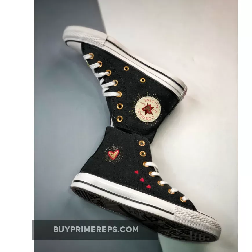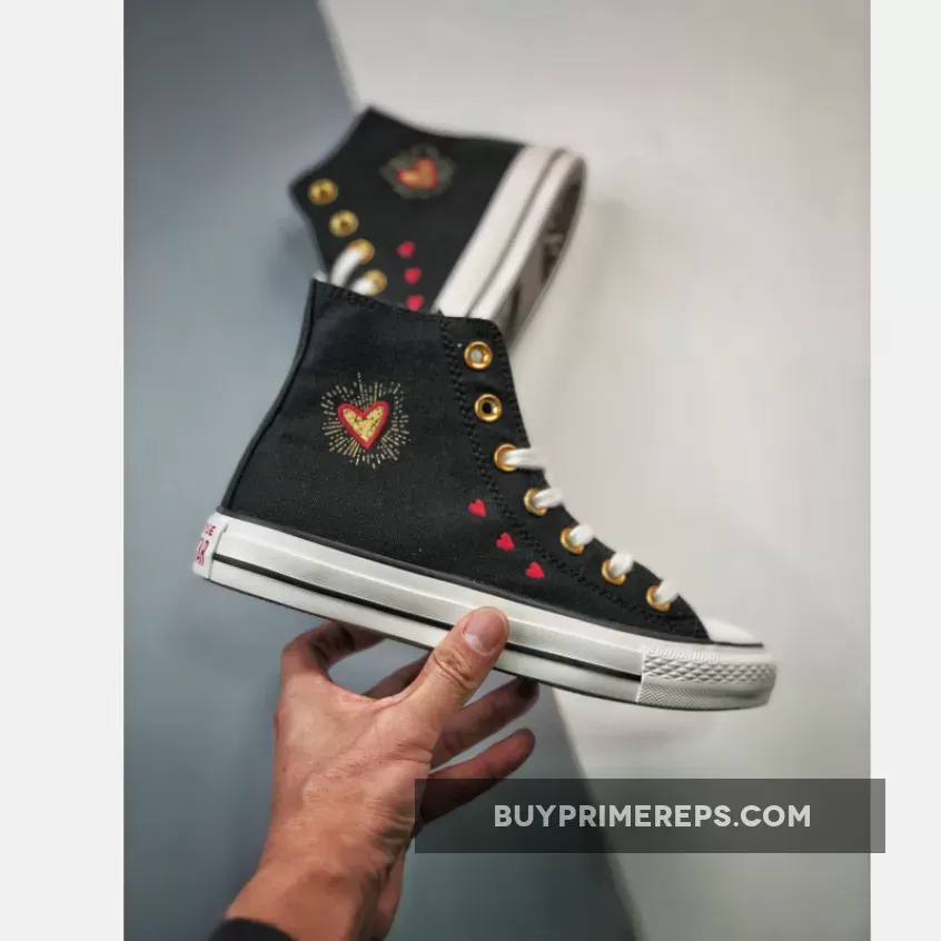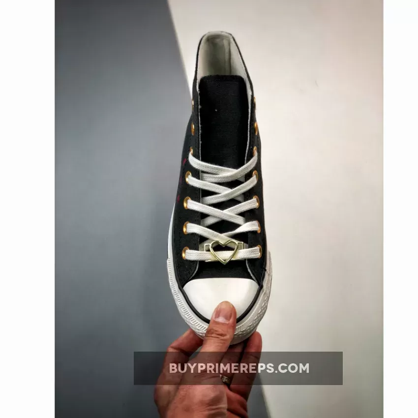 Featuring the timeless high-top design of the Chuck Taylor, this shoe is crafted with a breathable cotton canvas upper in a sleek black colorway. The dark hue provides a versatile backdrop for the striking metallic gold accents that add a touch of glamour to the overall look. The metallic gold eyelets and heart-shaped lace deubrés give the shoe a festive feel, perfect for celebrating love and style.