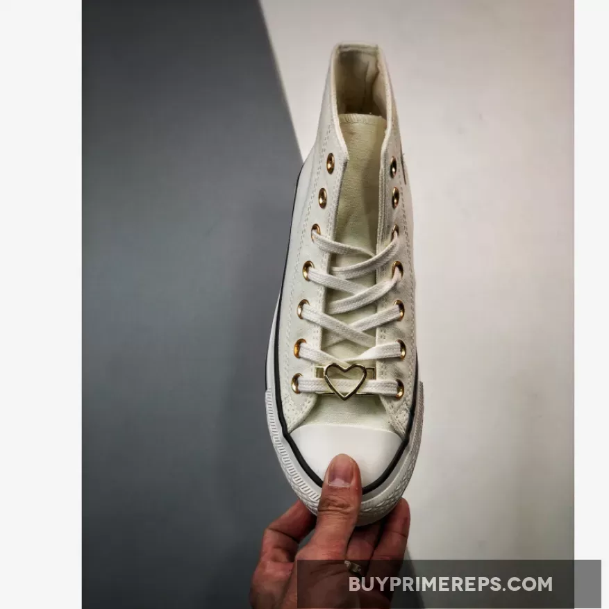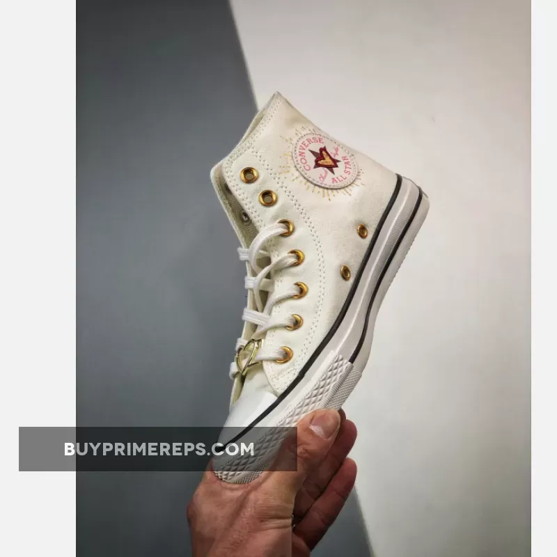 One of the standout features of this shoe is the gold hearts with black embroidered outlines on the lateral ankles. These hearts add a touch of elegance and charm to the overall design. On the medial sides of the shoe, you’ll find the iconic All Star patches adorned with baby pink branding and a gold star with a red-outlined heart on top. These details give the shoe a romantic and playful feel.