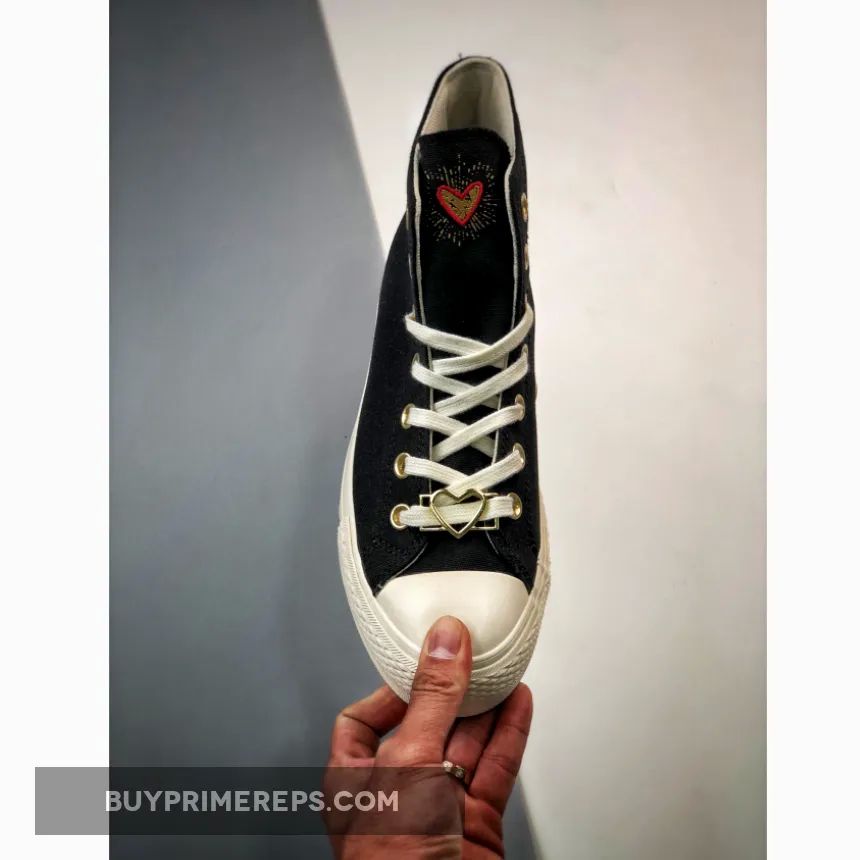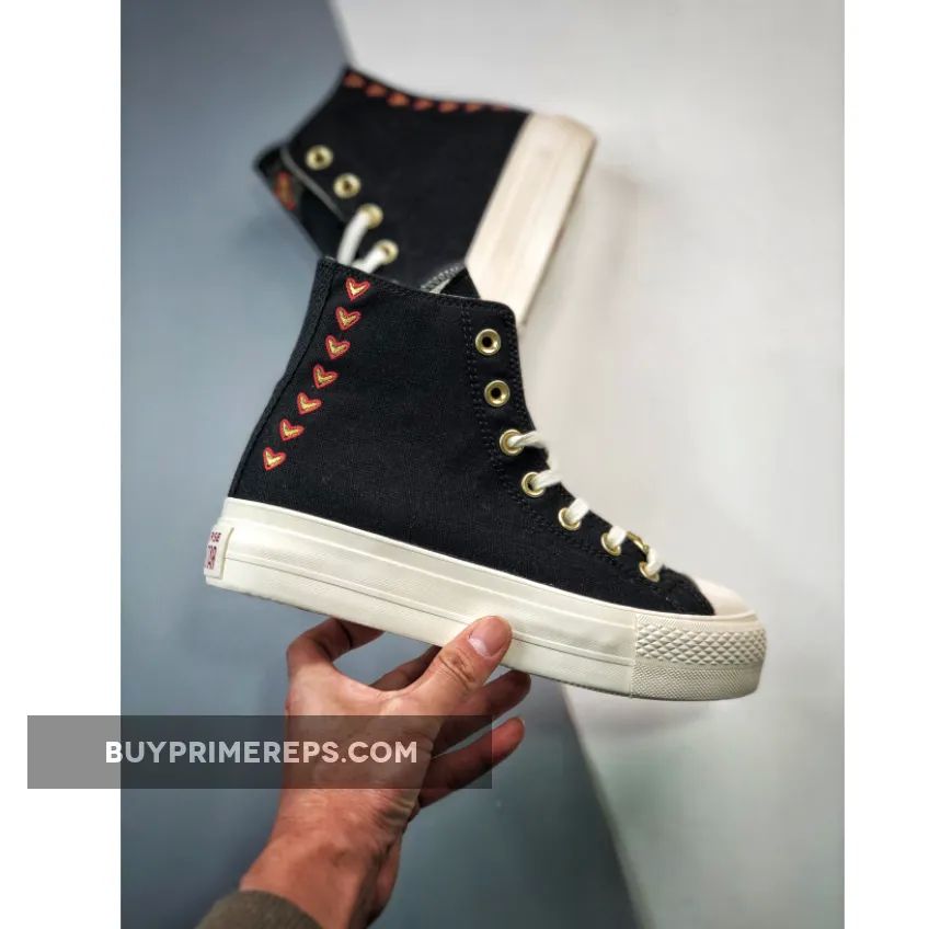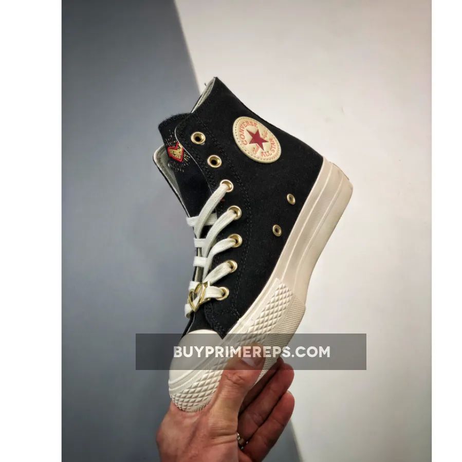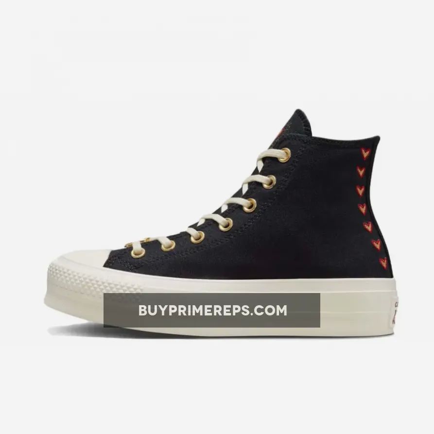 Introducing the Converse Chuck Taylor All Star Lift Platform Hearts High Top in Black. This stylish sneaker is part of Converse’s coveted Valentine’s Day collection and is sure to capture your heart. Boasting a high-top design, it features a sleek black canvas upper with a row of gold and black brick hearts adorning the lateral side of the heel spine.