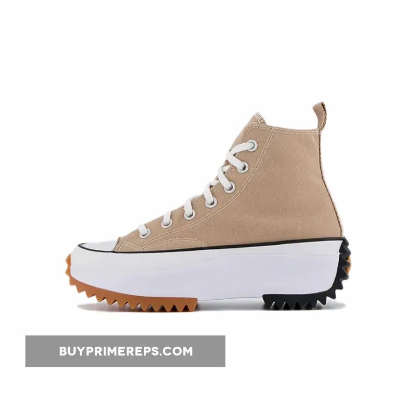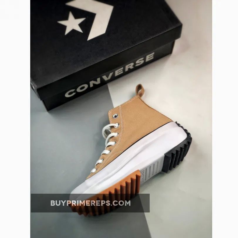 The Converse Run Star Hike High ‘Hemp’ is a stylish and sustainable sneaker that combines a classic Converse design with eco-friendly materials. Made with 100% recycled polyester, the upper of the shoe features a neutral tan color, giving it a natural and earthy look. The iconic All Star patch is present on the medial ankle, adding a touch of heritage to the modern design.