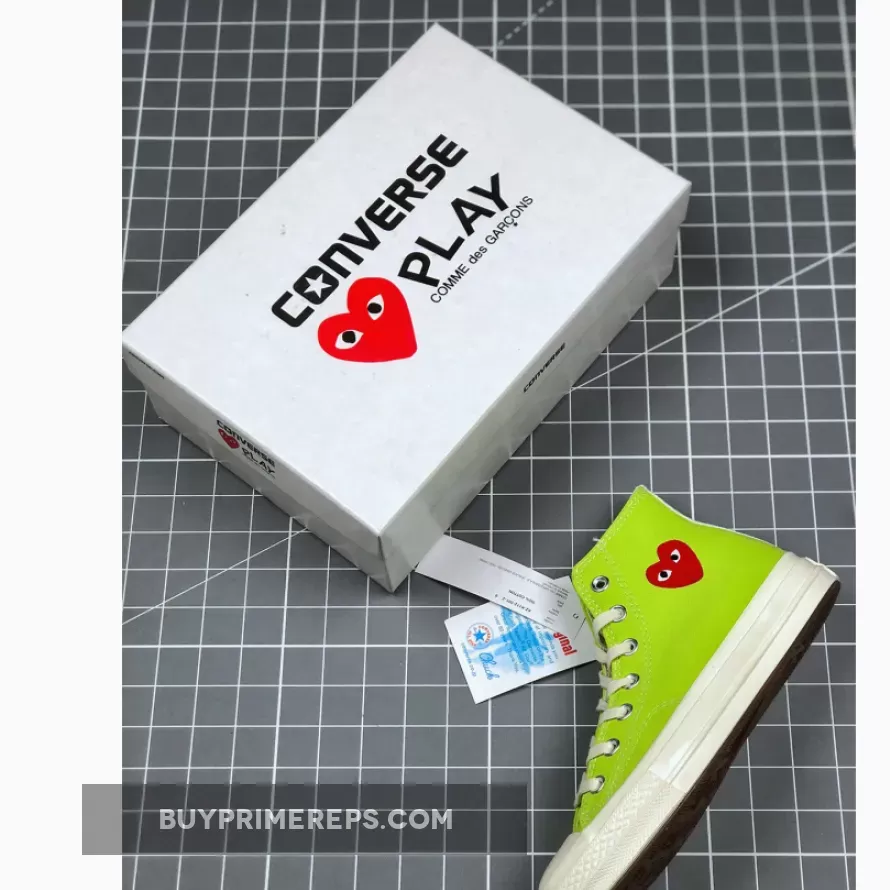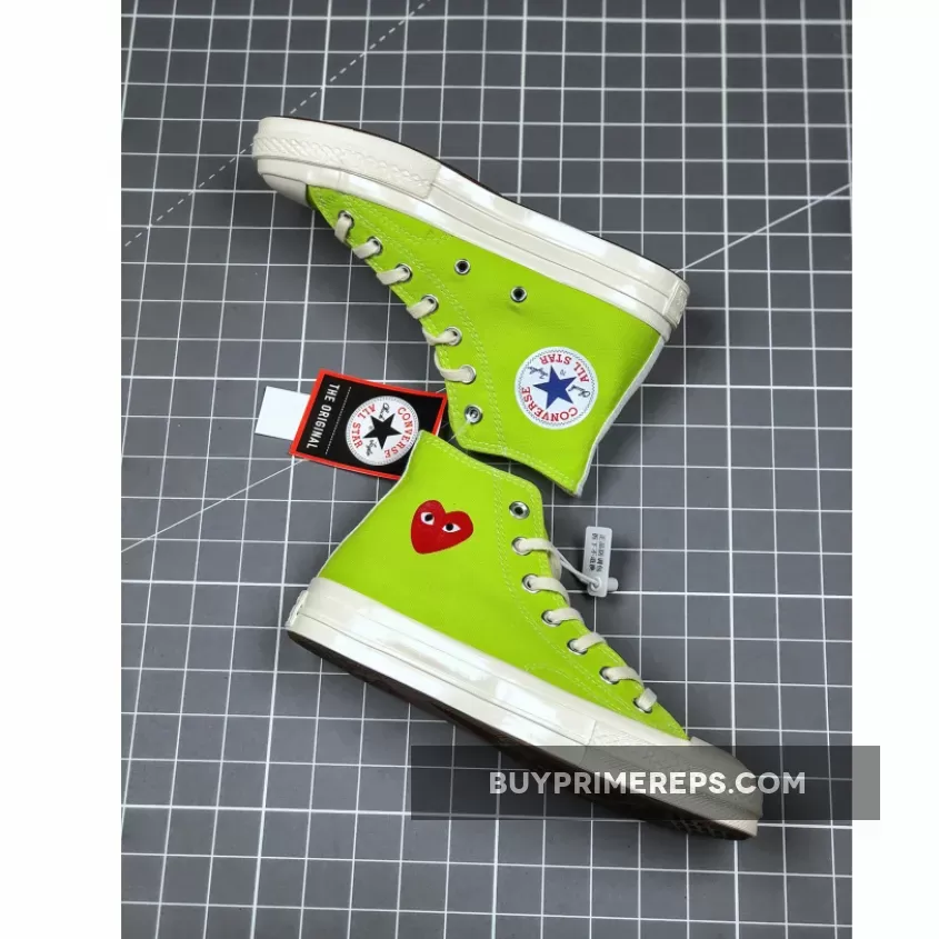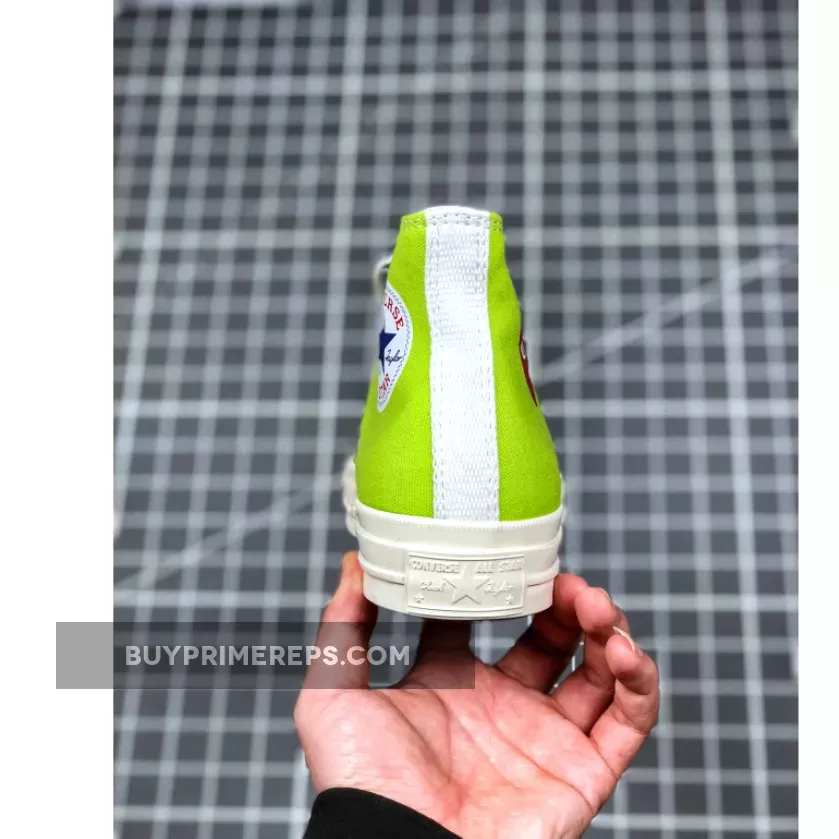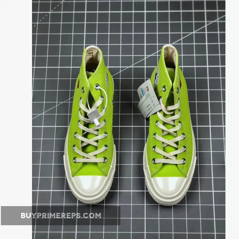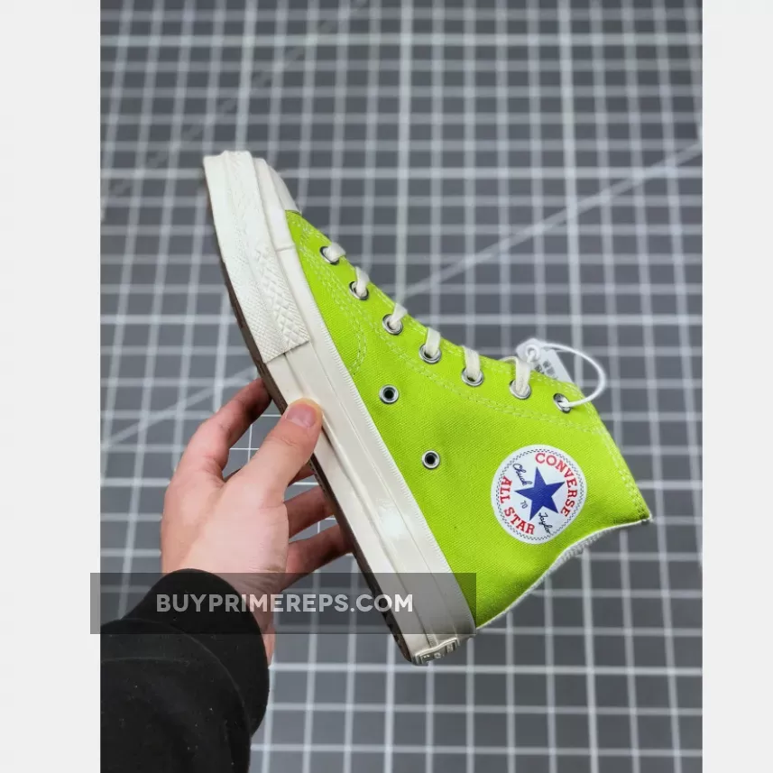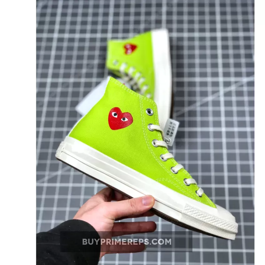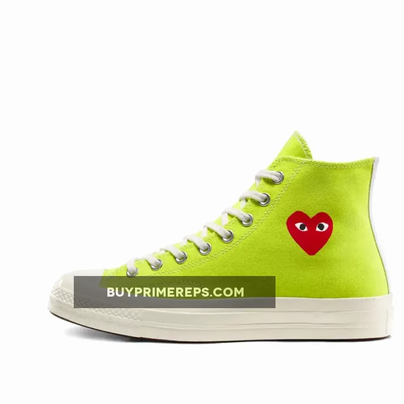 Overall, the Comme des Garcons Play x Converse Chuck Taylor All Star 70 High Bright Green is a statement sneaker that combines the unique design elements of Comme des Garcons Play with the timeless appeal of Converse. With its bold colorway and playful heart eyes motif, this collaboration is a must-have for fashion-forward individuals who want to make a statement with their footwear.