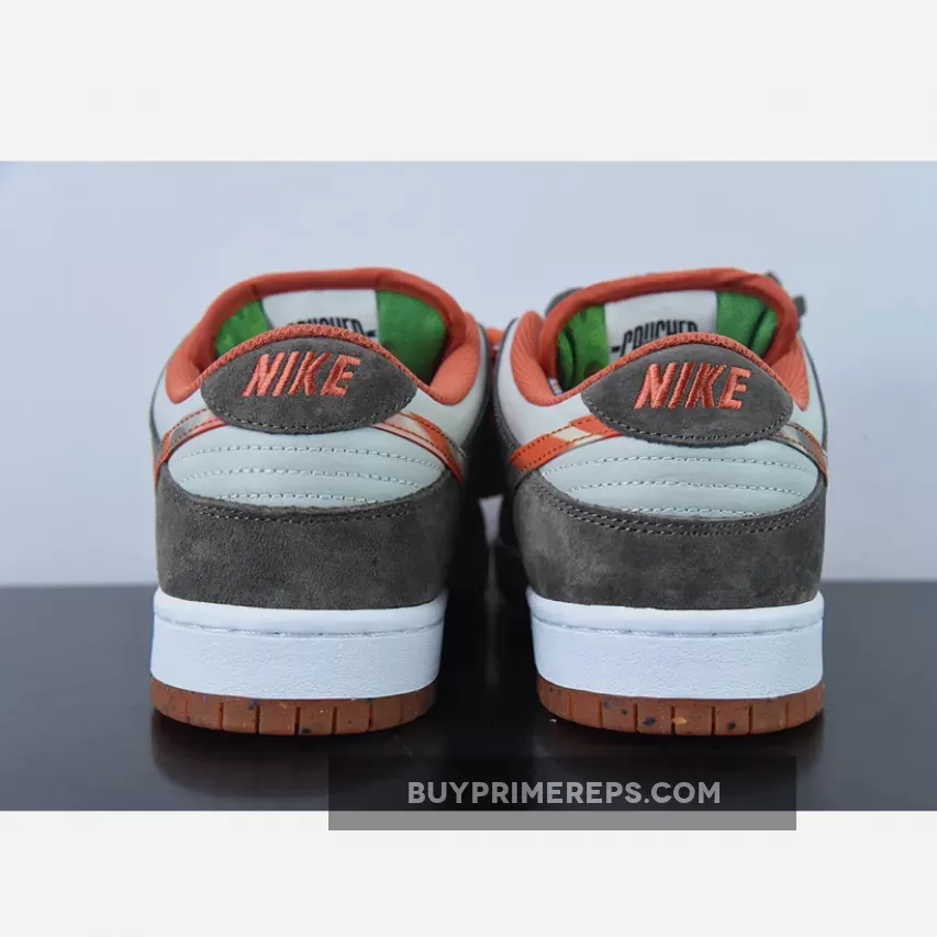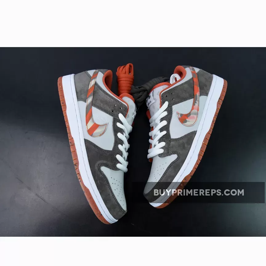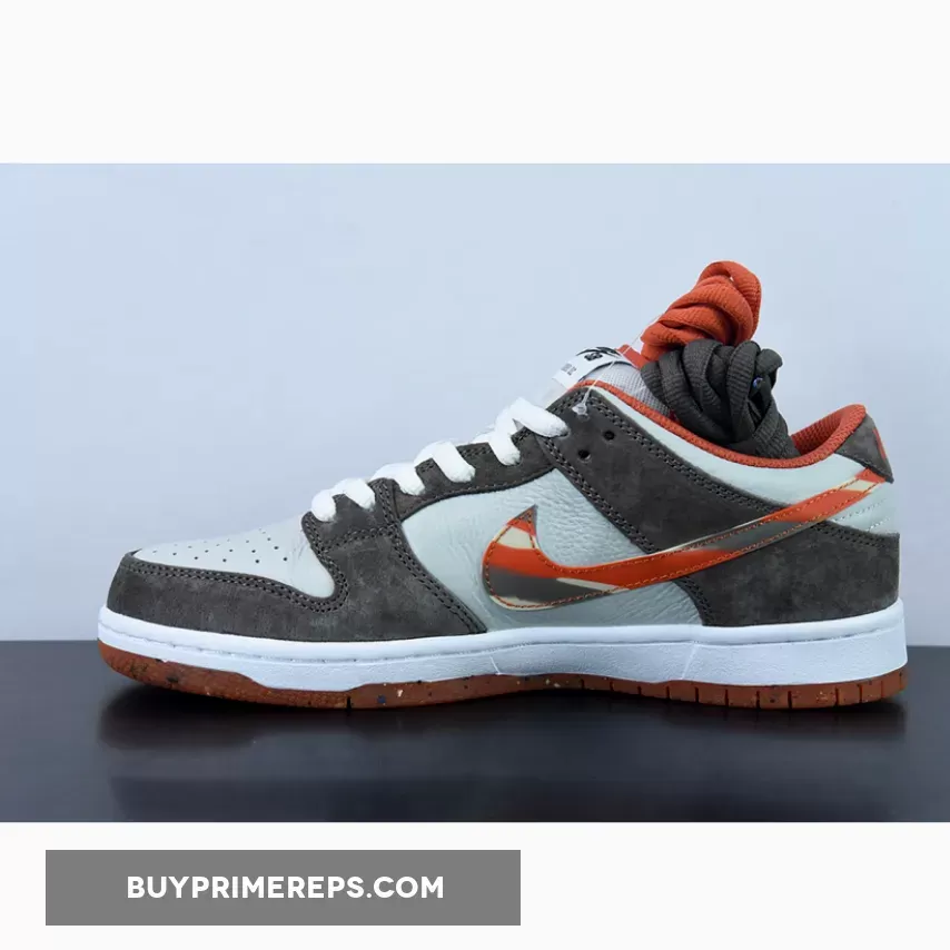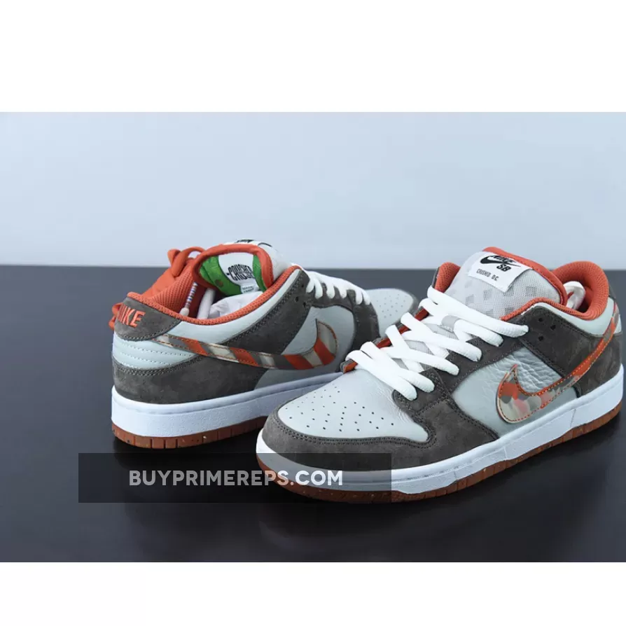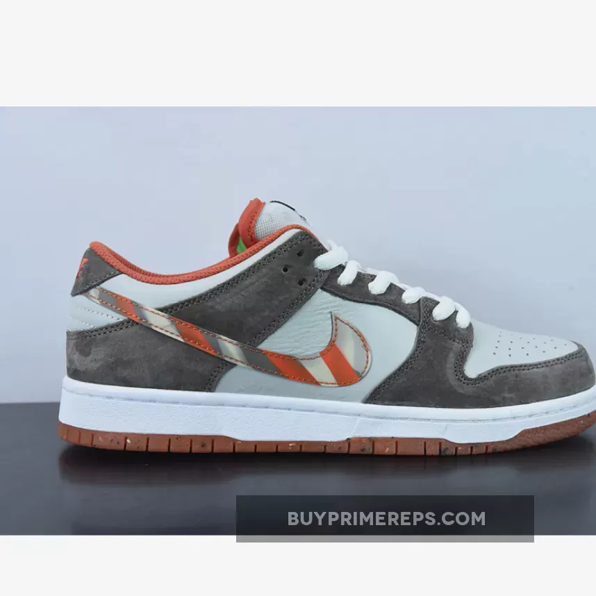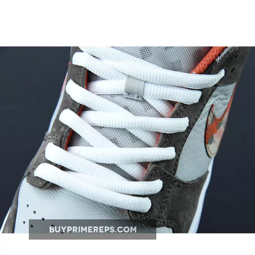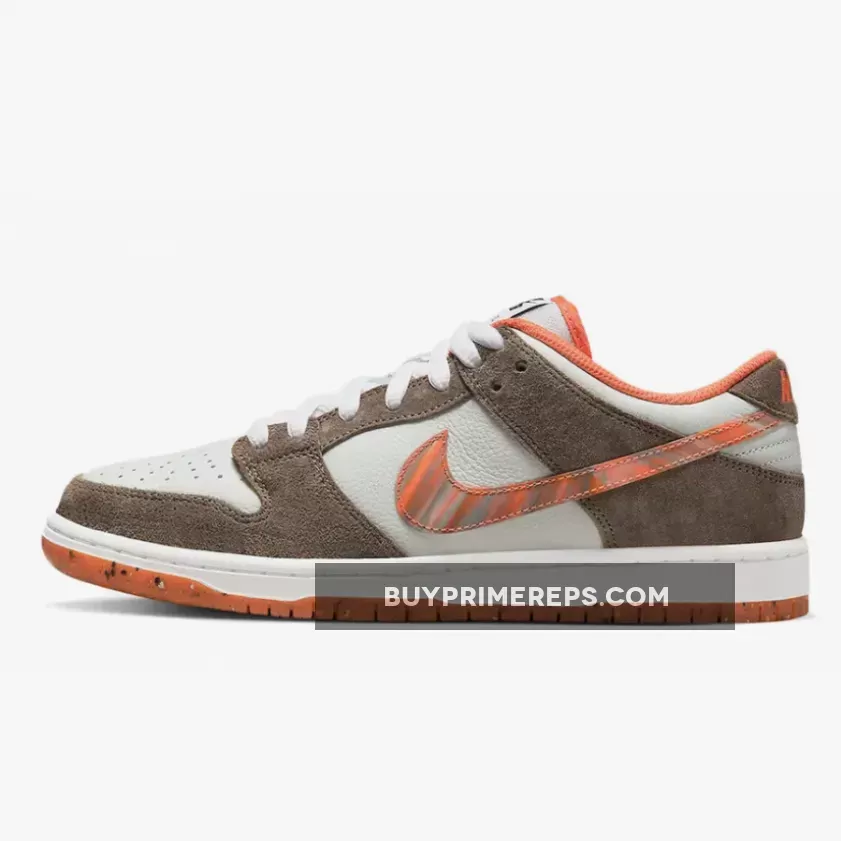 The Crushed D.C. x Nike SB Dunk Low showcases a striking combination of orange, white, and grey. The upper is constructed with tumbled leather, providing a durable and comfortable feel. The suede overlays add a touch of elegance to the design, giving it a luxurious appeal. The Swoosh logos on both the lateral and medial side of the shoe have an iridescent look, adding a touch of shimmer to the overall aesthetic.