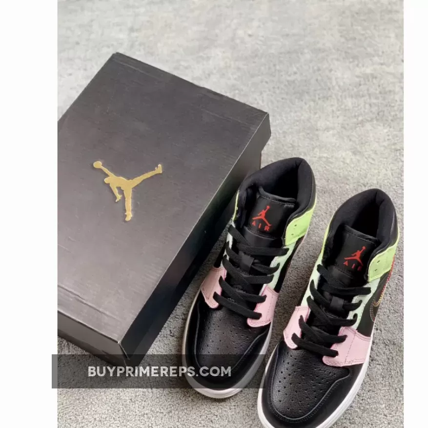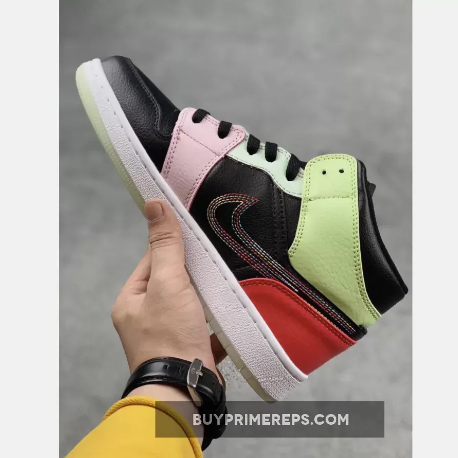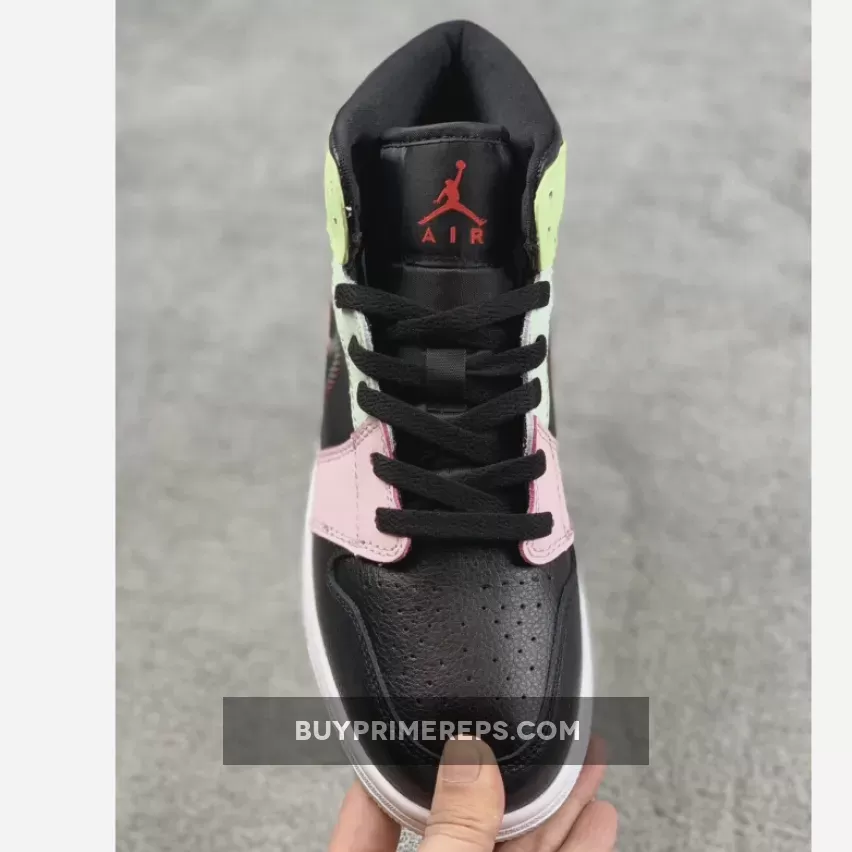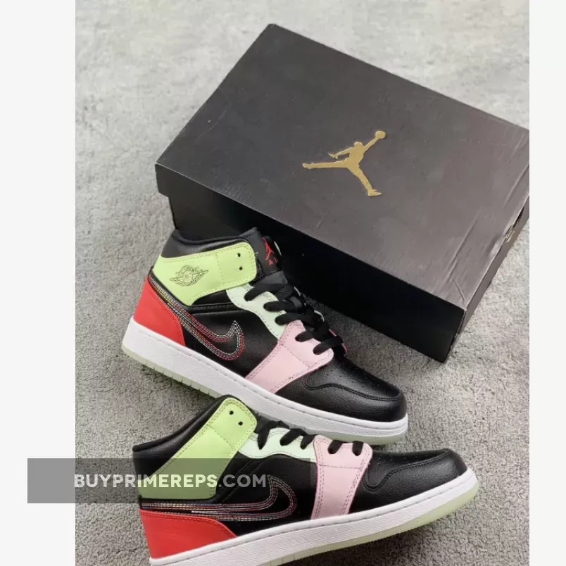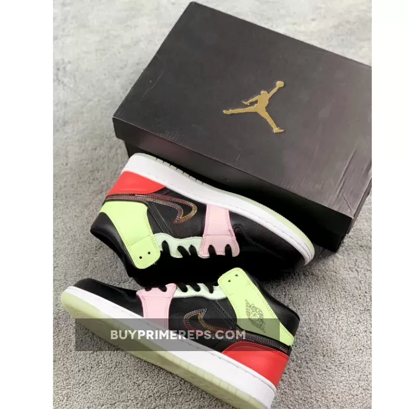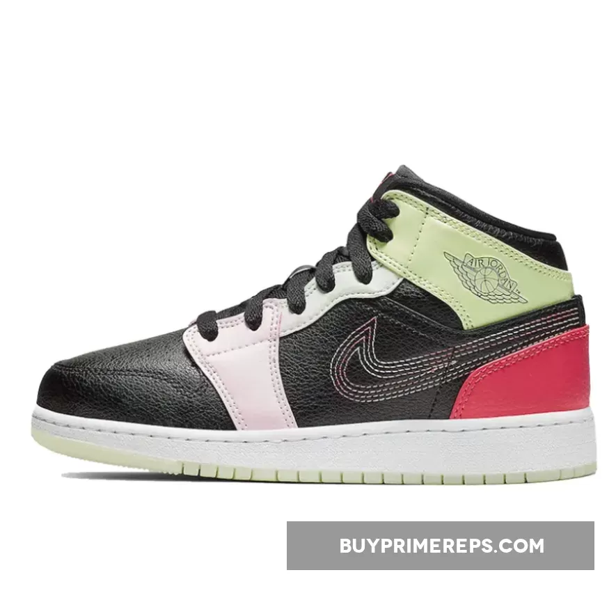 Introducing the Air Jordan 1 Mid GS Glow In The Dark, a striking and unique sneaker that will surely catch the attention of sneakerheads and collectors alike. This offering from Jordan Brand features a black leather upper that exudes a sleek and stylish vibe. But what sets this shoe apart is the addition of pastel pink, fluorescent yellow, and crimson overlays that add a pop of color and visual interest.