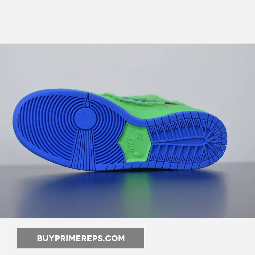 The standout feature of this shoe is its eye-catching design. The upper is made from a soft and fuzzy neon green faux fur, giving it a unique and bold look. Suede overlays are strategically placed to provide structure and add texture to the shoe. The Nike Swoosh, in electric blue, features a jagged edge design that mimics the jester collars worn by the Grateful Dead Bears. This detail adds a playful touch to the overall aesthetic.