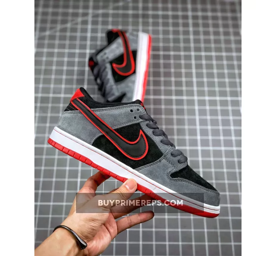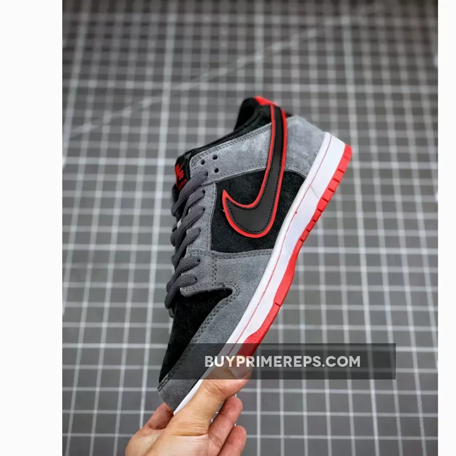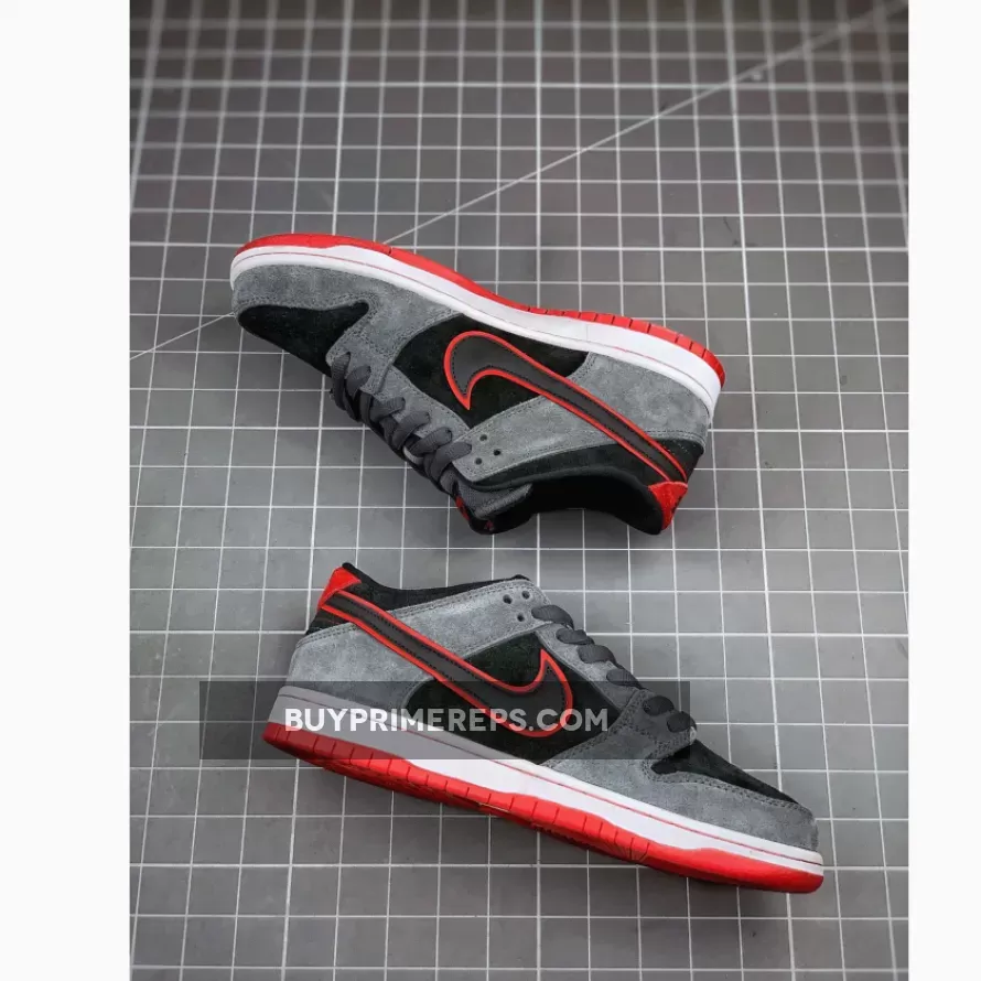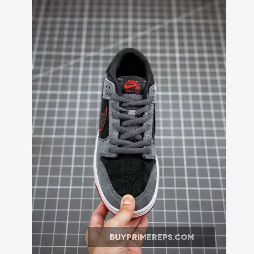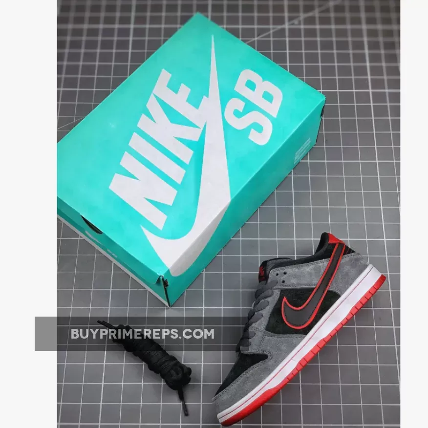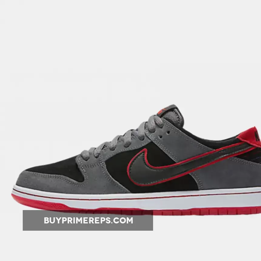 The Nike SB Dunk Low Pro Ishod Wair features a grey leather upper with black accents, creating a sleek and understated look. The double Swooshes on the sides of the shoe are outlined in red, adding a pop of color and visual interest. The heel tab at the rear also features red detailing, further enhancing the overall design.