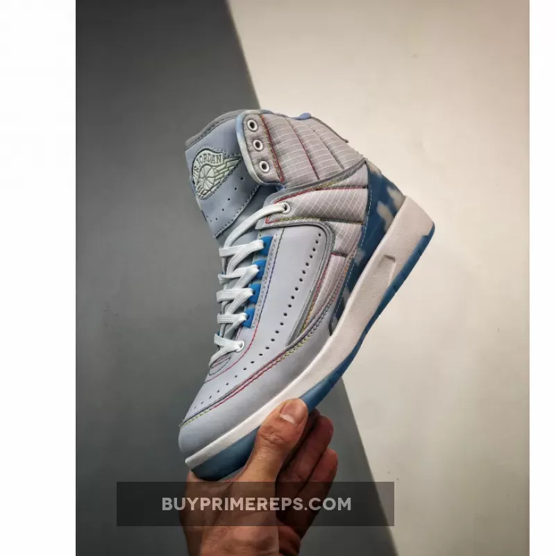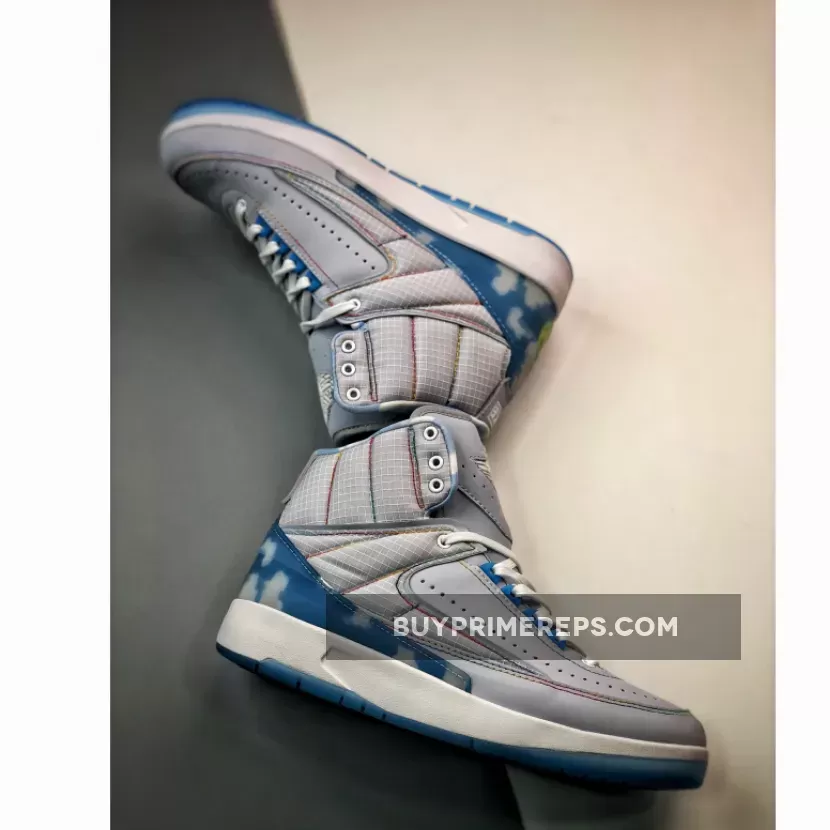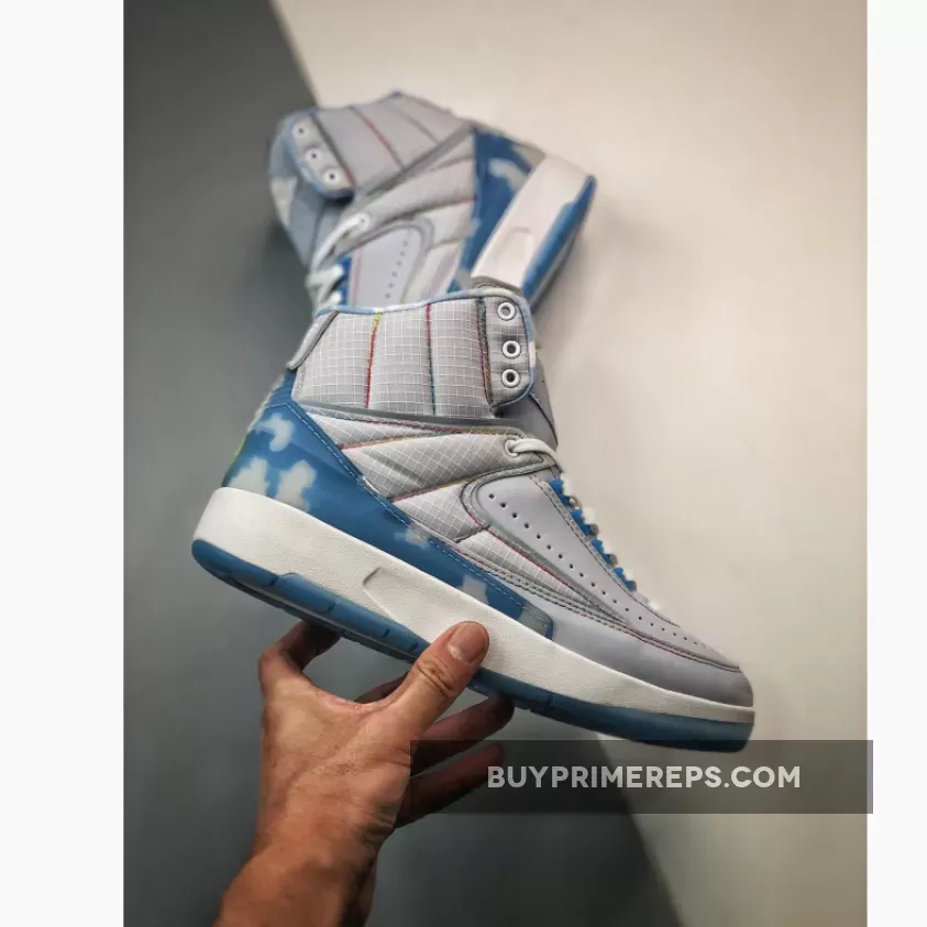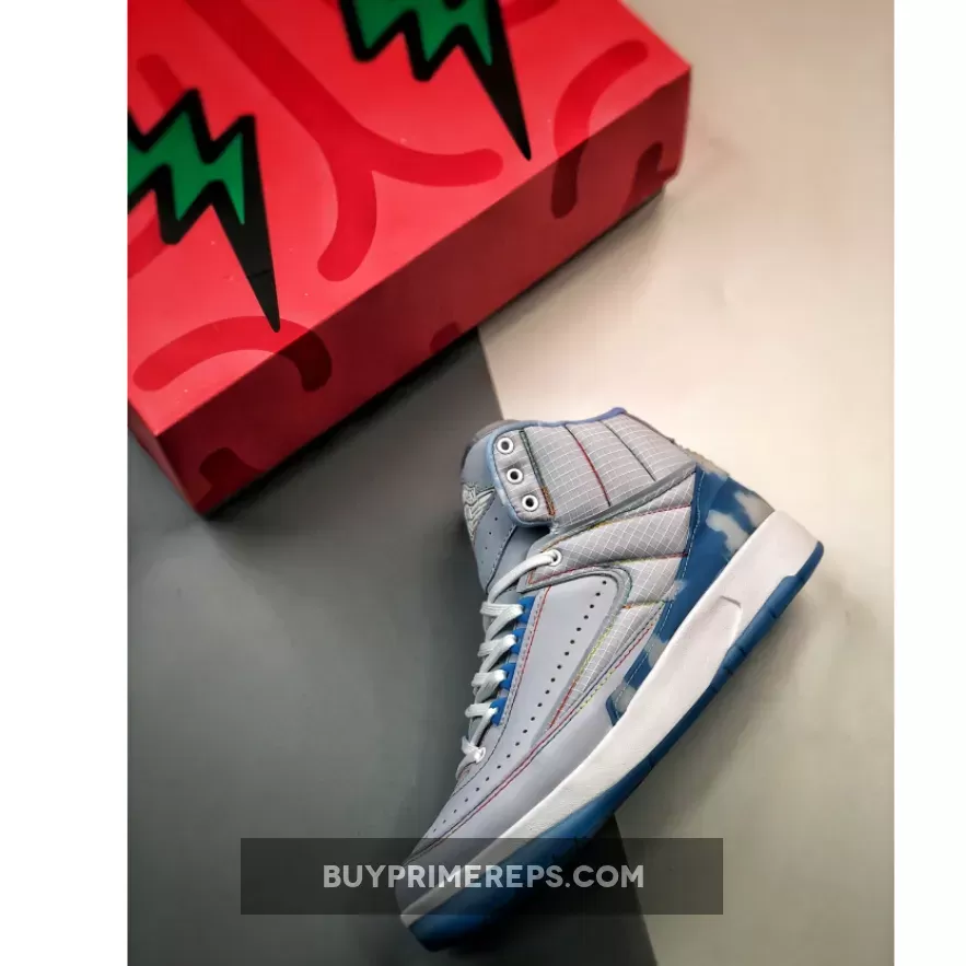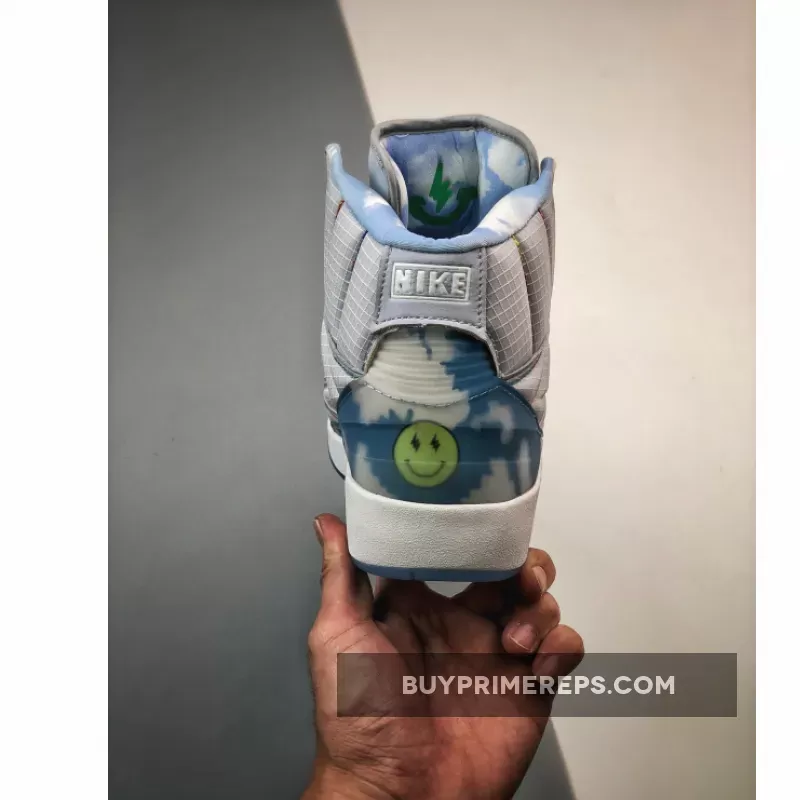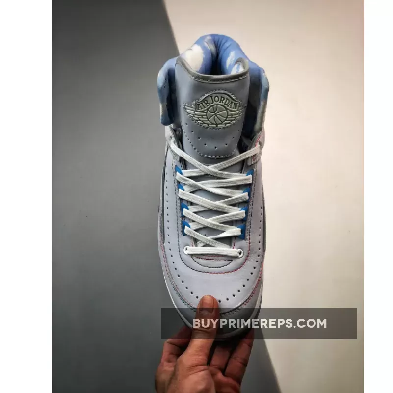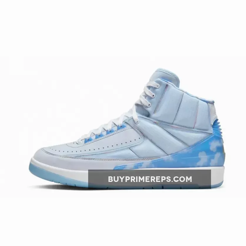 The J Balvin x Air Jordan 2 Blue is completed with a white midsole and a light blue rubber outsole, adding a clean and fresh finish to the design. The combination of the vibrant blue colorway, the cloud-inspired details, and the unique branding elements make this collaboration a must-have for fans of J Balvin and sneaker enthusiasts alike.