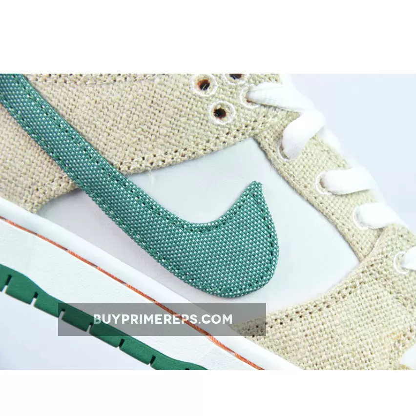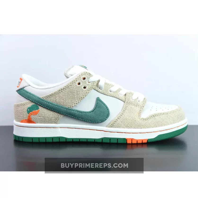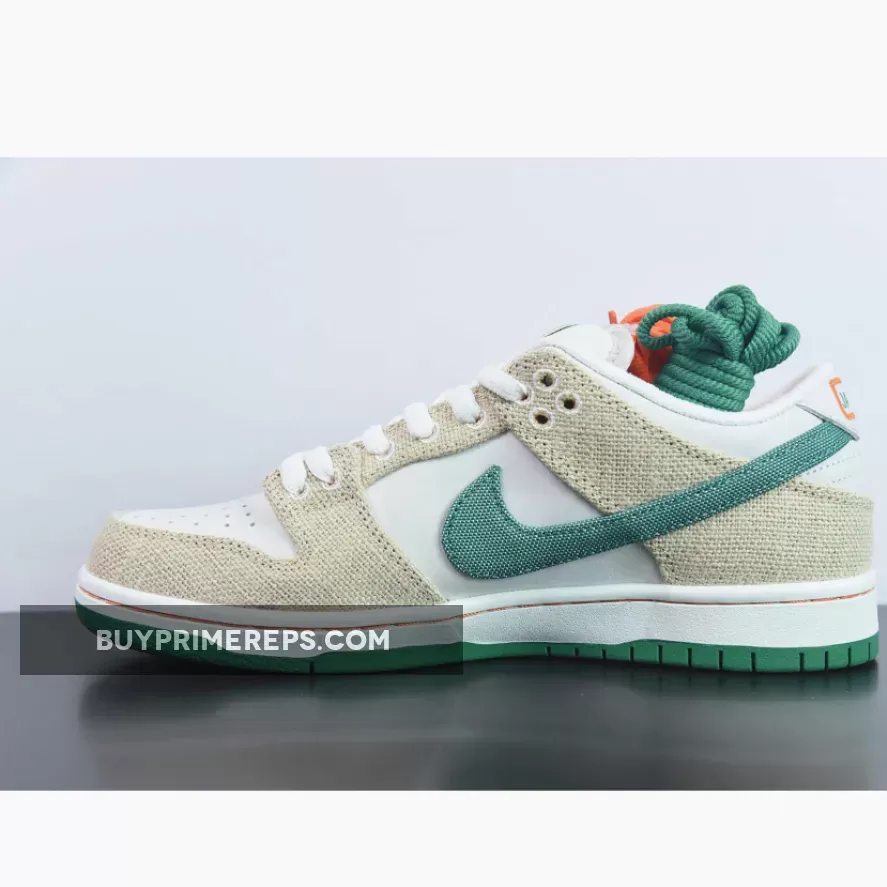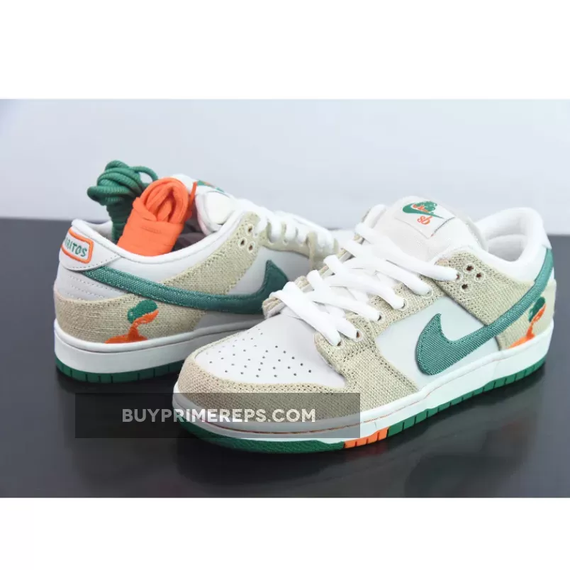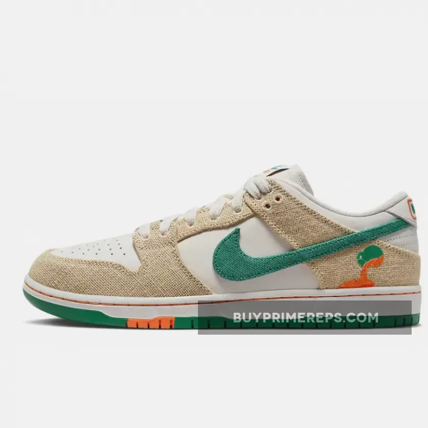 The Jarritos x Nike SB Dunk Low is a true tribute to the vibrant and playful nature of the soda brand. The sneaker features a clean white leather upper, giving it a classic and timeless look. But what sets this collaboration apart are the tear-away hemp overlays that cover the midfoot and heel. With the help of a precision knife included in the box, you can remove these overlays to reveal a stunning orange suede layer underneath, representing the signature color of Jarritos Mandarin soda.