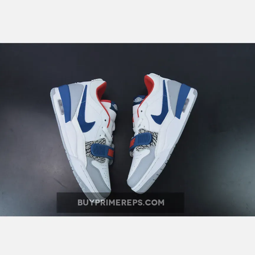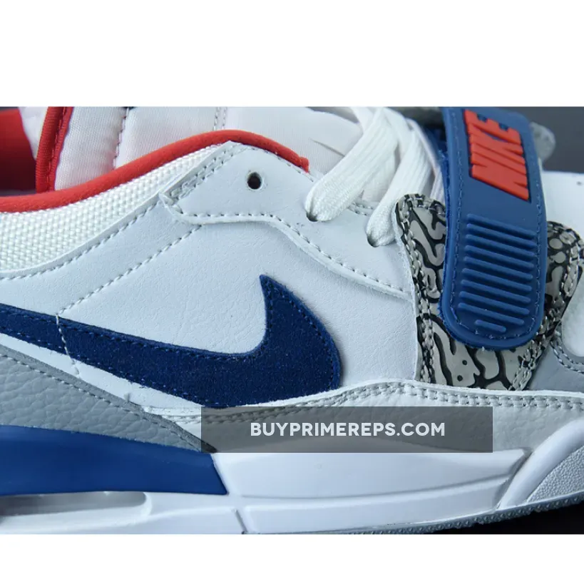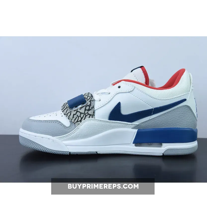 The French blue and university red accents on the shoe’s upper provide a vibrant pop of color, complementing the white base perfectly. Additionally, the grey detailing on the toe overlays and heels adds depth and contrast to the overall aesthetic. The Jumpman-branded heel tabs further enhance the Jordan Legacy 312’s branding and give a nod to its Jordan lineage.