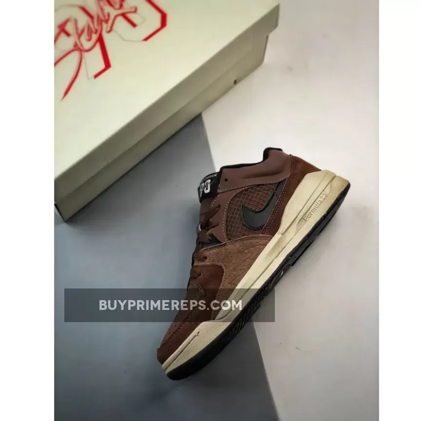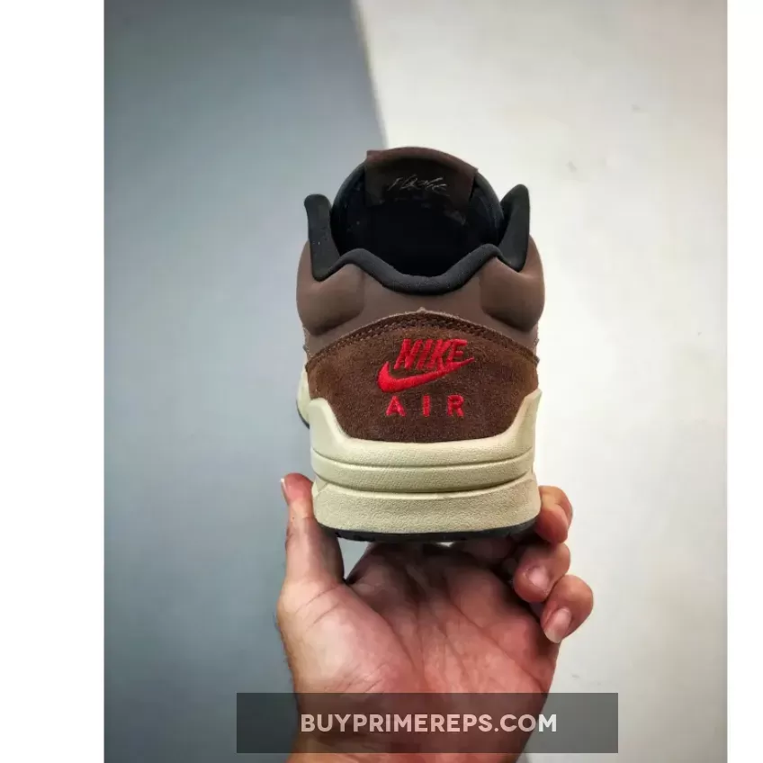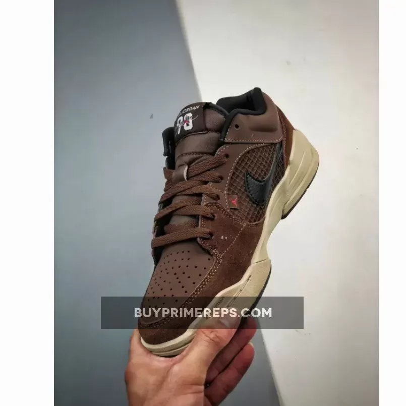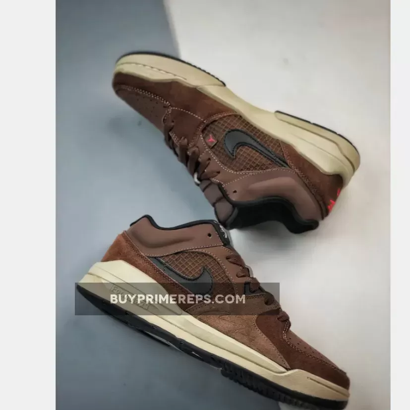 The colorway of the Jordan Stadium 90 “Baroque Brown” is a harmonious blend of neutral tones. The brown nubuck material and fuzzy suede overlays on the upper are complemented by black accents on the leather Swoosh and lateral midfoot eyestay. The netting on the sides is made of knit fabrics, reducing the weight of the shoe while adding a unique texture. Red tones appear on the medial Jumpman tag and Nike Air branding on the heel panel, providing a pop of color against the earthy backdrop. The midsole is a clean sail white, while the black rubber outsole completes the overall look.
