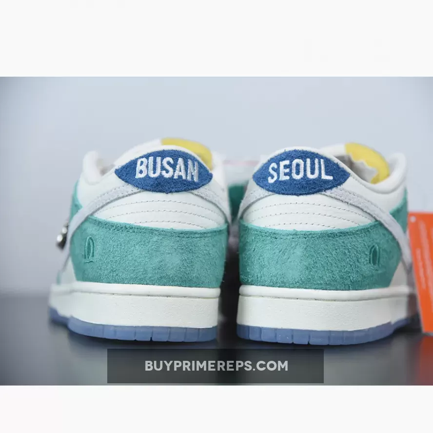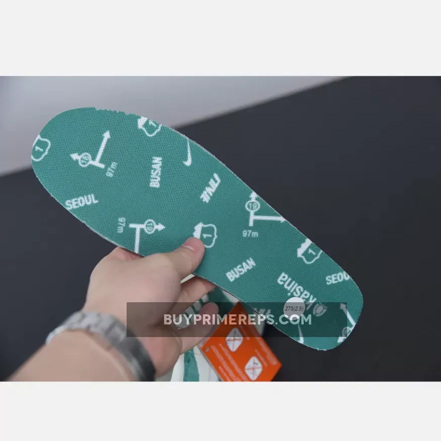 The upper of the sneaker combines off-white leather with Neptune Green suede overlays, creating a visually striking contrast. A grey suede Swoosh adds another layer of texture and depth to the design. The attention to detail is evident in the navy blue heel tabs, which replace the traditional Nike branding with ‘Busan’ and ‘Seoul’ on the left and right shoe respectively. This subtle nod to the personal roots of Kasina adds a touch of authenticity to the collaboration.