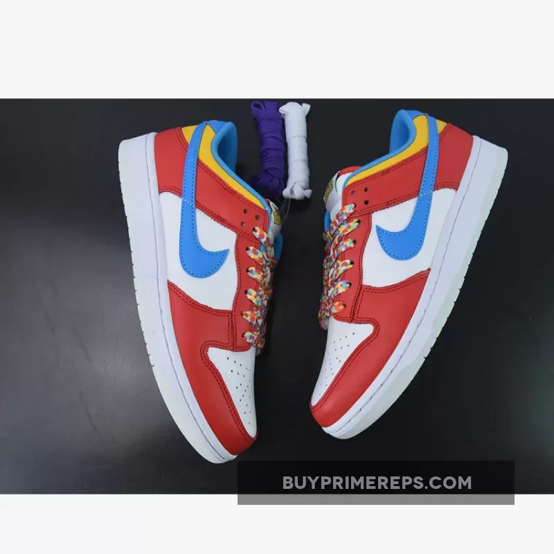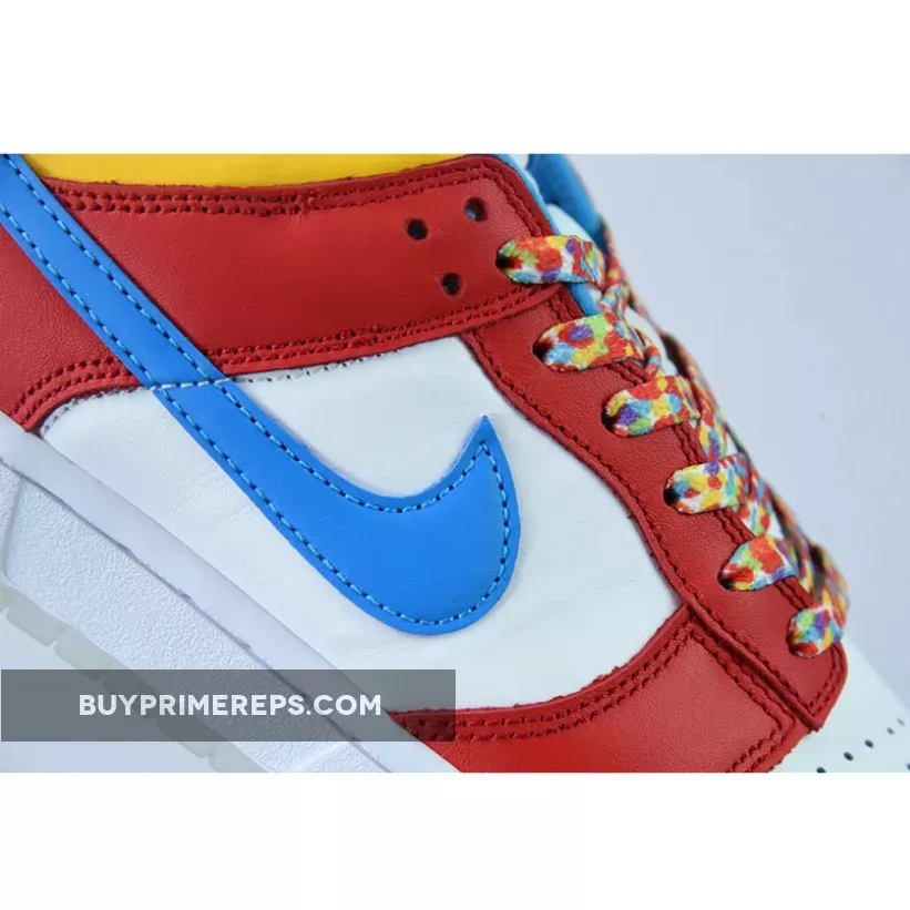 The design of the LeBron James x Nike Dunk Low “Fruity Pebbles” is a visual feast. The shoe features a white leather base with red overlays that cover the forefoot, throat, and heel. The vivid blue Swooshes add a bold contrast to the design, while the bright yellow collar adds an extra pop of color. The attention to detail is outstanding, with the Fruity Pebbles graphic appearing on the laces, insoles, and tongue tag. It’s a clever nod to the iconic cereal and adds a fun and playful touch to the overall design.