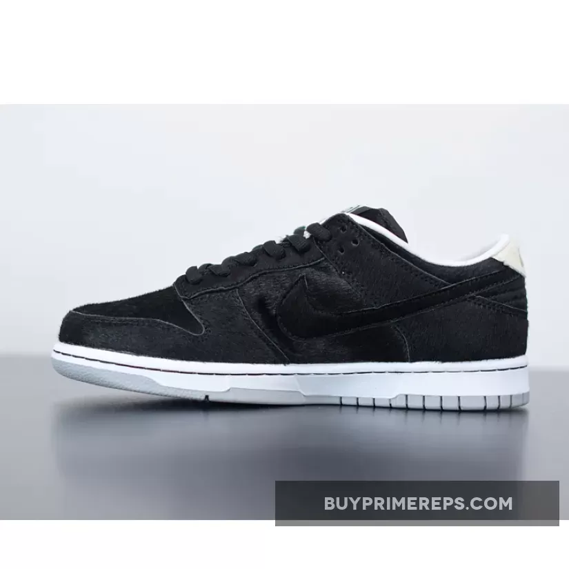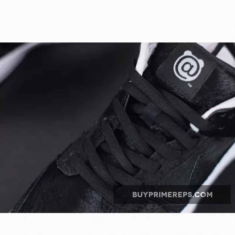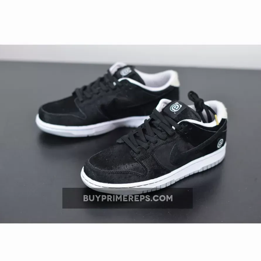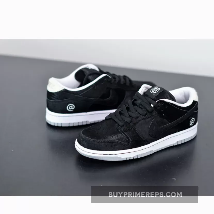 The SB Dunk Low Be@rbrick Black features a luxurious and eye-catching design. The upper is constructed with a combination of black pony hair and faux fur, giving it a unique and premium look. The black colorway is complemented by beige accents throughout, creating a striking contrast. Classic Dunk details such as the Swoosh logos and leather overlays remain intact, adding to the timeless appeal of this shoe.