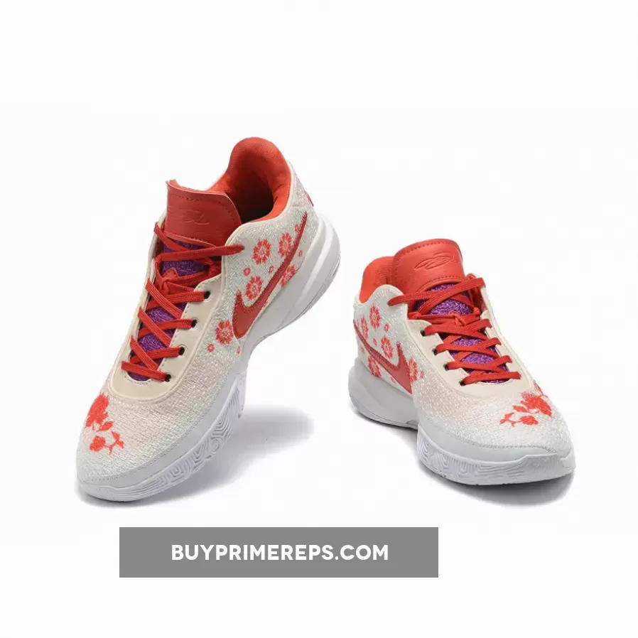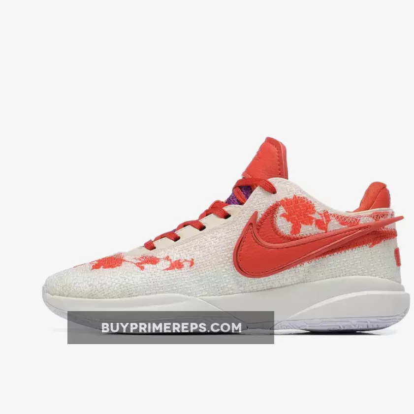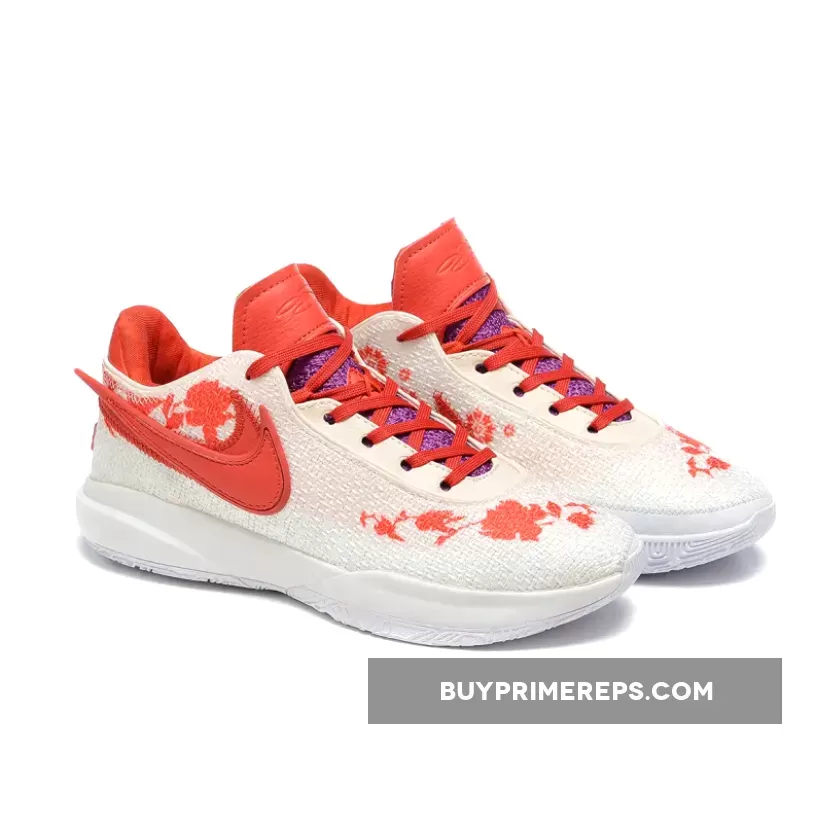 Inspired by the designer’s signature artistry, the LeBron 20 features a vibrant color palette of Guava Ice, Bright Crimson, Bordeaux, Bold Berry, and White. These hues dance across the shoe’s surfaces, creating a stunning visual interplay. Ornate floral patterns, multi-colored laces, and embroidered details further elevate the aesthetic.