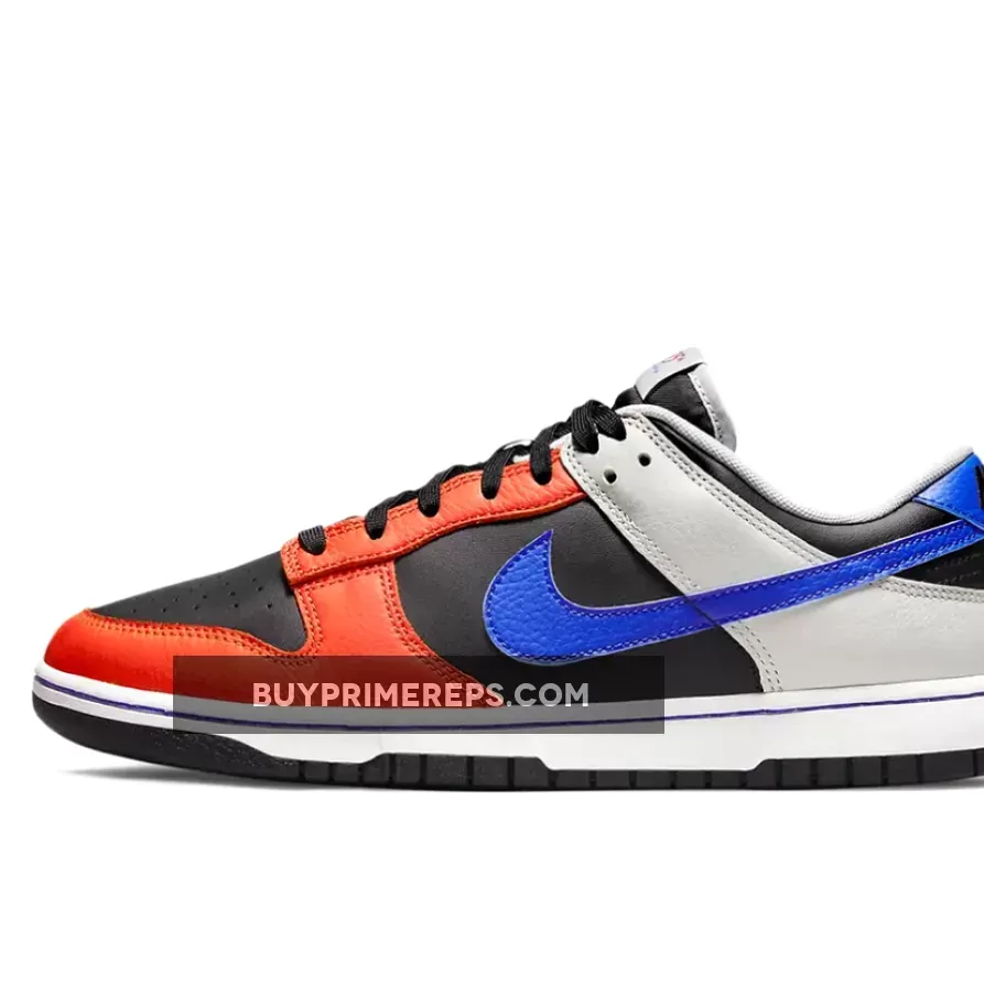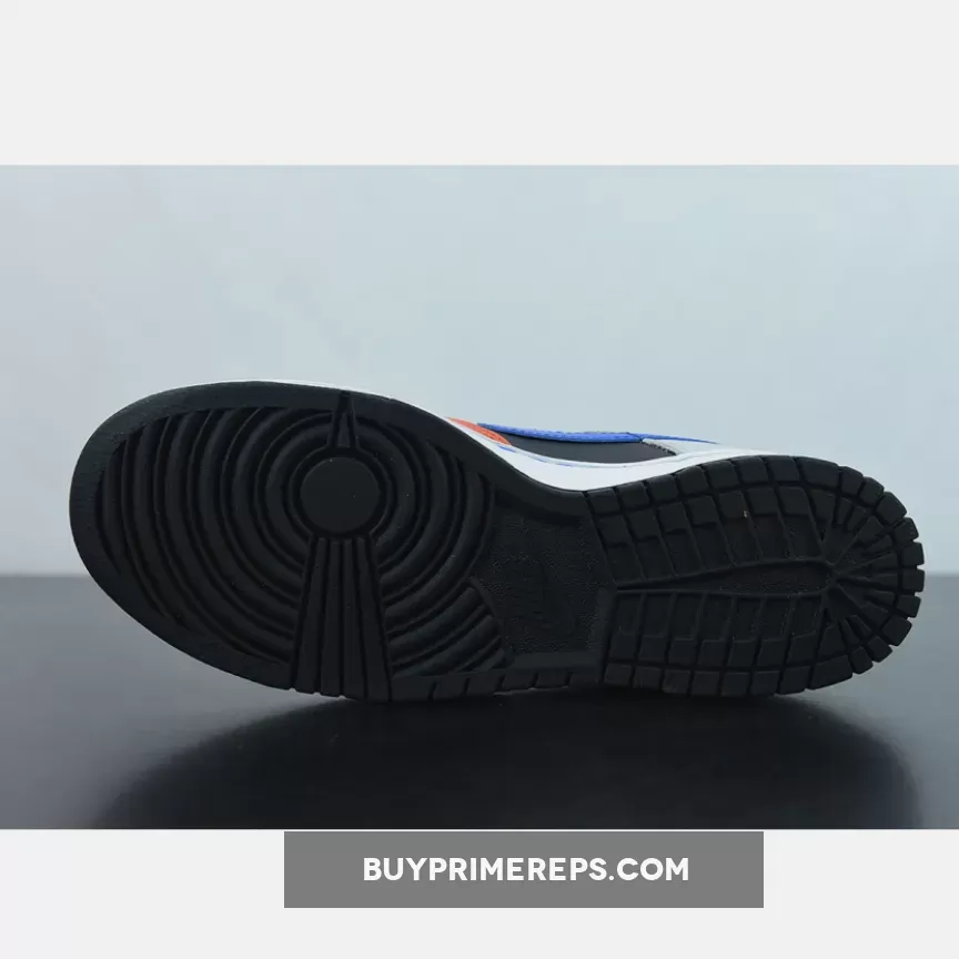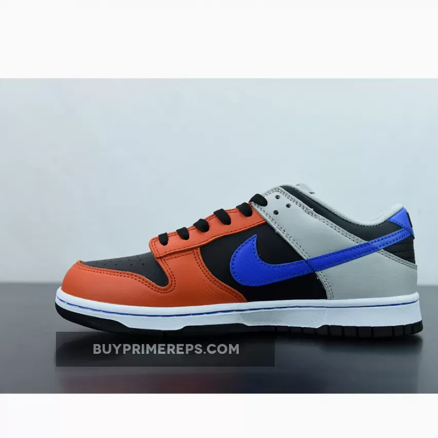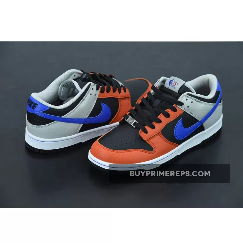 The NBA x Nike Dunk Low EMB Knicks features a sleek, low-top silhouette constructed with a full-smooth leather upper. The black toe boxes, quarter panels, and collars provide a clean canvas for the vibrant blue, orange, and grey accents that adorn the toe caps, Swoosh logos, and rear segments. These colors are a nod to the signature colors of the New York Knicks, one of the most storied franchises in NBA history.