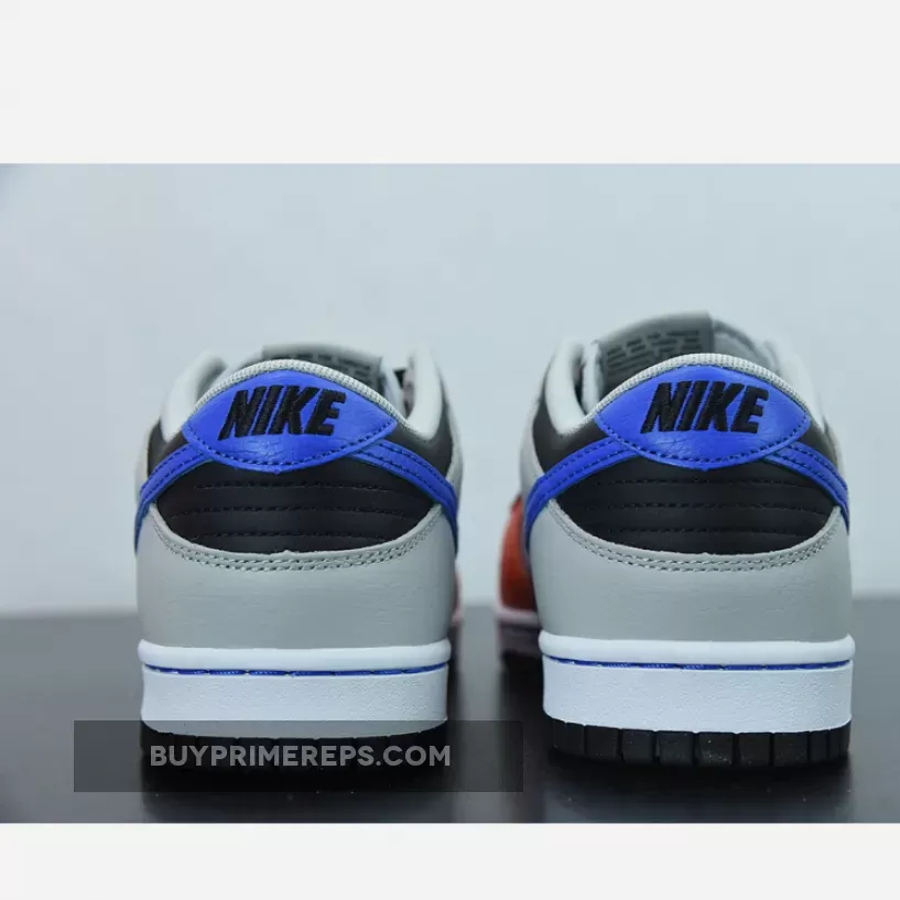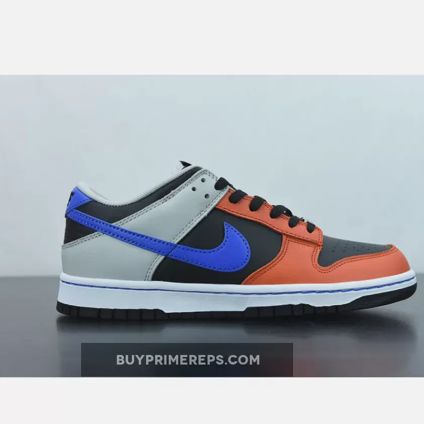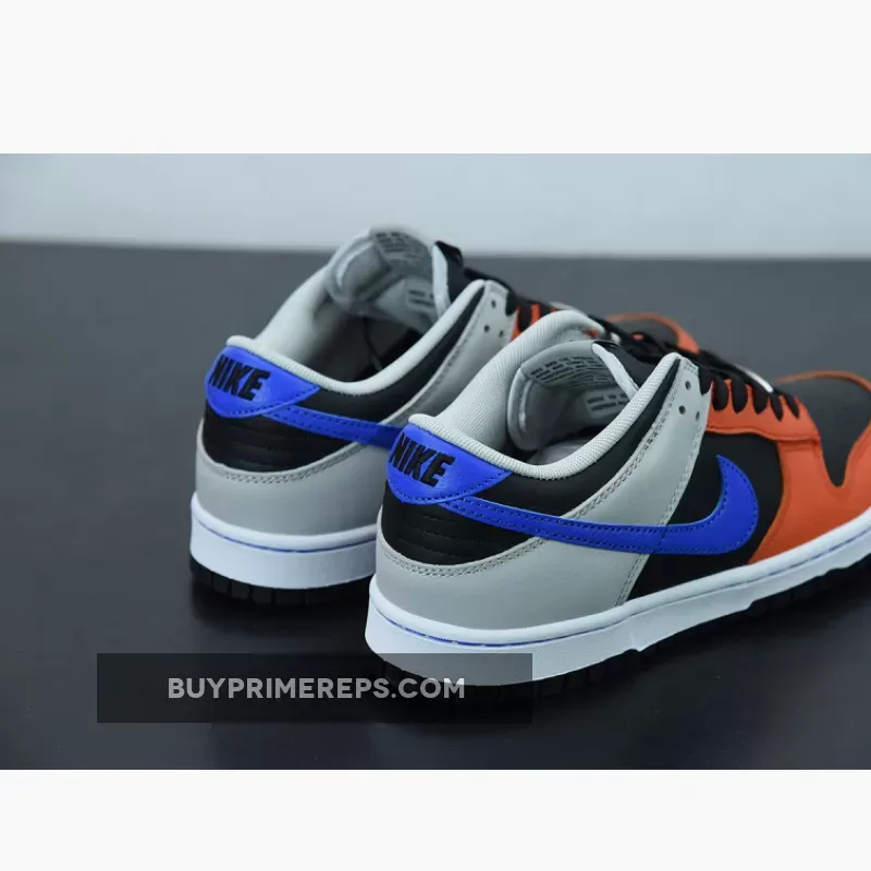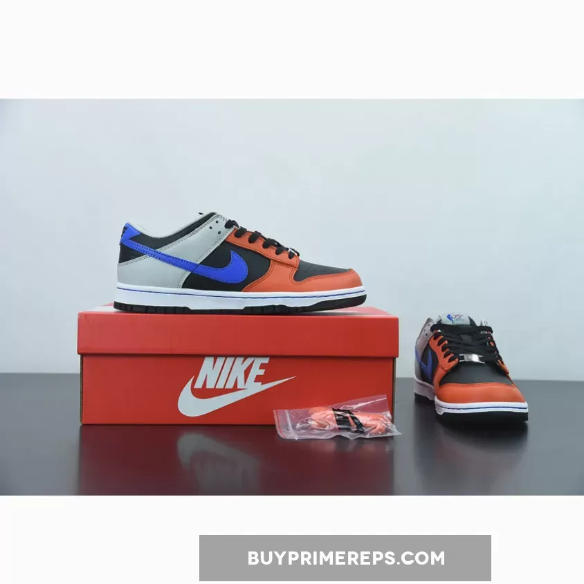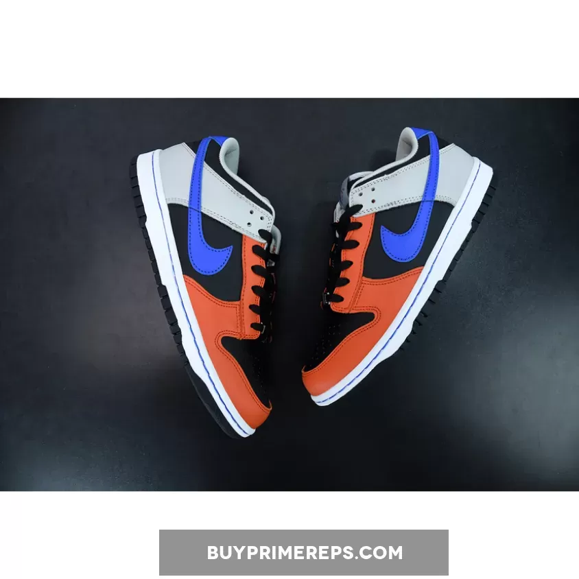 The NBA x Nike Dunk Low EMB Knicks features a sleek, low-top silhouette constructed with a full-smooth leather upper. The black toe boxes, quarter panels, and collars provide a clean canvas for the vibrant blue, orange, and grey accents that adorn the toe caps, Swoosh logos, and rear segments. These colors are a nod to the signature colors of the New York Knicks, one of the most storied franchises in NBA history.