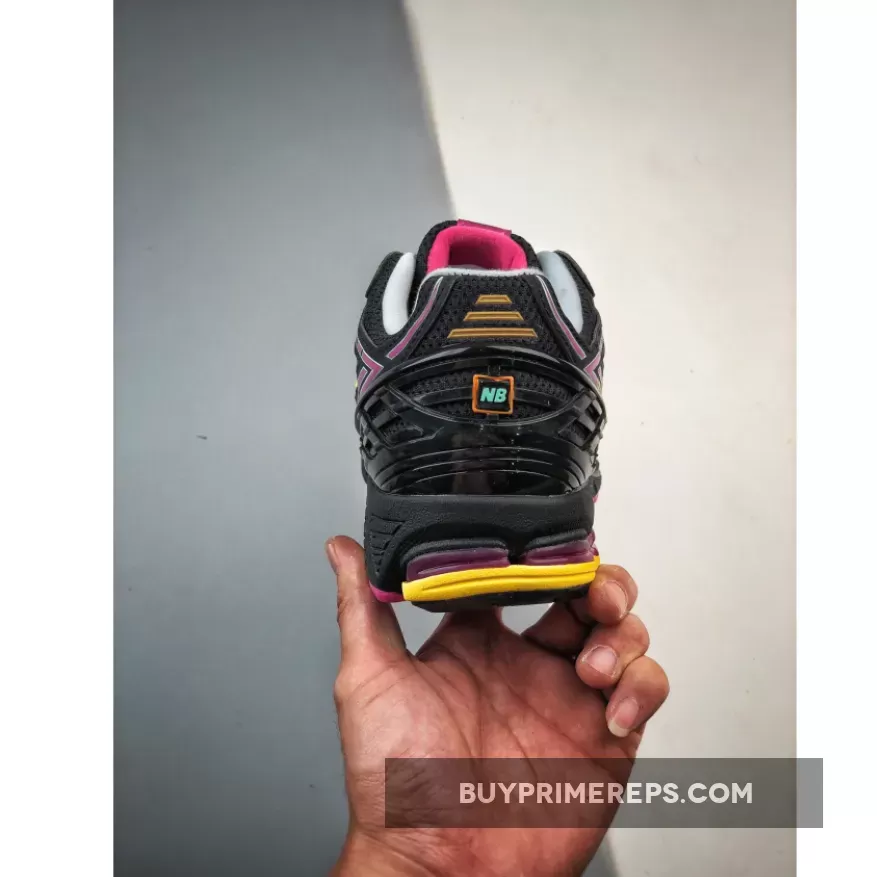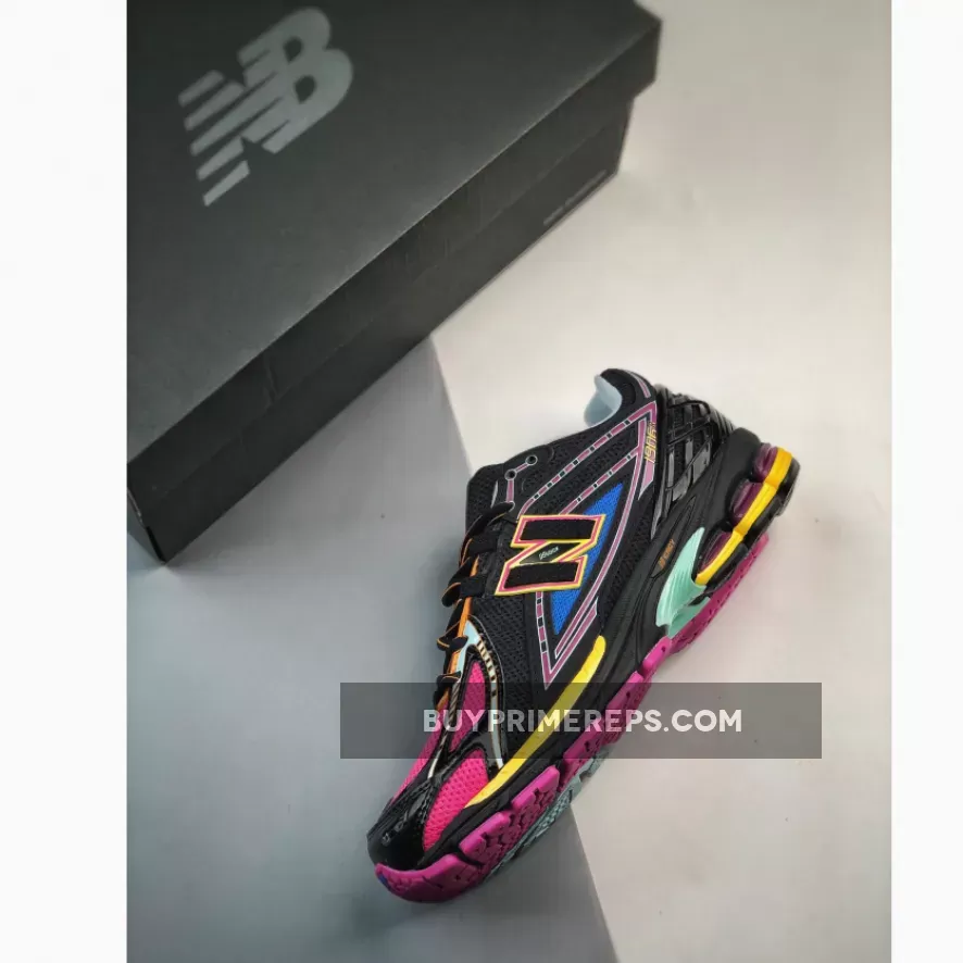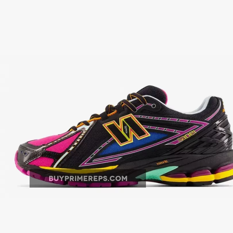 But what really sets the 1906R apart is its striking neon accents. Royal blue and hot pink hues are strategically placed throughout the shoe, creating a mesmerizing pattern that’s sure to turn heads. And don’t miss the golden yellow accents and N-lock branding on the side panels – it’s a subtle touch that adds an extra layer of cool.