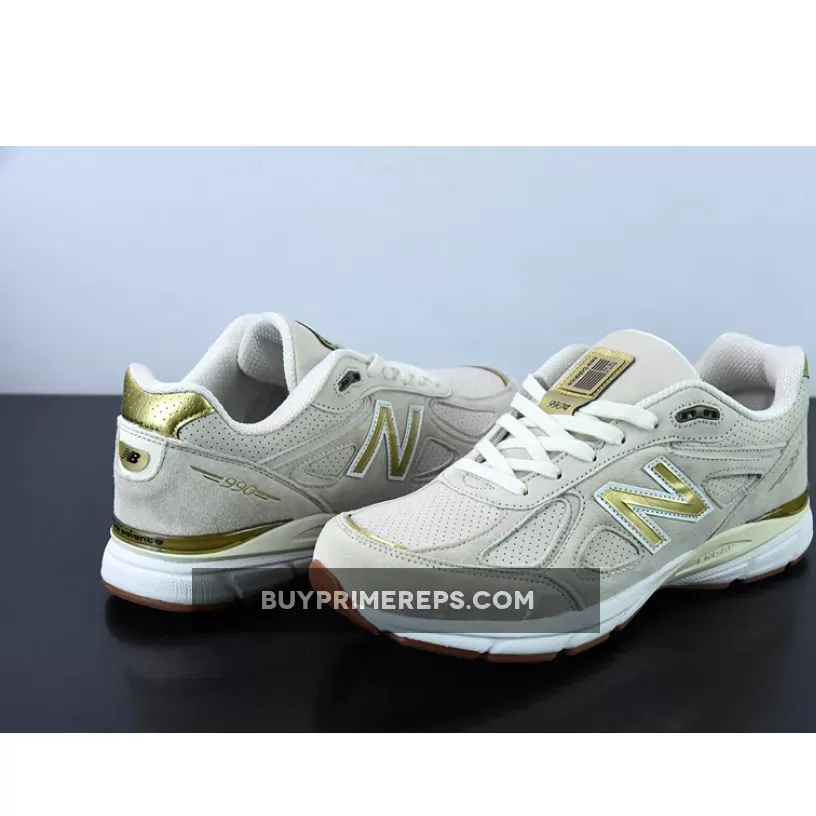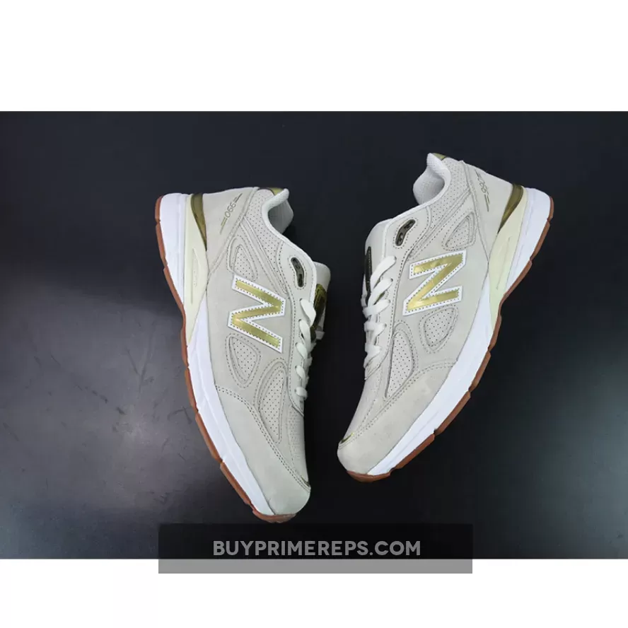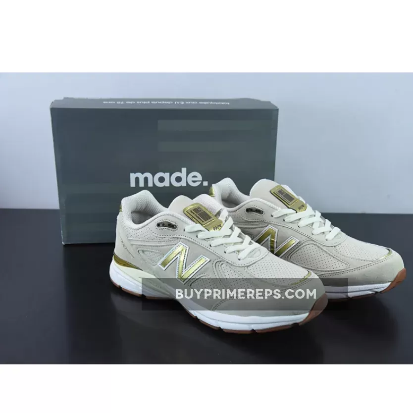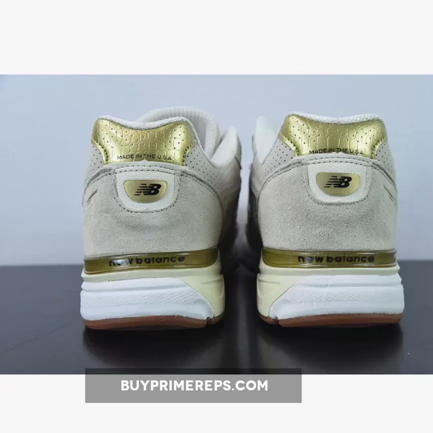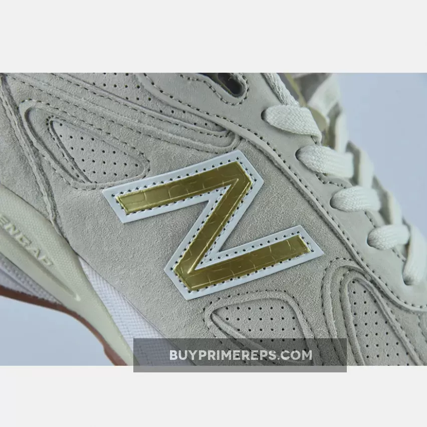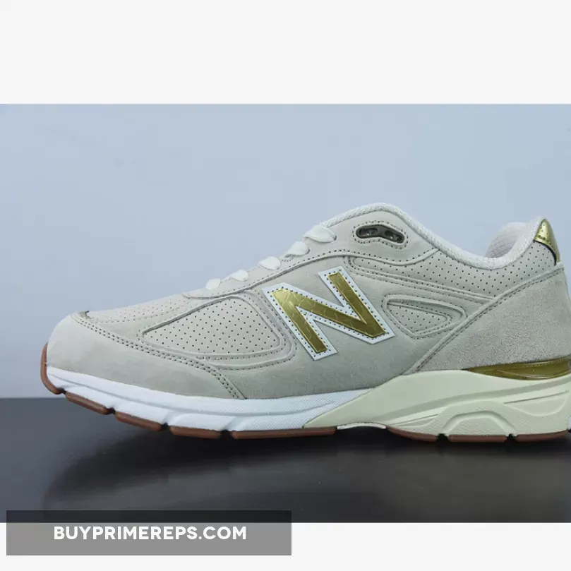 The iconic New Balance “N” symbol shines in metallic gold, outlined with white trim. This elegant combination adds a touch of sophistication to the design.