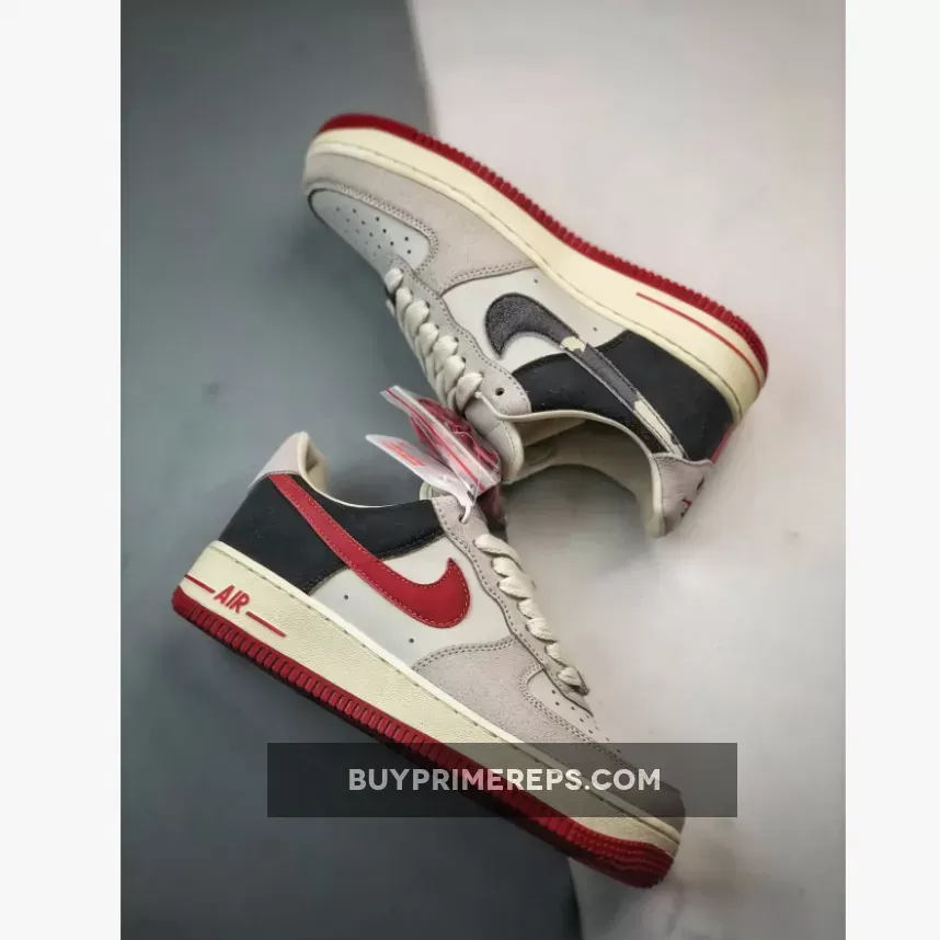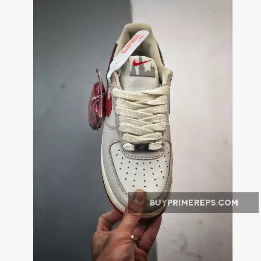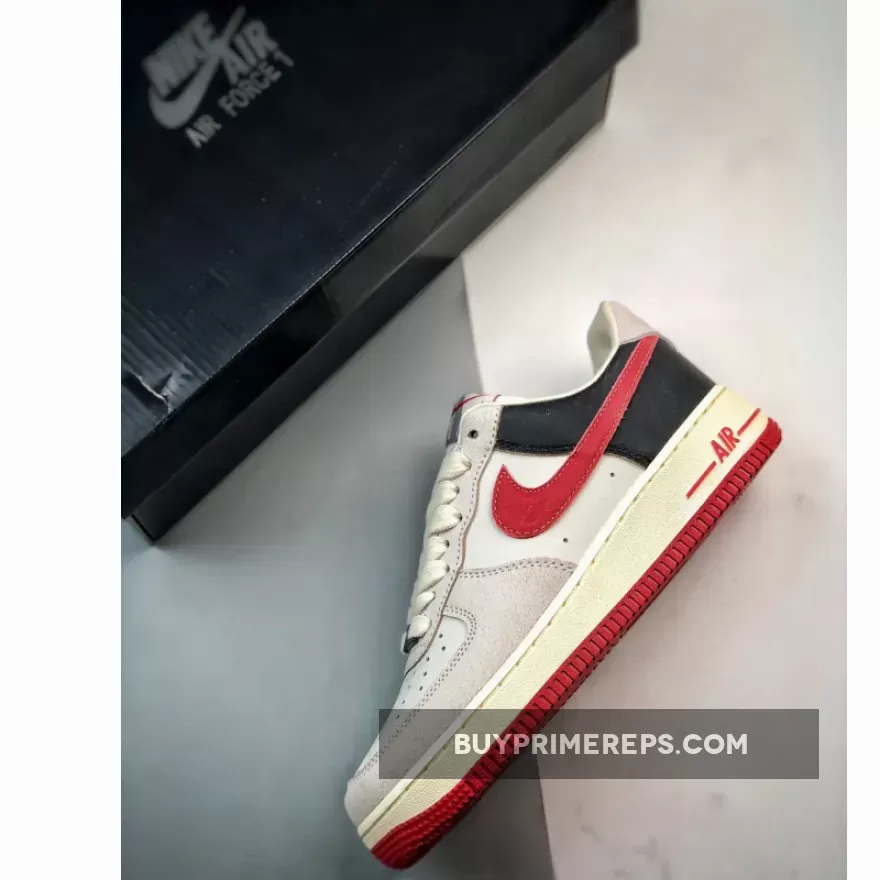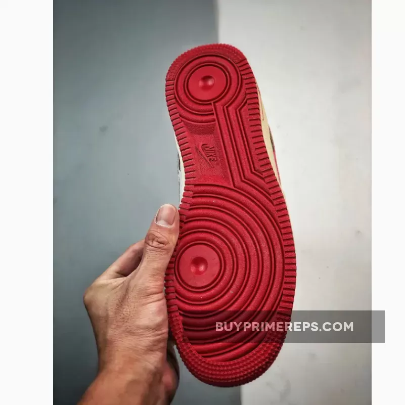 The midsole of the Air Force 1 ’07 “Chicago” is yellowed and aged, giving it a vintage appearance. The outsole is red, adding a bold contrast to the overall color scheme. Cream laces complete the look, tying the shoe together in a stylish and cohesive manner.