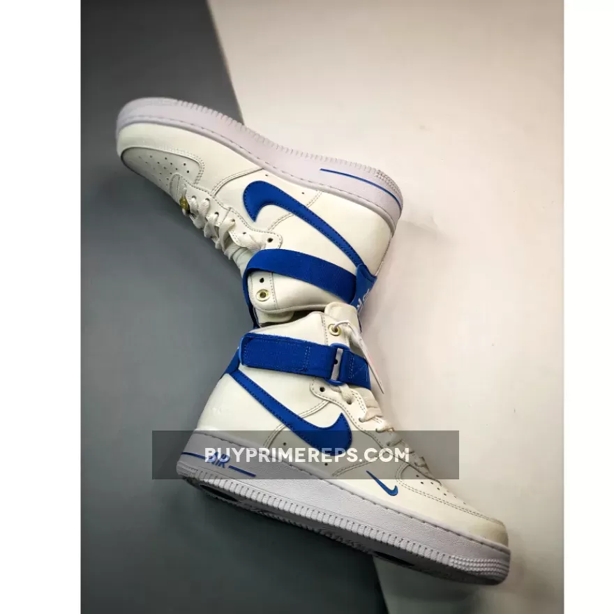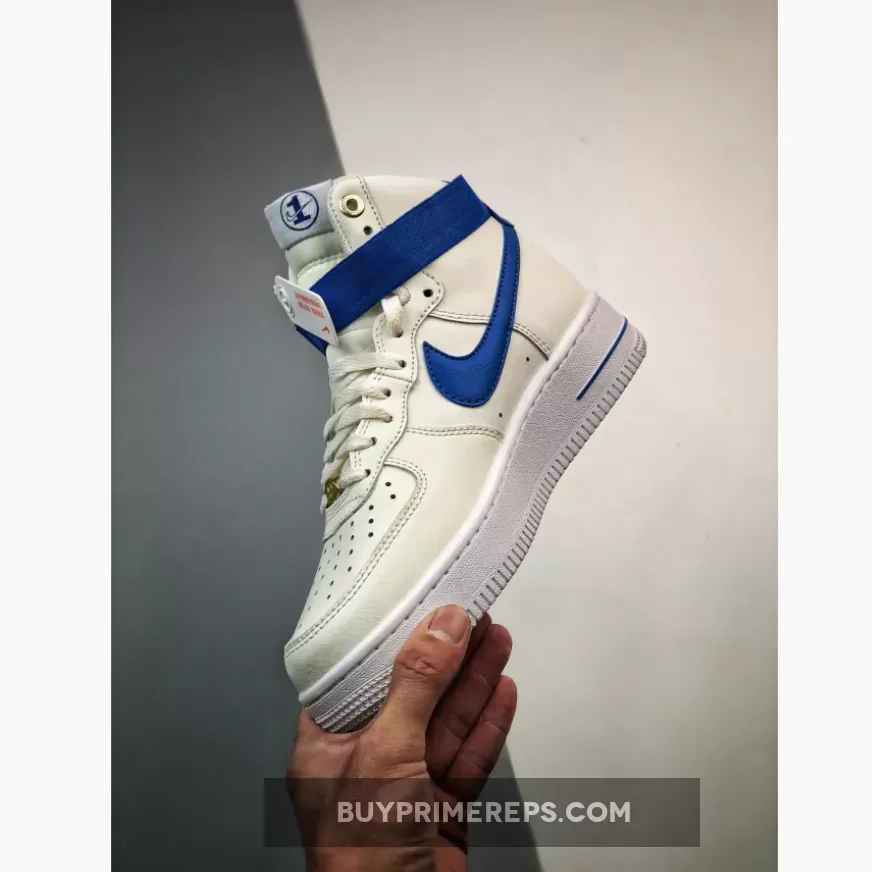 The Nike Air Force 1 High Since 82 White Blue DQ7584-100 is punctuated with luxurious golden details, including the top eyelet and the metallic lace deubrés, adding a touch of opulence to the design. The shoe is completed with an immaculate white sole unit, providing a crisp and cohesive finish to the overall look.
